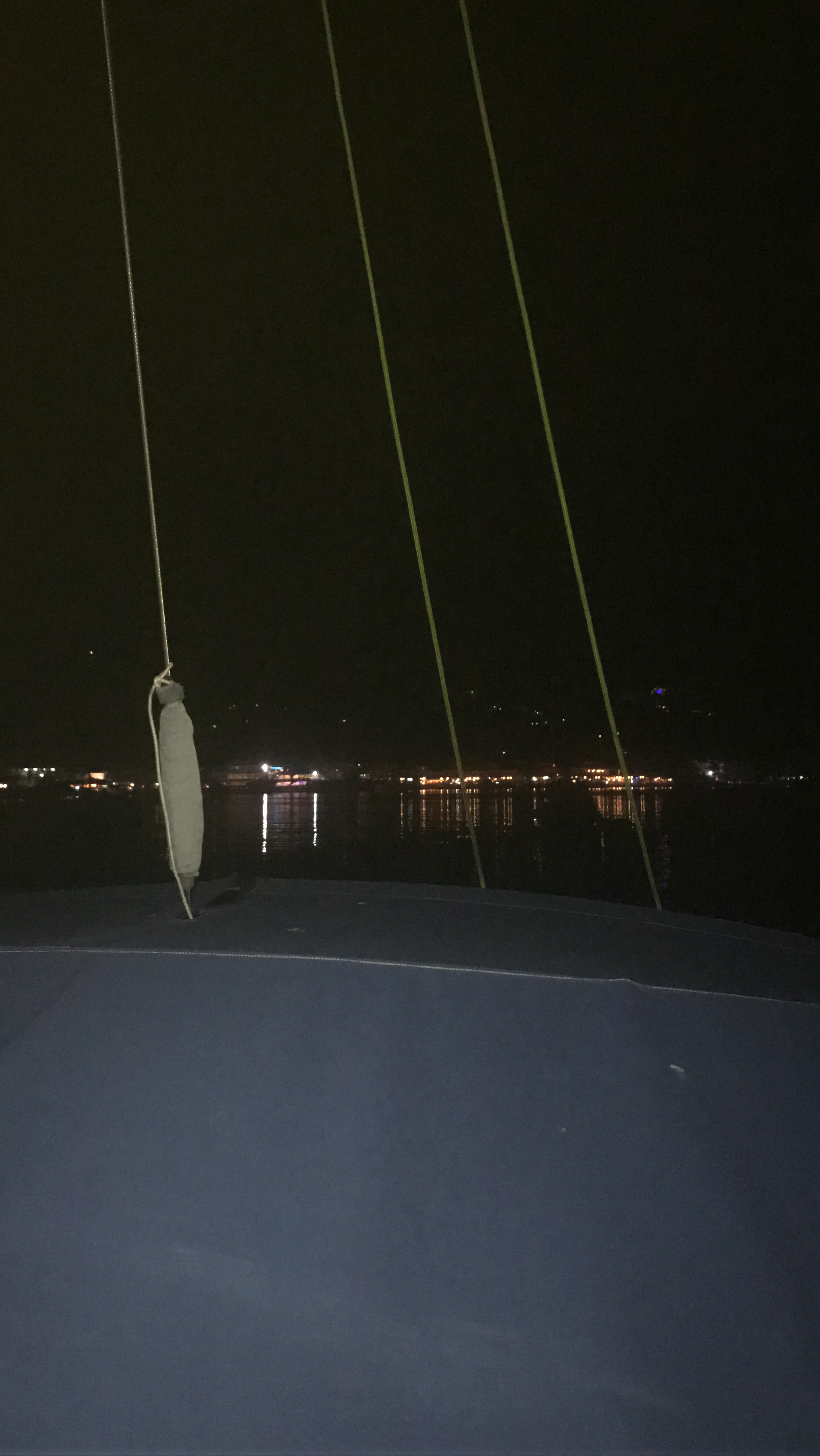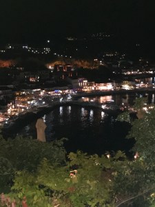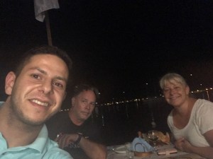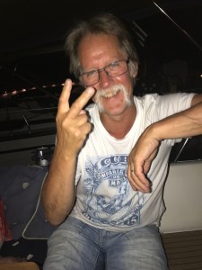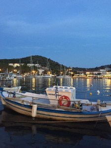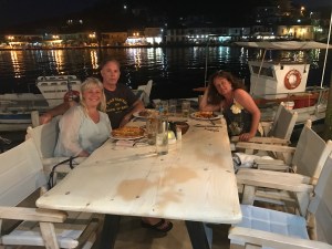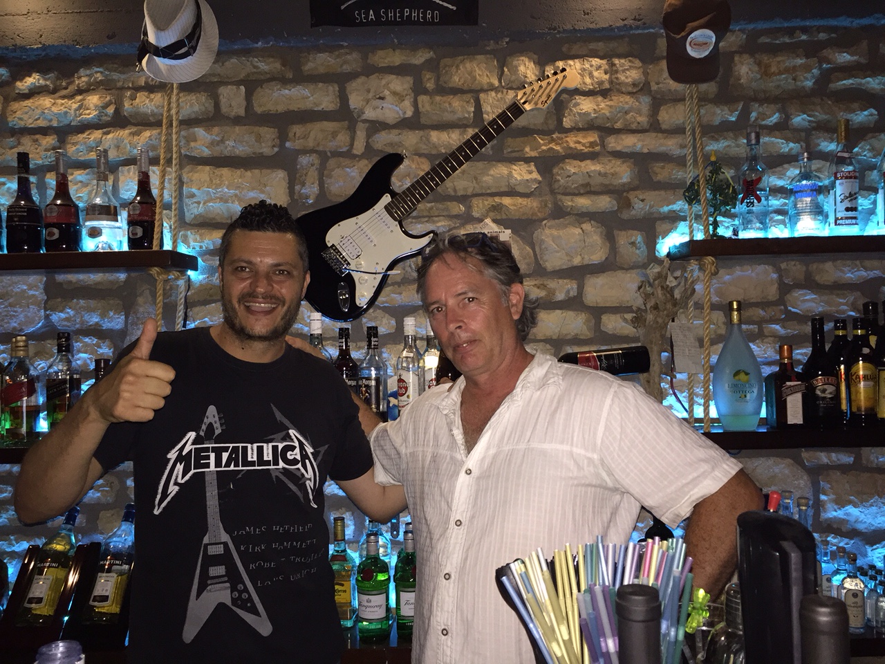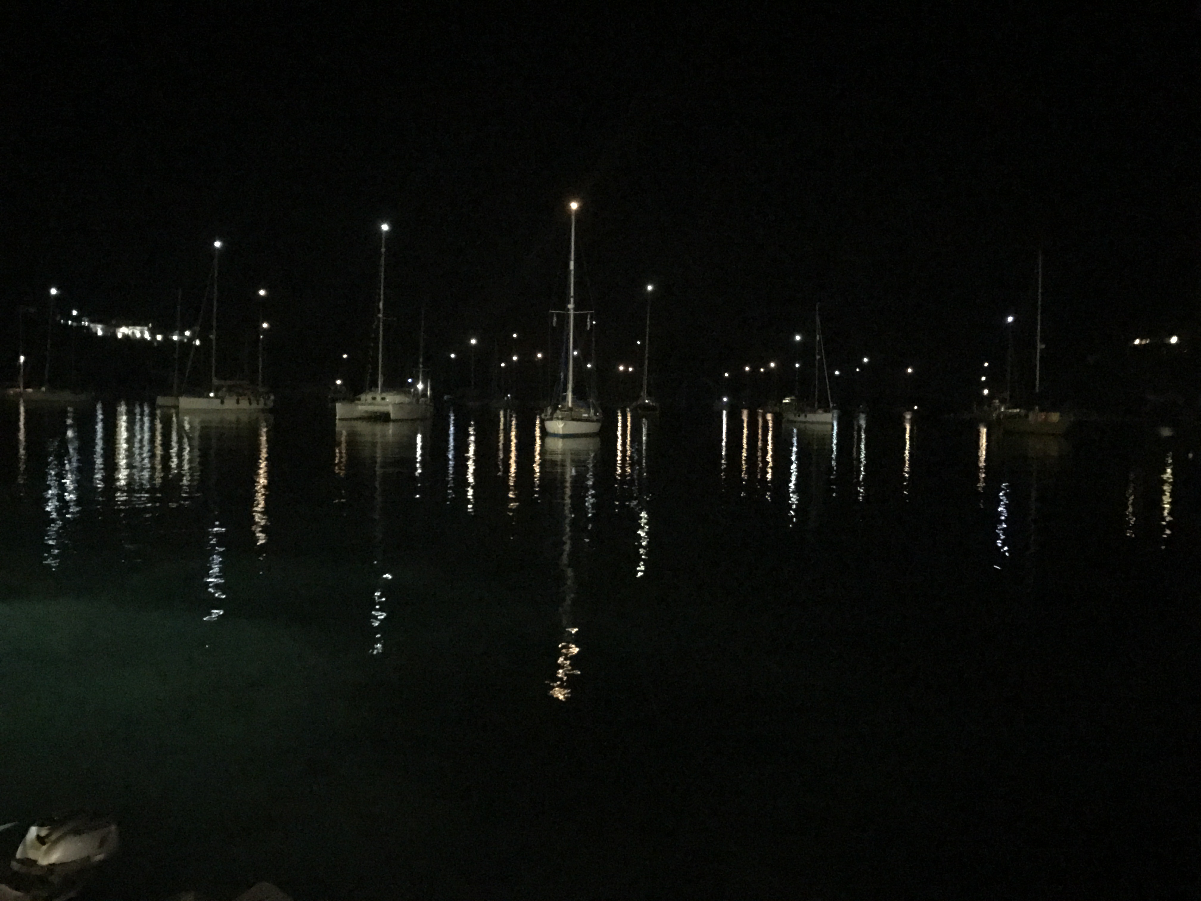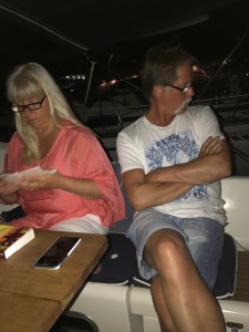 Väl tillbaka i båten tog Carina sin sedvanliga mediationstimme på fördäck med vatten och Novaluzid. Fram mot kvällen lagade Göran en god pastarätt som intogs i sittbrunn och sköljdes ner med rödvin och vatten. Sedan var det dags för ett kärt återseende när vi tog gummibåten (som nu hade läckt en hel del luft) in till land och tog en drink hos Alex och Elena. Alex fick en t-shirt med Åstadens poporkester. Den gick han omkring med hela kvällen, spelade ”Något han glömt” i baren och talade om för alla att det var hans vän som skrivit låten och att bandet heter Åstadens poporkester. Göran fick med andra ord, en egoboost som heter duga. Skön kväll i goda vänners sällskap med en ljummen vind som fläktar, kan man ha det bättre?