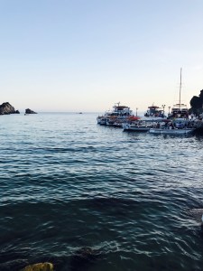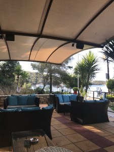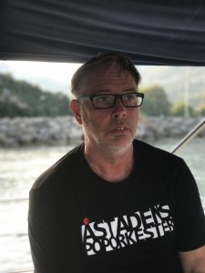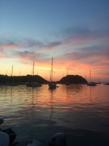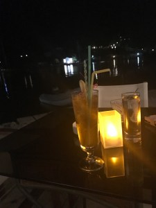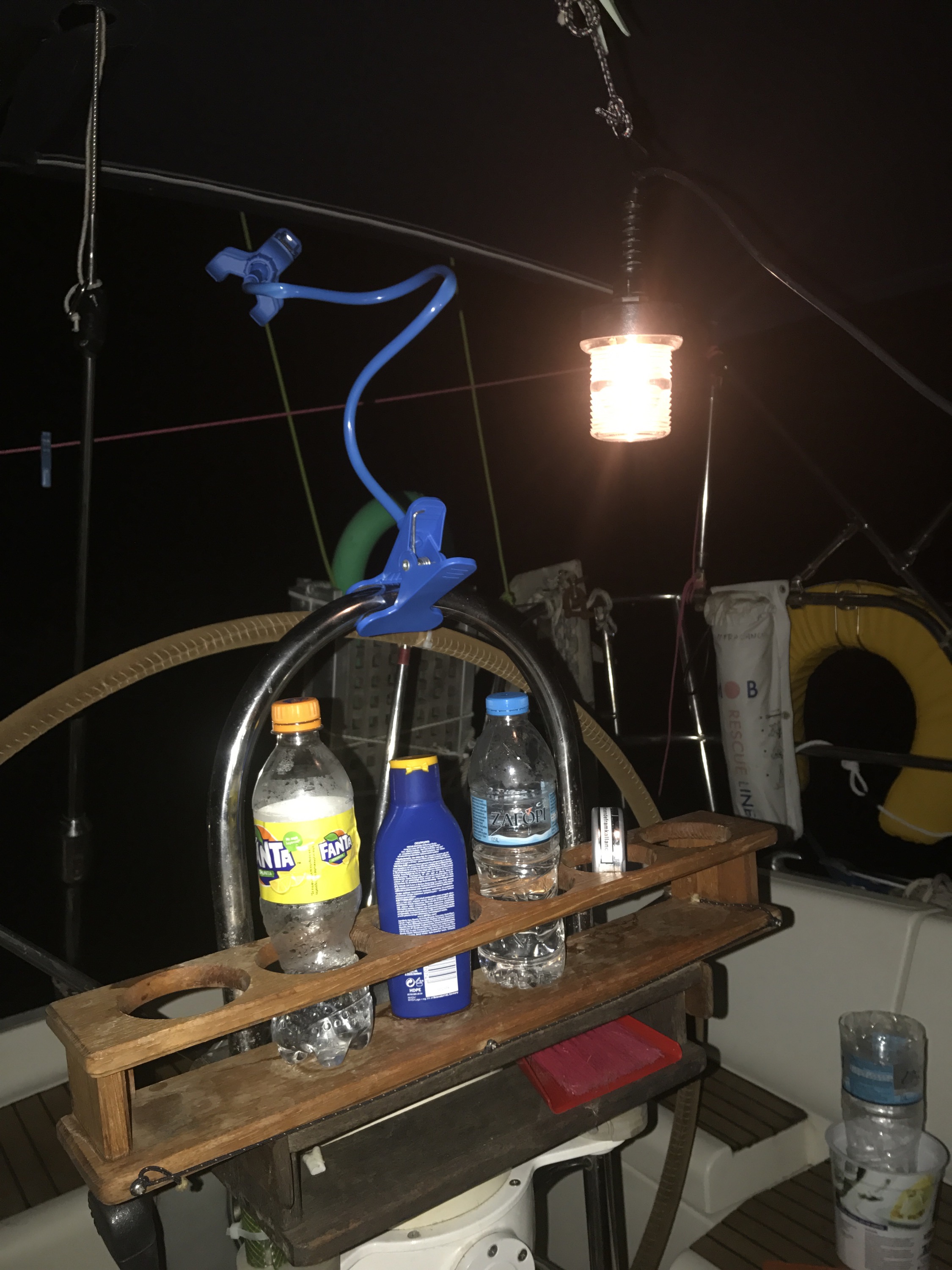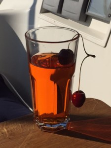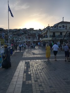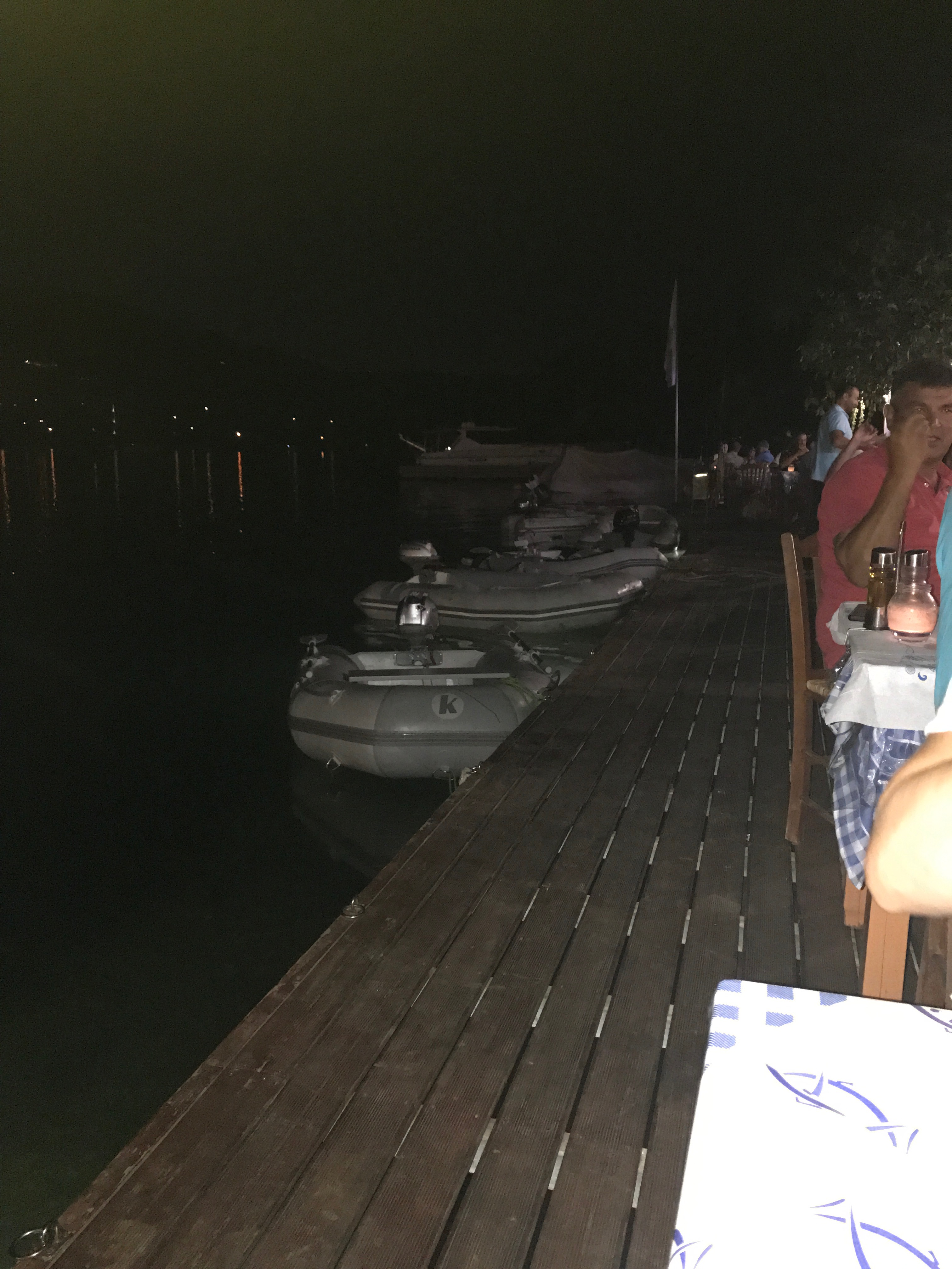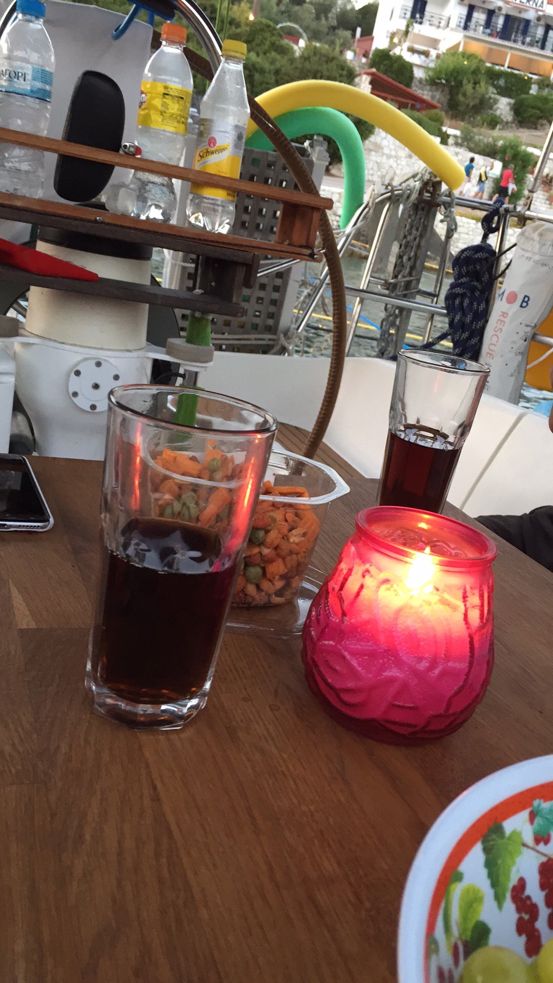 Väl tillbaka i båten tog Carina sin sedvanliga mediationstimme på fördäck med vatten och Novaluzid. Fram mot kvällen lagade Göran en god pastarätt som intogs i sittbrunn och sköljdes ner med rödvin och vatten. Sedan var det dags för ett kärt återseende när vi tog gummibåten (som nu hade läckt en hel del luft) in till land och tog en drink hos Alex och Elena. Alex fick en t-shirt med Åstadens poporkester. Den gick han omkring med hela kvällen, spelade ”Något han glömt” i baren och talade om för alla att det var hans vän som skrivit låten och att bandet heter Åstadens poporkester. Göran fick med andra ord, en egoboost som heter duga. Skön kväll i goda vänners sällskap med en ljummen vind som fläktar, kan man ha det bättre?