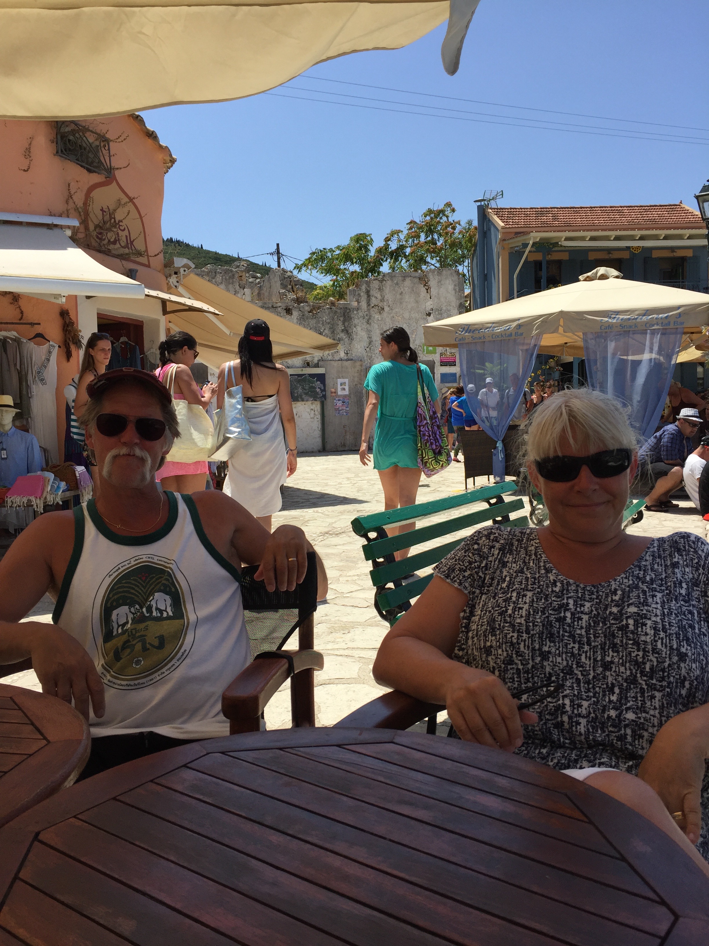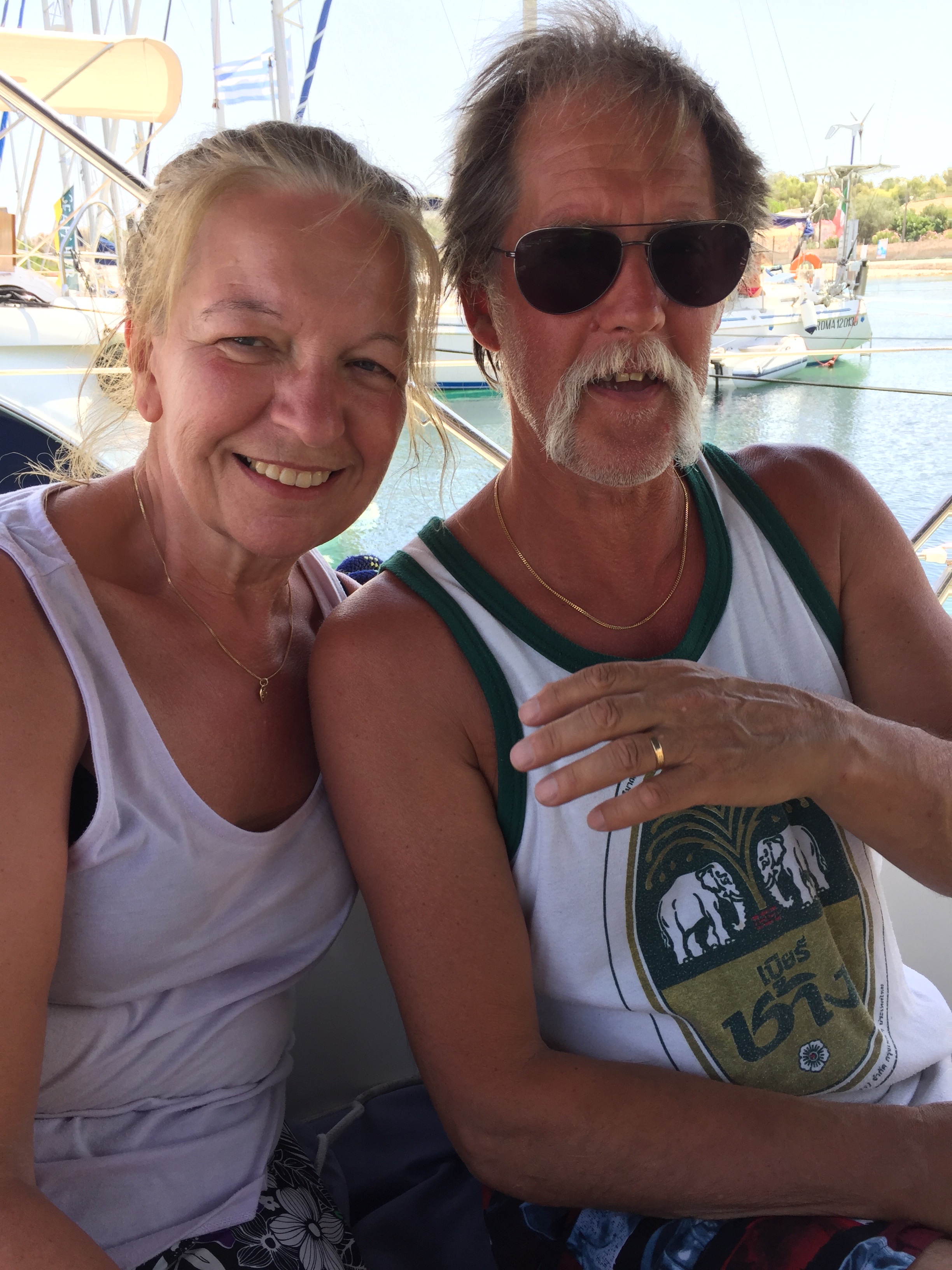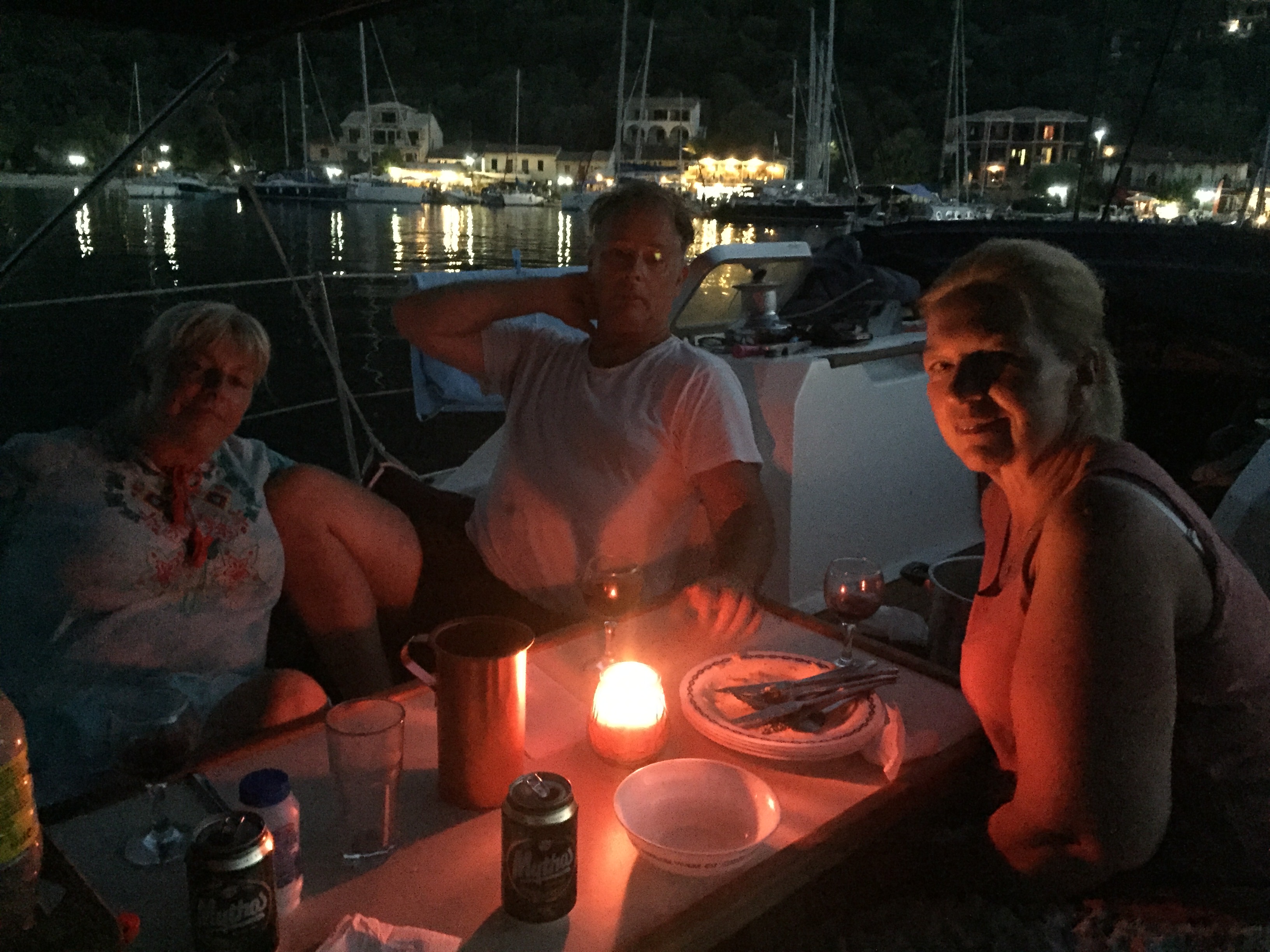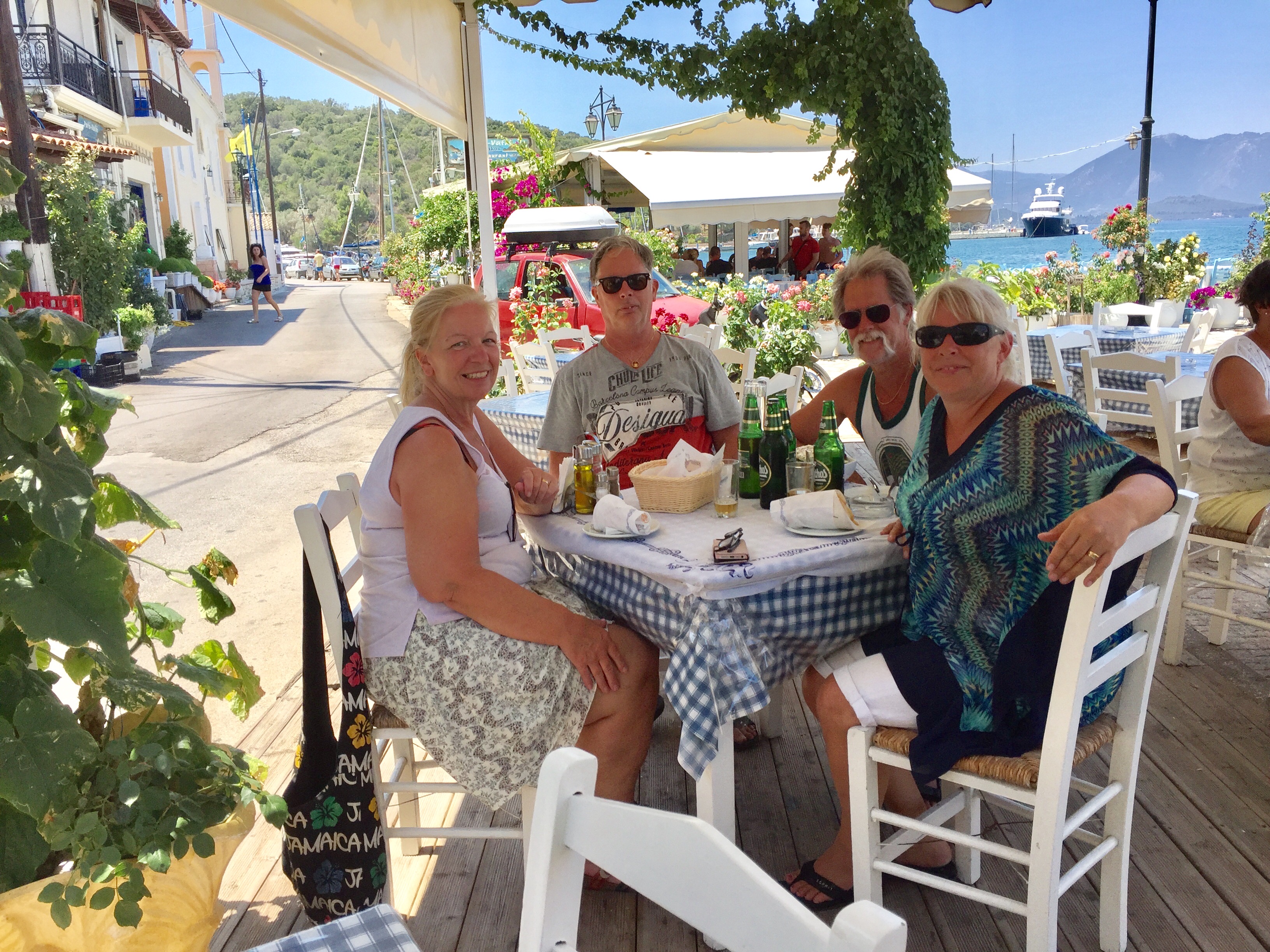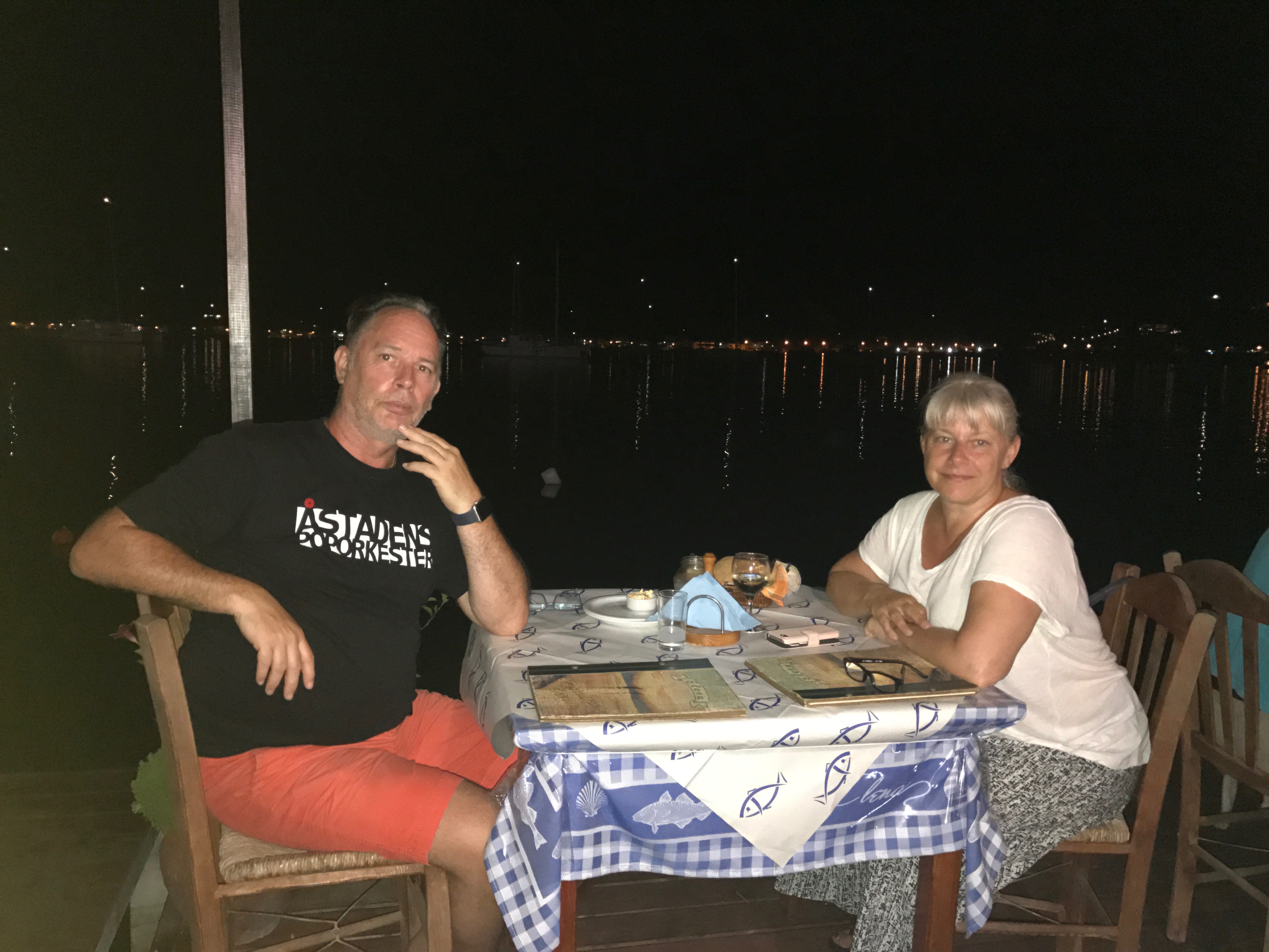 Vi städade toaletter och salong direkt vi vaknade och sedan blev det ett snabbdopp, följt av dusch med hårtvätt och allmän hygienisk rengöring innan vi drog upp ankaret och begav oss in mot kajen. Vi hittade en bra plats bredvid de stora turbåtarna där vi legat tidigare. Vi backade in och fick konstigt nog be om hjälp med linorna av en italienare trots att han stod och tittade precis när vi kom in. Vi lade till och klev i land för att köpa lite prosecco inför kvällen. Det är vår 17-åriga bröllopsdag och dessutom tänkte vi hälsa de nya delägarna välkomna ombord. Det blev en sen och lyxig frukost på Ikaros. Den lilla baren i närheten av båten. Sedan gick vi tillbaka till båten och plockade ut lite, vi städade i sittbrunn och gjorde fint. En mycket varm dag och det var fortfarande tidigt så vi bestämde oss för att leta rätt på en poolbar och spendera eftermiddagen där. Medan vi höll på kom svenskregistrerade Svea in och ville lägga till. De blev bortmotade av en liten arg grekisk gubbe och då sa vi att de kunde lägga till på andra sidan om oss eftersom en engelsk båt nyligen gått därifrån. Så blev det, även om den lilla gubben gastade och skrek även denna gång. Ibland får man låtsas vara oförstående och låta det bero. Vi hjälpte dem med linorna och sedan gick vi bort till Yannis poolbar. Poolen var egentligen till för hotellets gäster, men vi såg väl så desperata ut att tjejen i baren förbarmade sig över oss och lät oss få en plats så vi kunde bada. Vi tog ett par drinkar och spenderade några timmar vid poolkanten innan vi gick iväg och handlade frukost till nästkommande morgon. Vi satt länge och pratade med grannarna i Svea när vi kom tillbaka till sittbrunnen. Sedan var det dags att göra sig i ordning för kvällen. Sveas besättning; Jan och Ann-Sofie bjöd över oss på en drink, men vi ville ju skåla för oss och vår bröllopsdag, men lovade att komma över så snart det var överstökat. Det tog cirka 5 minuter och sedan kom vi med den öppnade proseccon i högsta hugg. Vi hade en trevlig pratstund och fick mycket tips. Det visade sig att de kände Tommy som vi träffade 2014 i Nidri och hade sällskap av ett par dagar. De berättade att Tommy hastigt gått bort i augusti 2015, sorgligt. Vi har pratat om honom flera gånger och undrat vart han blev av. Så småningom gick vi tillbaka till Fragancia och gjorde klart för att ta emot Kid och Barbro. Idag den 8 juli 2017 mönstrar vi formellt av från Fragancia och Kid och Barbro mönstrar på och tar över i fyra veckor. De har dock varit vänliga nog att be oss vara med en vecka, vilket vi förstås med glädje accepterat. Klockan 22.15 anlände dem med sin packning. Vi tog emot med ytterligare en flaska prosecco och tända ljus i en hyfsat välstädad sittbrunn. Sedan bar det av till Maistrali för en mycket sen middag. Gott och trevligt som vanligt. Strax efter kl. 01.00 var vi tillbaka på Ikaros och det blev long island ice tea för männen och mojito för kvinnorna innan vi lullade tillbaka till Fragancia en dryg timme senare. Någon smart person föreslog att vi skulle ta en sängfösare i sittbrunn innan vi gick och lade oss och det slutade med att Barbro och Katarina gav upp och kröp till kojs vid 03.00 med Kid och Göran tog det sista i ginflaskan och kom i säng rund 03.30-tiden.