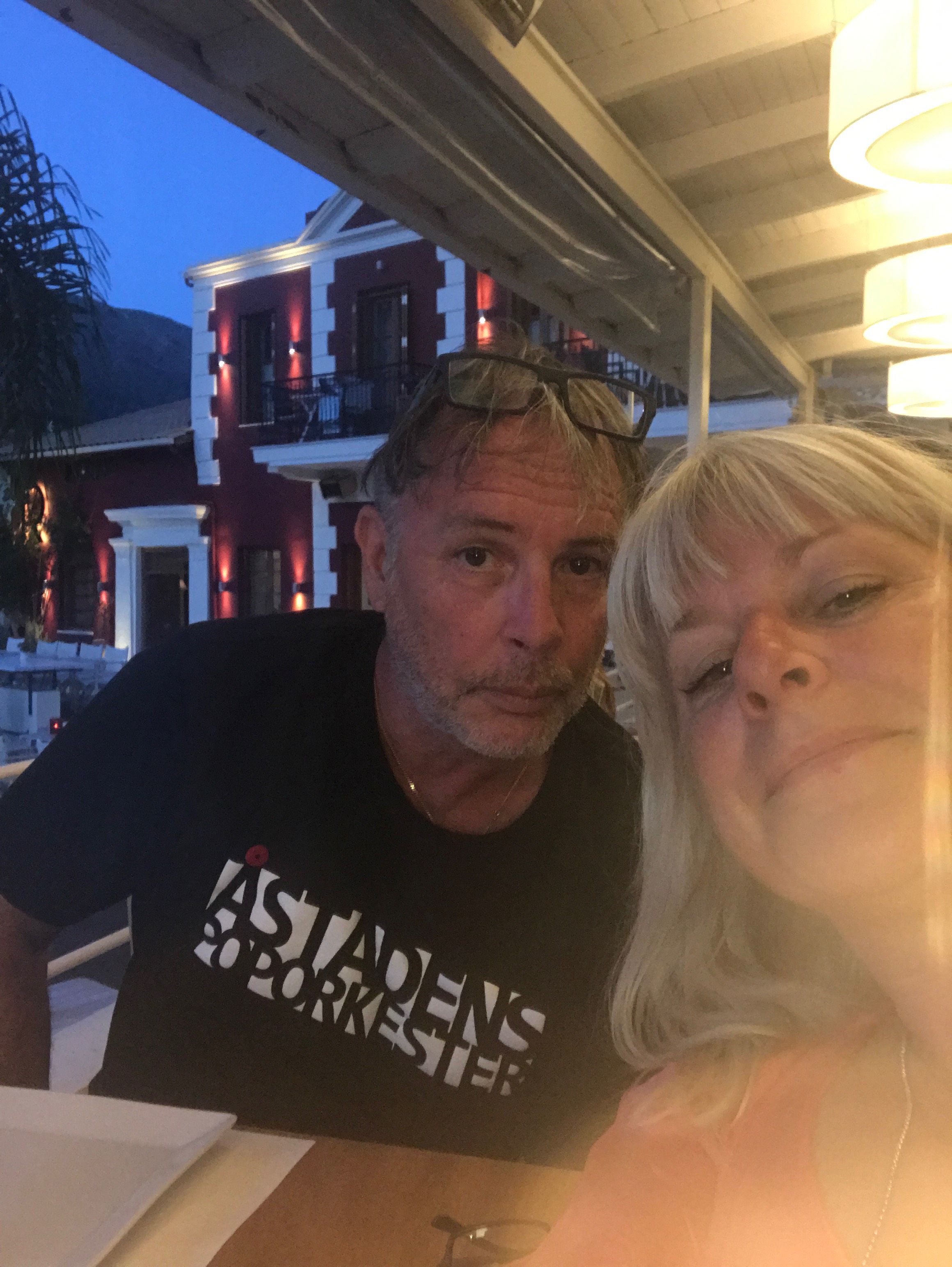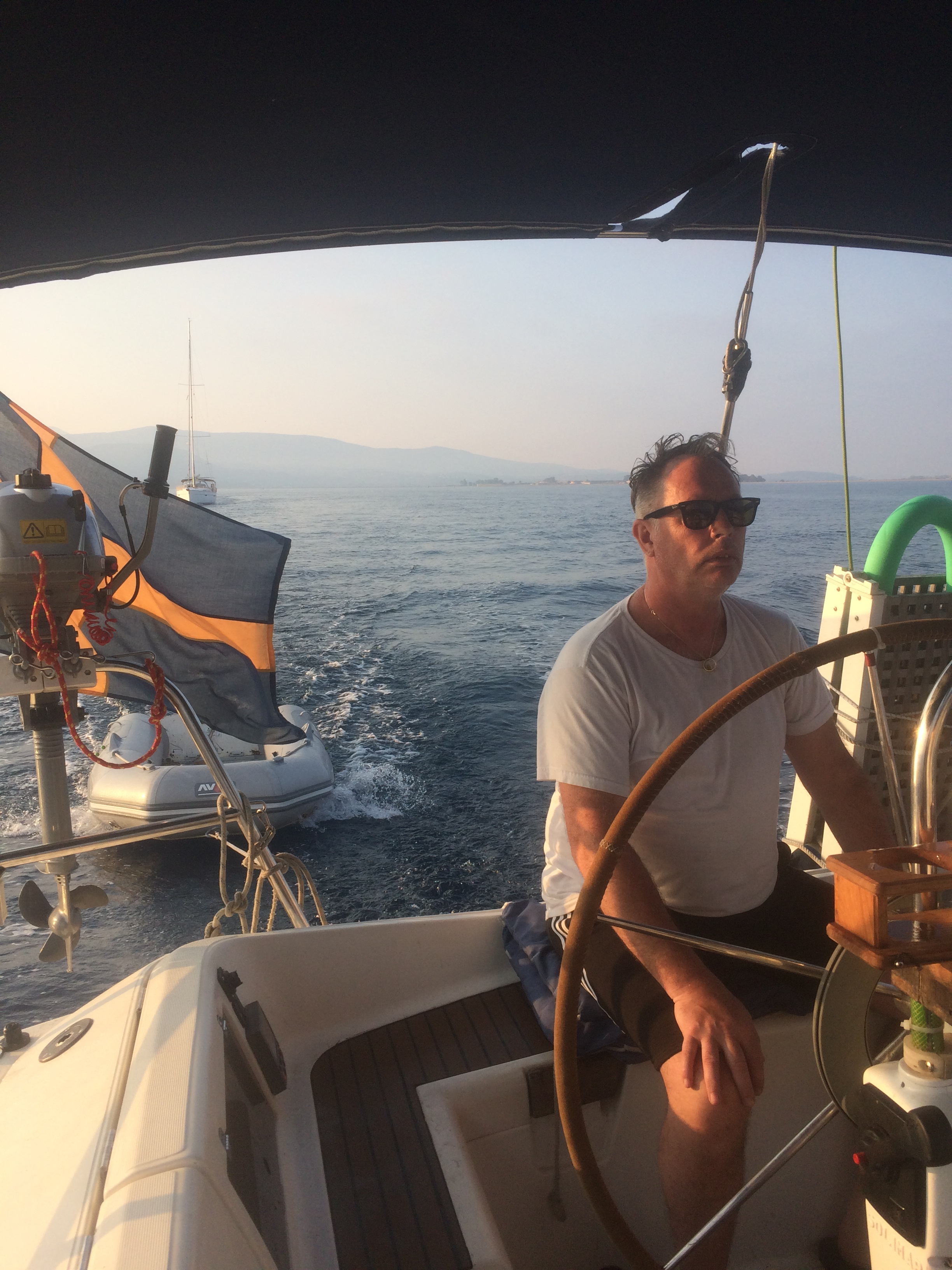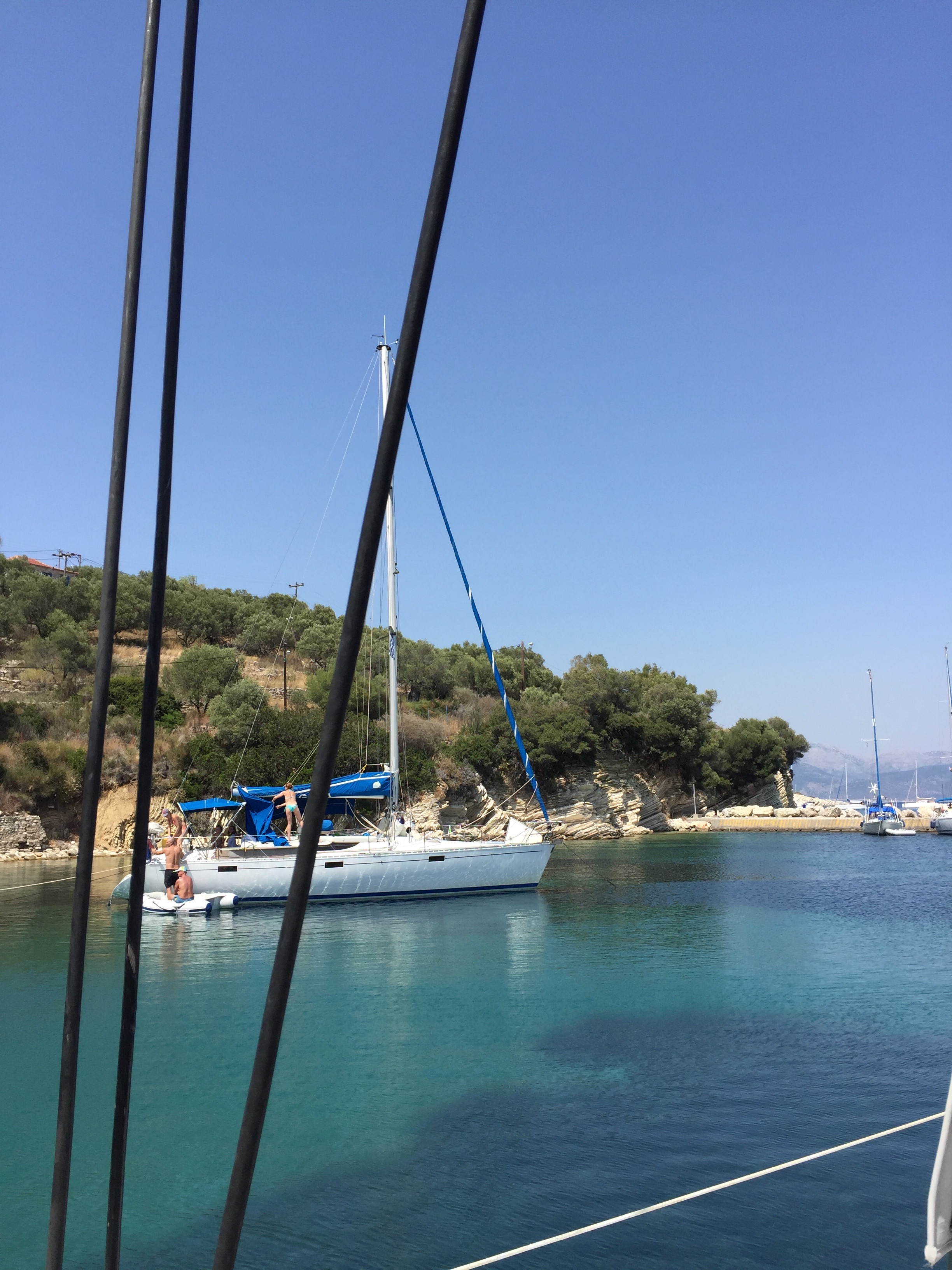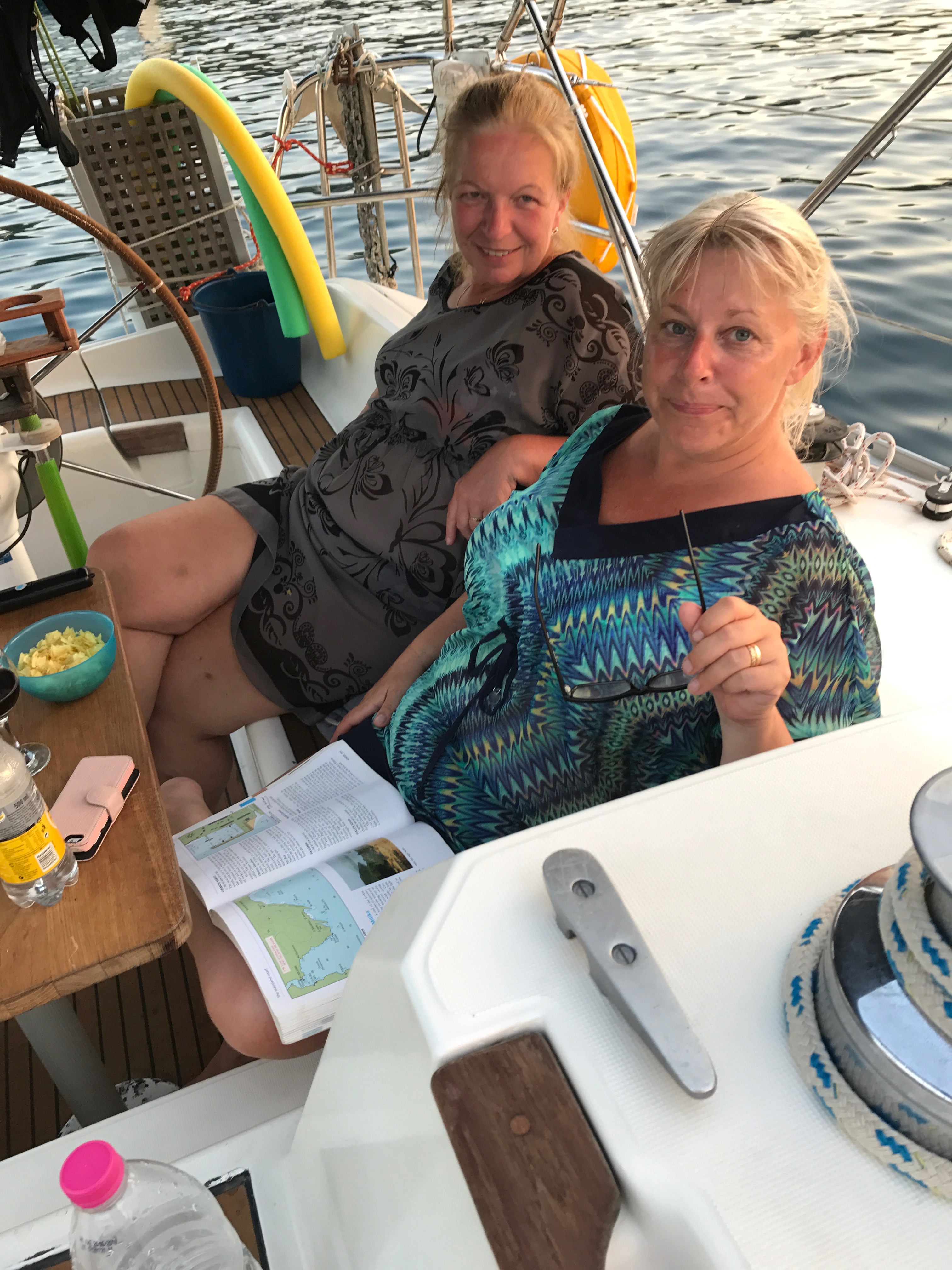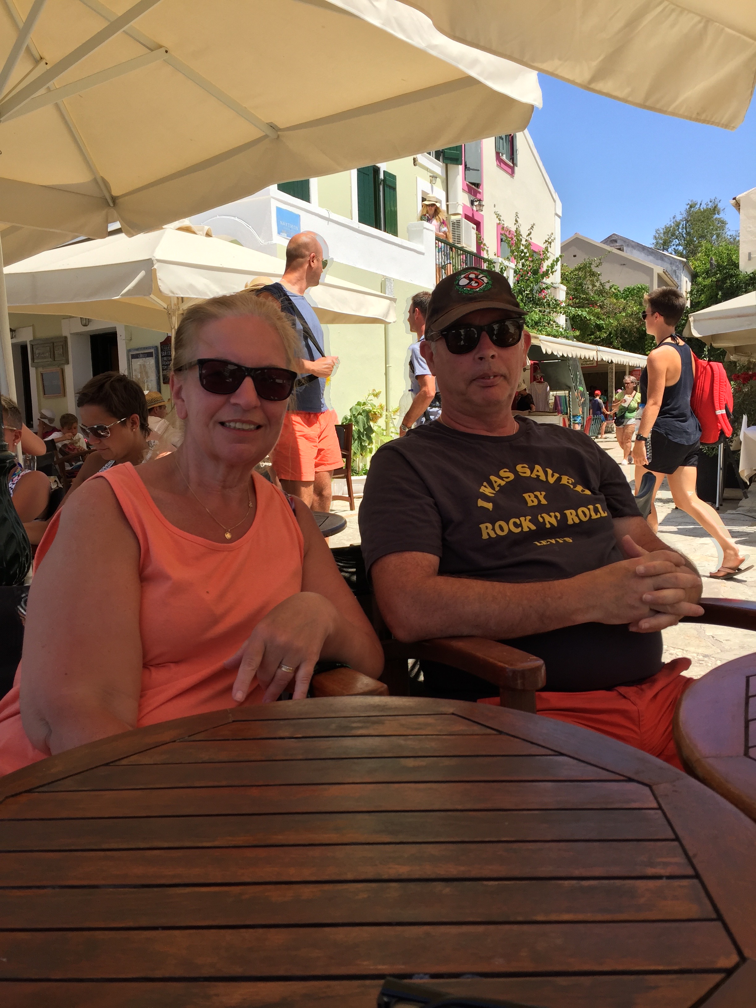 Vi städade toaletter och salong direkt vi vaknade och sedan blev det ett snabbdopp, följt av dusch med hårtvätt och allmän hygienisk rengöring innan vi drog upp ankaret och begav oss in mot kajen. Vi hittade en bra plats bredvid de stora turbåtarna där vi legat tidigare. Vi backade in och fick konstigt nog be om hjälp med linorna av en italienare trots att han stod och tittade precis när vi kom in. Vi lade till och klev i land för att köpa lite prosecco inför kvällen. Det är vår 17-åriga bröllopsdag och dessutom tänkte vi hälsa de nya delägarna välkomna ombord. Det blev en sen och lyxig frukost på Ikaros. Den lilla baren i närheten av båten. Sedan gick vi tillbaka till båten och plockade ut lite, vi städade i sittbrunn och gjorde fint. En mycket varm dag och det var fortfarande tidigt så vi bestämde oss för att leta rätt på en poolbar och spendera eftermiddagen där. Medan vi höll på kom svenskregistrerade Svea in och ville lägga till. De blev bortmotade av en liten arg grekisk gubbe och då sa vi att de kunde lägga till på andra sidan om oss eftersom en engelsk båt nyligen gått därifrån. Så blev det, även om den lilla gubben gastade och skrek även denna gång. Ibland får man låtsas vara oförstående och låta det bero. Vi hjälpte dem med linorna och sedan gick vi bort till Yannis poolbar. Poolen var egentligen till för hotellets gäster, men vi såg väl så desperata ut att tjejen i baren förbarmade sig över oss och lät oss få en plats så vi kunde bada. Vi tog ett par drinkar och spenderade några timmar vid poolkanten innan vi gick iväg och handlade frukost till nästkommande morgon. Vi satt länge och pratade med grannarna i Svea när vi kom tillbaka till sittbrunnen. Sedan var det dags att göra sig i ordning för kvällen. Sveas besättning; Jan och Ann-Sofie bjöd över oss på en drink, men vi ville ju skåla för oss och vår bröllopsdag, men lovade att komma över så snart det var överstökat. Det tog cirka 5 minuter och sedan kom vi med den öppnade proseccon i högsta hugg. Vi hade en trevlig pratstund och fick mycket tips. Det visade sig att de kände Tommy som vi träffade 2014 i Nidri och hade sällskap av ett par dagar. De berättade att Tommy hastigt gått bort i augusti 2015, sorgligt. Vi har pratat om honom flera gånger och undrat vart han blev av. Så småningom gick vi tillbaka till Fragancia och gjorde klart för att ta emot Kid och Barbro. Idag den 8 juli 2017 mönstrar vi formellt av från Fragancia och Kid och Barbro mönstrar på och tar över i fyra veckor. De har dock varit vänliga nog att be oss vara med en vecka, vilket vi förstås med glädje accepterat. Klockan 22.15 anlände dem med sin packning. Vi tog emot med ytterligare en flaska prosecco och tända ljus i en hyfsat välstädad sittbrunn. Sedan bar det av till Maistrali för en mycket sen middag. Gott och trevligt som vanligt. Strax efter kl. 01.00 var vi tillbaka på Ikaros och det blev long island ice tea för männen och mojito för kvinnorna innan vi lullade tillbaka till Fragancia en dryg timme senare. Någon smart person föreslog att vi skulle ta en sängfösare i sittbrunn innan vi gick och lade oss och det slutade med att Barbro och Katarina gav upp och kröp till kojs vid 03.00 med Kid och Göran tog det sista i ginflaskan och kom i säng rund 03.30-tiden.