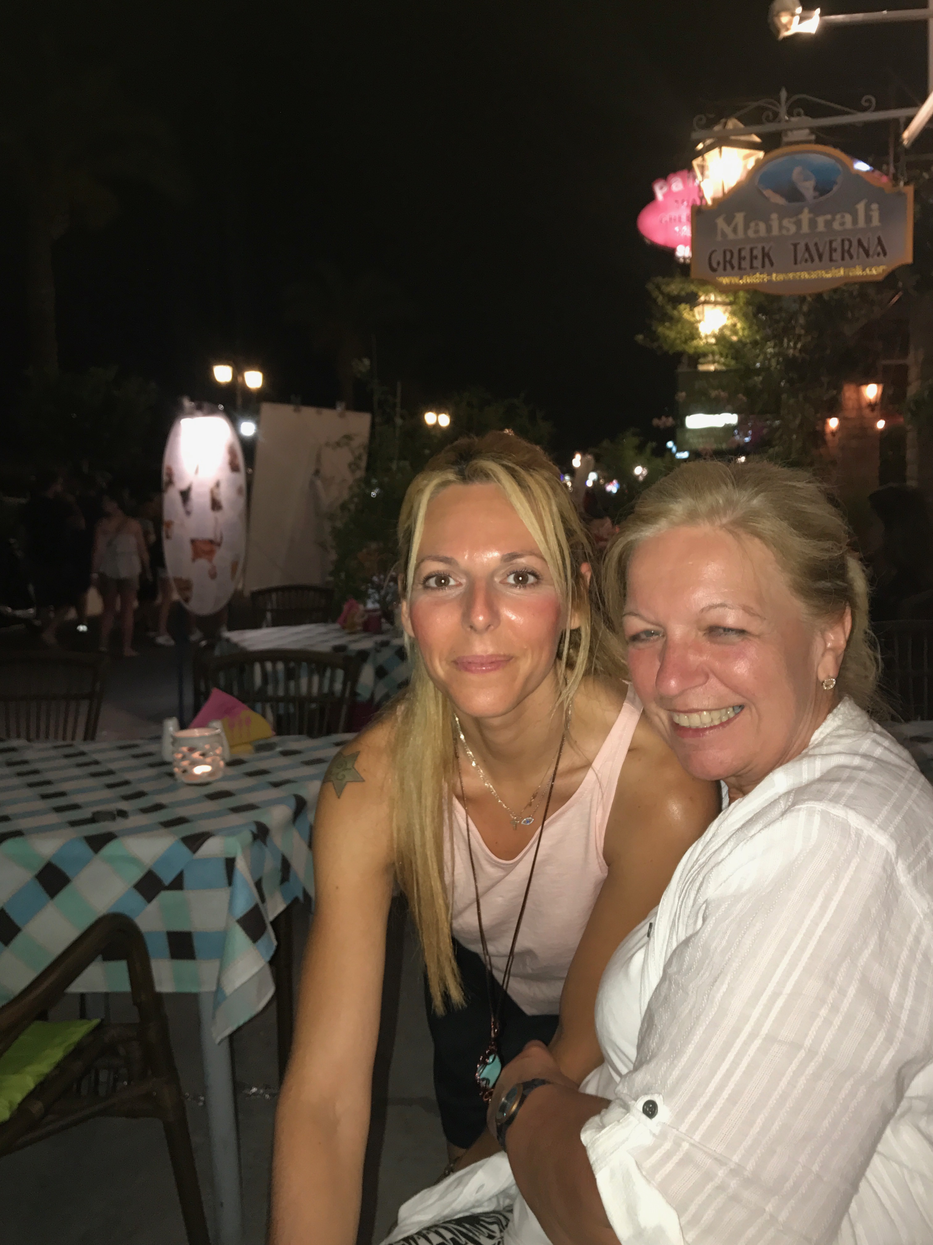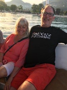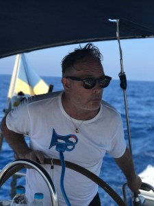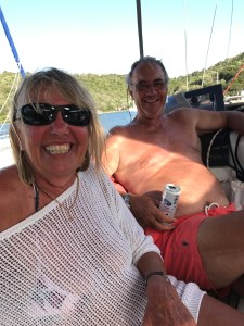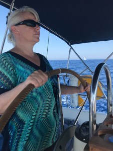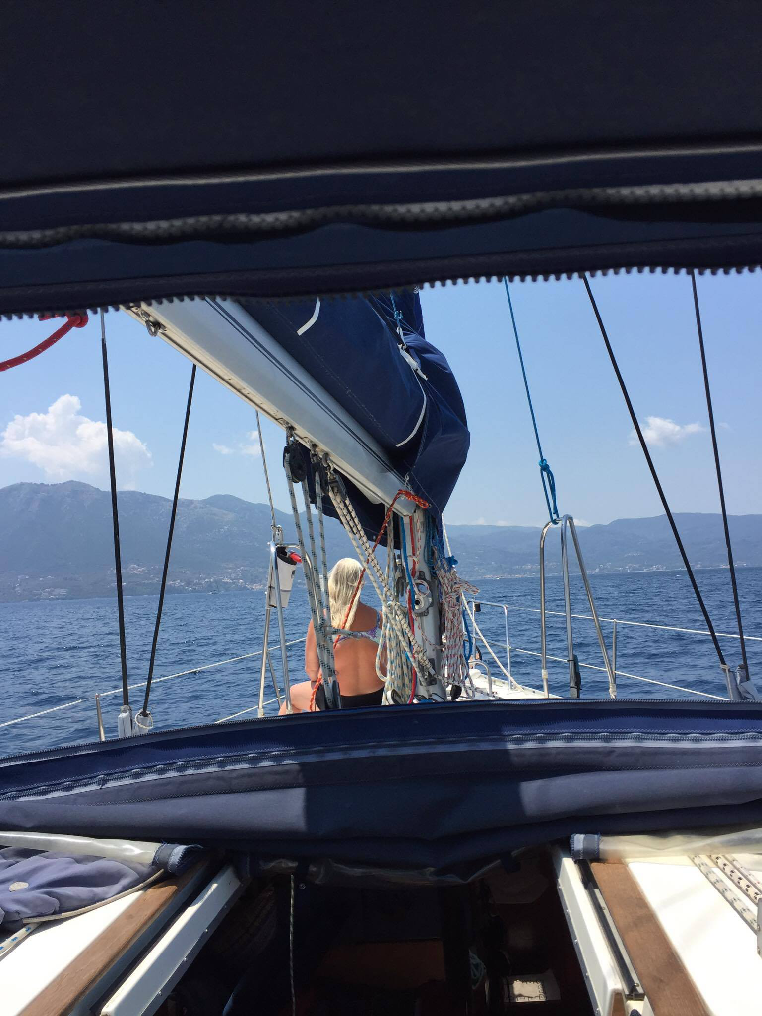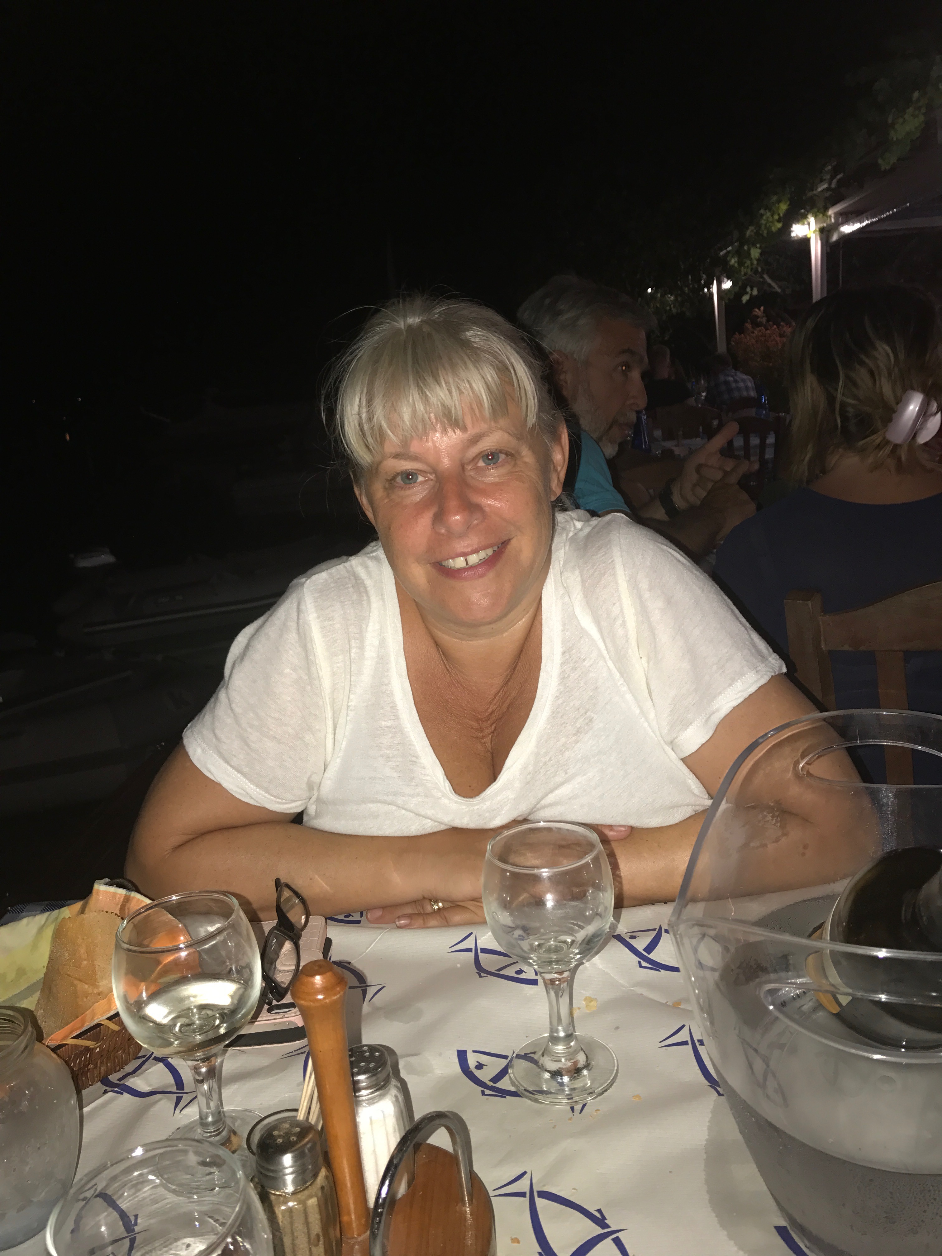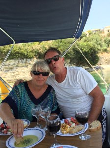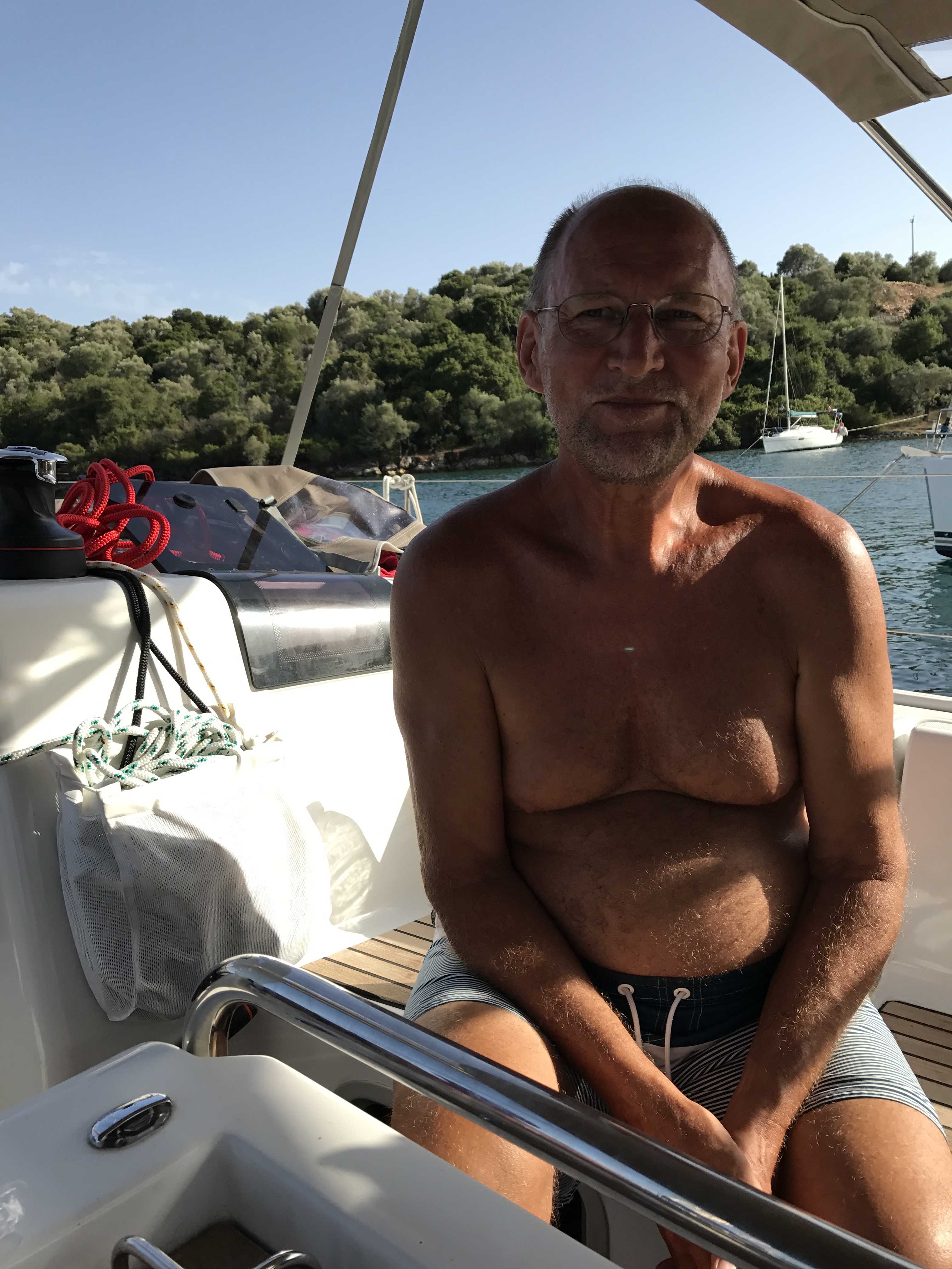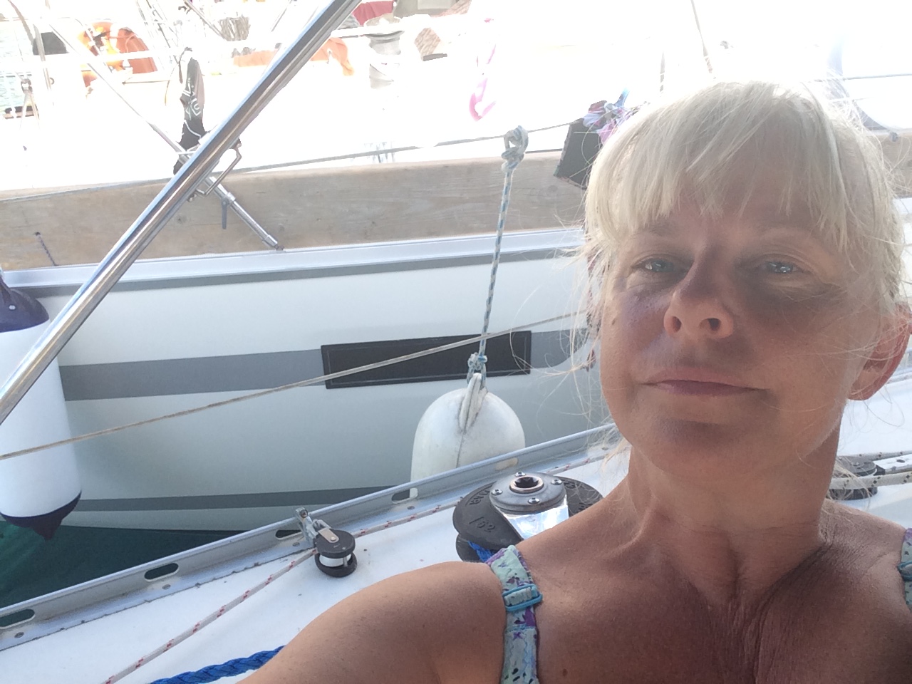 Vi städade toaletter och salong direkt vi vaknade och sedan blev det ett snabbdopp, följt av dusch med hårtvätt och allmän hygienisk rengöring innan vi drog upp ankaret och begav oss in mot kajen. Vi hittade en bra plats bredvid de stora turbåtarna där vi legat tidigare. Vi backade in och fick konstigt nog be om hjälp med linorna av en italienare trots att han stod och tittade precis när vi kom in. Vi lade till och klev i land för att köpa lite prosecco inför kvällen. Det är vår 17-åriga bröllopsdag och dessutom tänkte vi hälsa de nya delägarna välkomna ombord. Det blev en sen och lyxig frukost på Ikaros. Den lilla baren i närheten av båten. Sedan gick vi tillbaka till båten och plockade ut lite, vi städade i sittbrunn och gjorde fint. En mycket varm dag och det var fortfarande tidigt så vi bestämde oss för att leta rätt på en poolbar och spendera eftermiddagen där. Medan vi höll på kom svenskregistrerade Svea in och ville lägga till. De blev bortmotade av en liten arg grekisk gubbe och då sa vi att de kunde lägga till på andra sidan om oss eftersom en engelsk båt nyligen gått därifrån. Så blev det, även om den lilla gubben gastade och skrek även denna gång. Ibland får man låtsas vara oförstående och låta det bero. Vi hjälpte dem med linorna och sedan gick vi bort till Yannis poolbar. Poolen var egentligen till för hotellets gäster, men vi såg väl så desperata ut att tjejen i baren förbarmade sig över oss och lät oss få en plats så vi kunde bada. Vi tog ett par drinkar och spenderade några timmar vid poolkanten innan vi gick iväg och handlade frukost till nästkommande morgon. Vi satt länge och pratade med grannarna i Svea när vi kom tillbaka till sittbrunnen. Sedan var det dags att göra sig i ordning för kvällen. Sveas besättning; Jan och Ann-Sofie bjöd över oss på en drink, men vi ville ju skåla för oss och vår bröllopsdag, men lovade att komma över så snart det var överstökat. Det tog cirka 5 minuter och sedan kom vi med den öppnade proseccon i högsta hugg. Vi hade en trevlig pratstund och fick mycket tips. Det visade sig att de kände Tommy som vi träffade 2014 i Nidri och hade sällskap av ett par dagar. De berättade att Tommy hastigt gått bort i augusti 2015, sorgligt. Vi har pratat om honom flera gånger och undrat vart han blev av. Så småningom gick vi tillbaka till Fragancia och gjorde klart för att ta emot Kid och Barbro. Idag den 8 juli 2017 mönstrar vi formellt av från Fragancia och Kid och Barbro mönstrar på och tar över i fyra veckor. De har dock varit vänliga nog att be oss vara med en vecka, vilket vi förstås med glädje accepterat. Klockan 22.15 anlände dem med sin packning. Vi tog emot med ytterligare en flaska prosecco och tända ljus i en hyfsat välstädad sittbrunn. Sedan bar det av till Maistrali för en mycket sen middag. Gott och trevligt som vanligt. Strax efter kl. 01.00 var vi tillbaka på Ikaros och det blev long island ice tea för männen och mojito för kvinnorna innan vi lullade tillbaka till Fragancia en dryg timme senare. Någon smart person föreslog att vi skulle ta en sängfösare i sittbrunn innan vi gick och lade oss och det slutade med att Barbro och Katarina gav upp och kröp till kojs vid 03.00 med Kid och Göran tog det sista i ginflaskan och kom i säng rund 03.30-tiden.