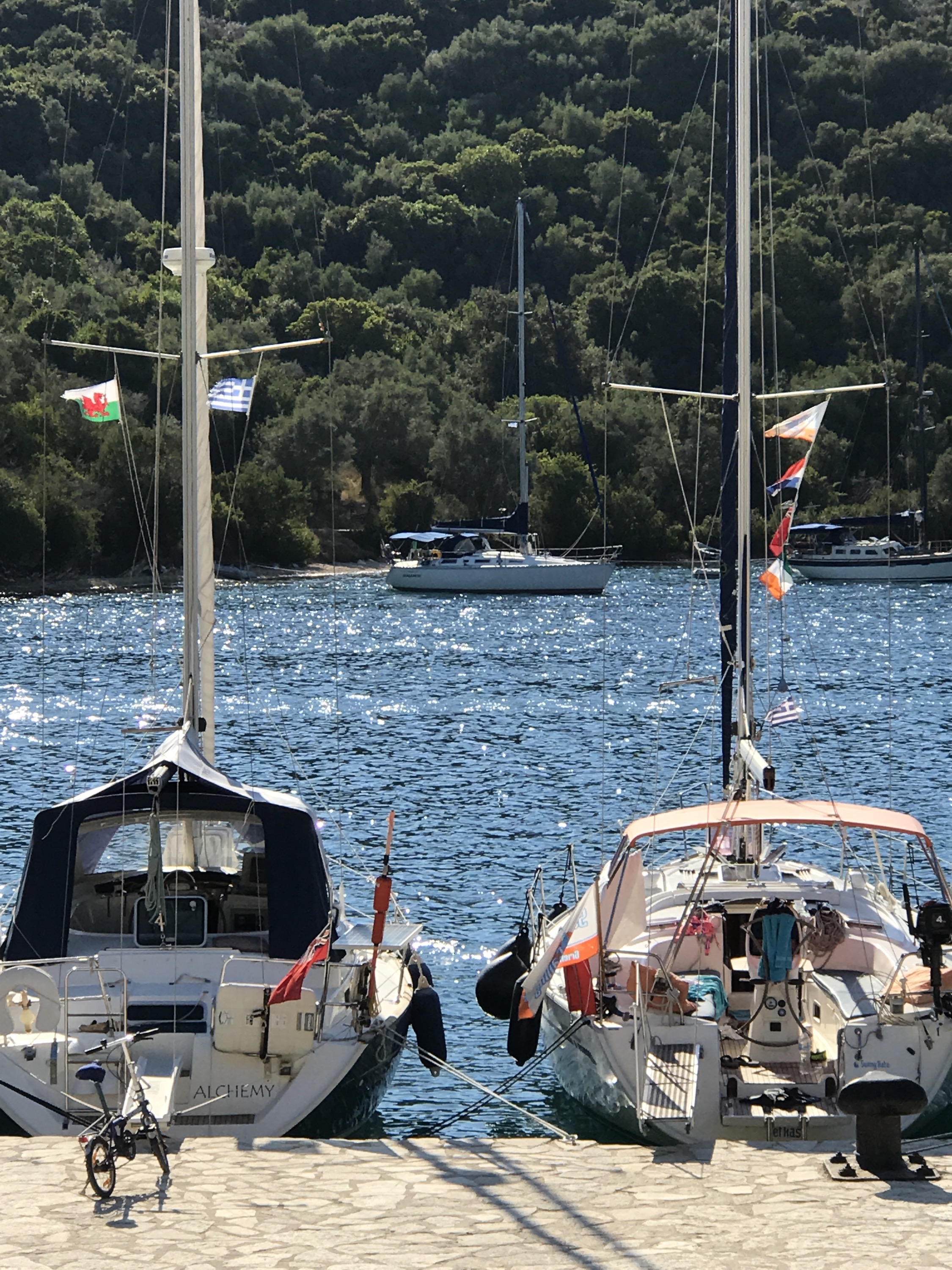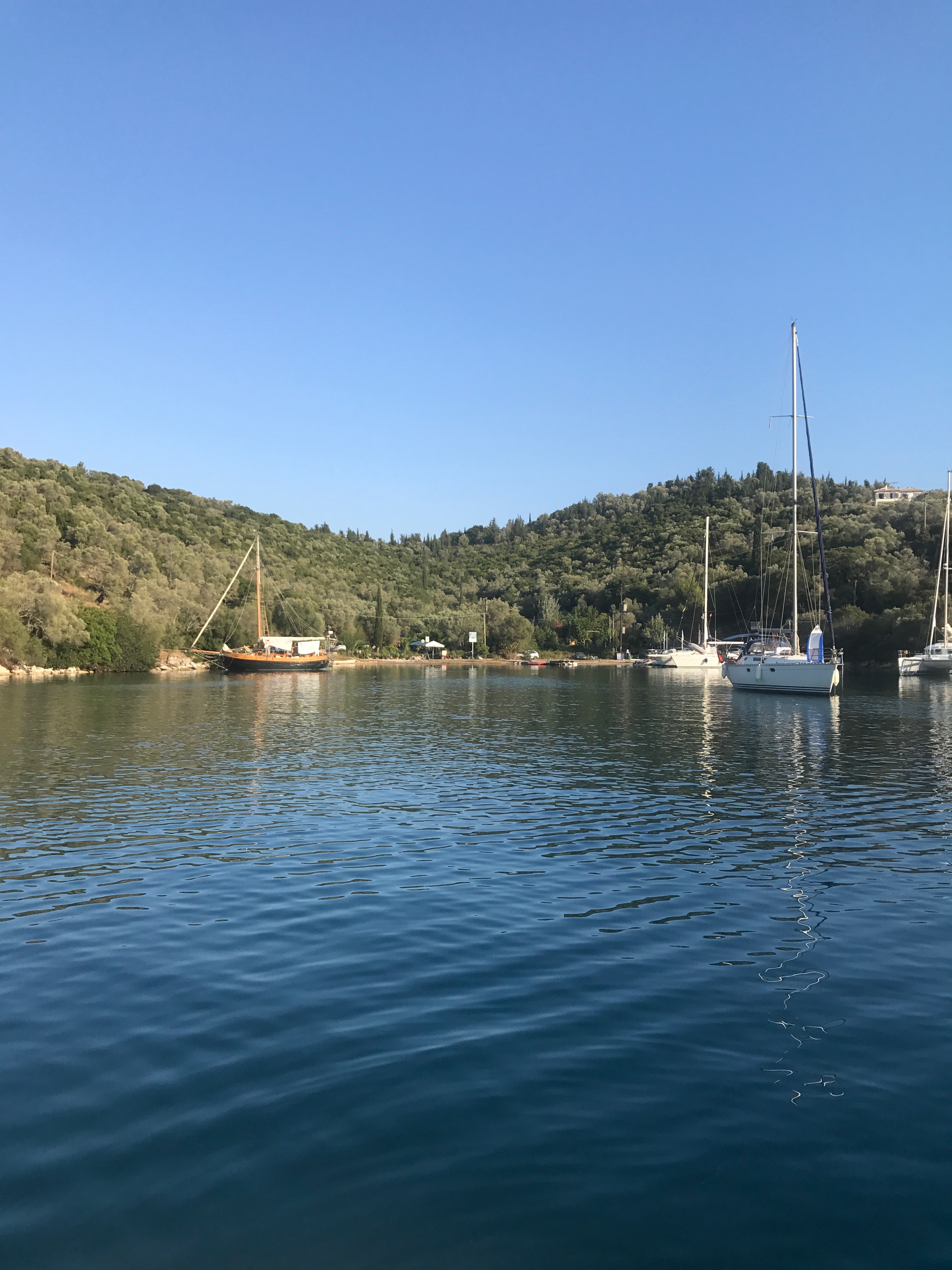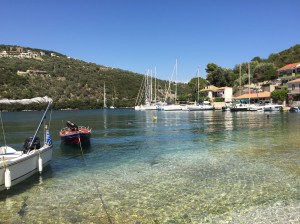 Vi steg upp tidigt och Kid pumpade gummibåten och åkte in för att köpa lite färskt bröd. Så fort han var tillbaka plockade vi ihop och gav oss iväg. Havet låg spegelblankt och någon segling var det inte tal om. Vi åt frukost under färden och tuffade fram mot Fiscardo. Efter cirka tre timmar var vi framme, klockan var inte mer än 10.30 och vi tänkte att det borde vara en perfekt tid för att lägga till vid kajen. Men det var fullt. Vi cirklade runt och kollade läget ett tag samtidigt som fler båtar kom in. Till sist gav vi upp tanken på kajplats och backade in mot den motsatta sidan med linor mot land. Vi låg bra och kunde dessutom bada, vilket var både skönt och välbehövligt. Så småningom gjorde vi oss i ordning och gick i land för att se lite av Fiscardo. Det var varmt och vi hade inte gått långt innan vi kände oss fullständigt dränerade på energi. Vi satte oss på en taverna i hamnen och beställde lunch i form av sandwich och sallad. Sedan tog vi ytterligare en liten promenad och kom på att vi var nog rätt sugna på glass och kaffe. Vi slog oss ner på ett café och beställde varsin frappé och glass. Alla utom Barbro tog två kulor. Det visade sig att Barbro var den smarta av oss. Vi fick in varsin tallrik med en gigantisk strut och två högar glass. De var i och för sig goda, men hade räckt till ytterligare fem personer. Efter en hel del kämpande rullade vi så småningom därifrån under en hel del stånk och stön. När vi kom tillbaka till båten så började allt fler båtar att komma in och till slut var det riktigt trångt runt Fragancia, trots att vi låg med linor mot land. Den sena lunchen med den mäktiga efterrätten gjorde att vi inte visste riktigt hur det skulle bli med middag. Orkar vi?? Till slut tog vi ändå gummibåten in och hittade en trevlig restaurang. Göran hamnade i samspråk med en irländsk familj vid grannbordet som tipsade om seafood med pasta eller risotto. Göran tog pastan. Vi övriga kände oss fortfarande mätta av lunchen och höll oss till några förrätter. Kid underskattade storleken på förrätterna avsevärt och beställde in tre stycken. Katarina och Barbro tog två var. Det slutade med att vi fick en doggybag med hem och för andra gången under samma dag rullade vi mot båten under en del stånk och stön. Tänk att man kan bli så mätt. Väl tillbaka i båten blev det en stund i sittbrunn med sängfösare för Barbro och Göran innan vi till slut rullade till kojs.