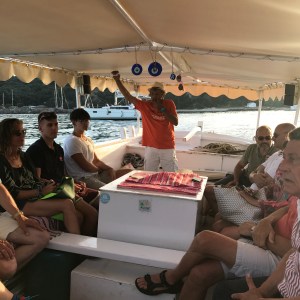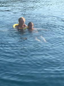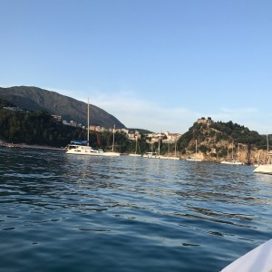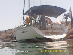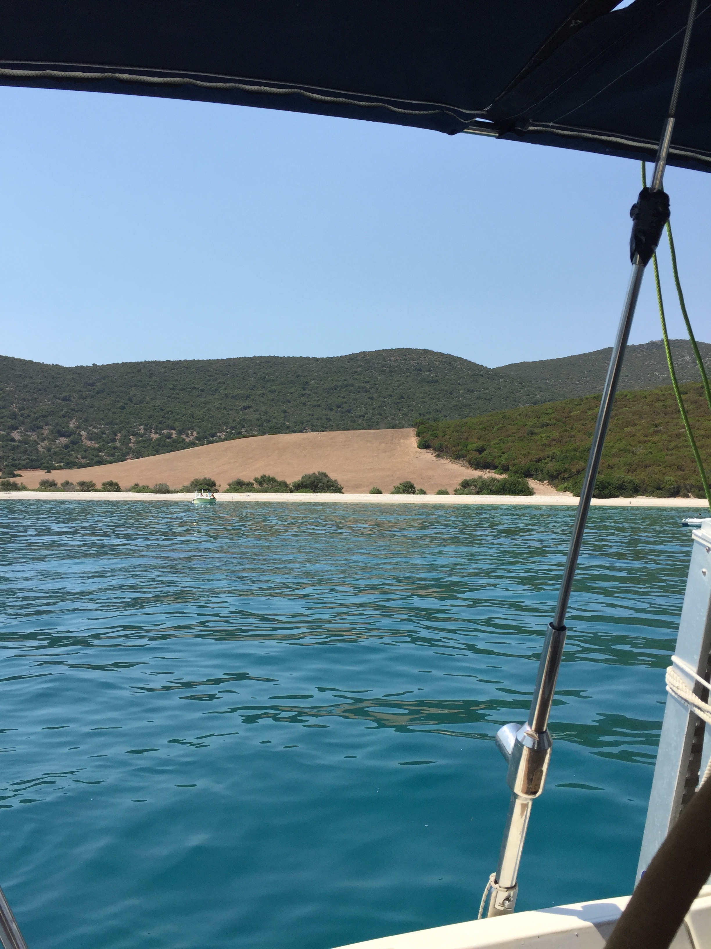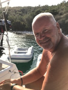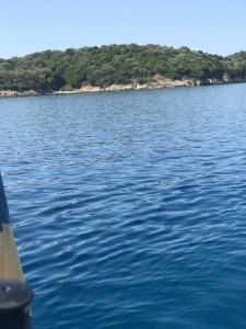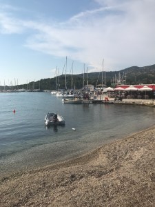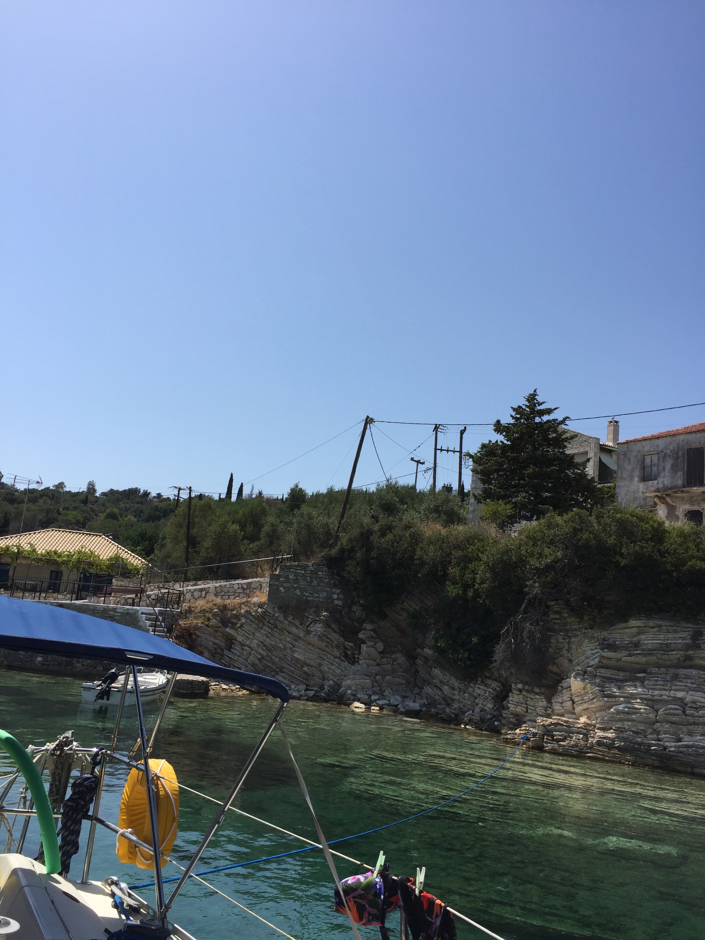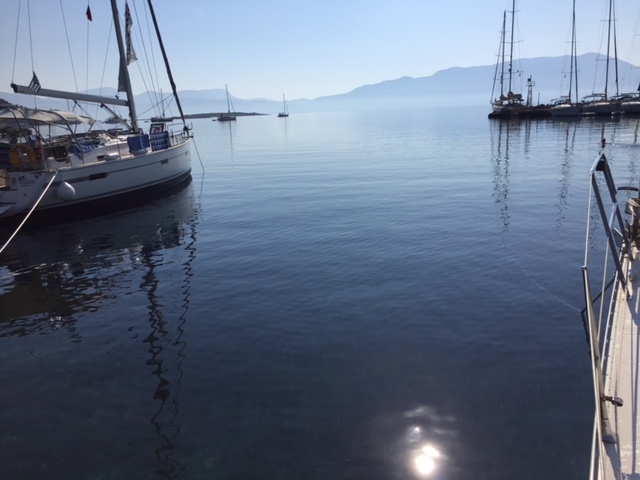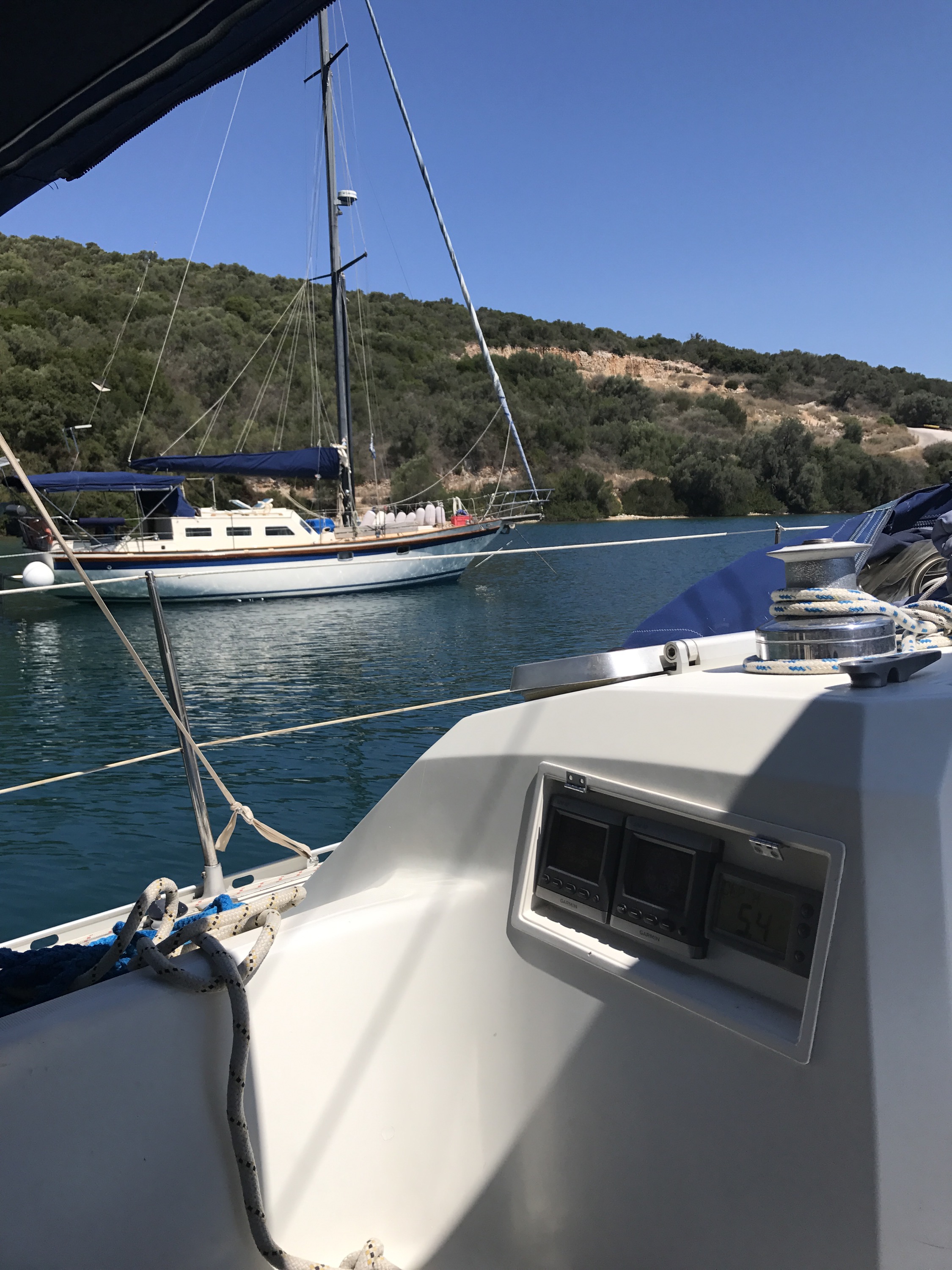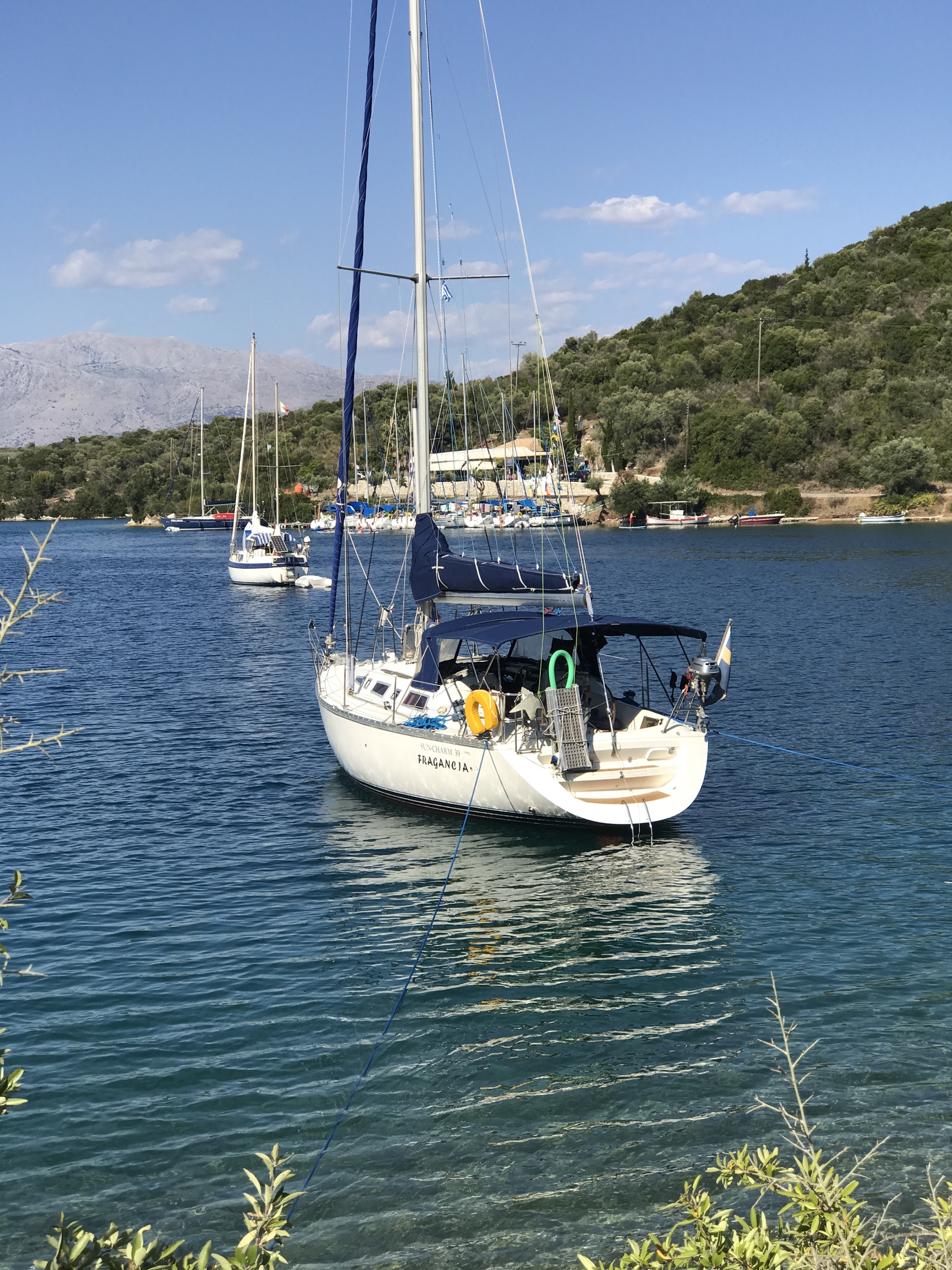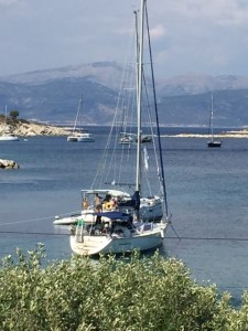 Mycket mygg och av någon anledning verkar de i första hand ha riktat in sig på Göran. Trots allt har vi sovit riktigt hyfsat och tackar USB-fläktarna för det. Idag är det en helt annan luft än igår. Inte sån tryckande värme och något lägre temperatur. Frukost i sittbrunn och sedan lite bad. Vi putsade på skrovet, men hade svårt att hitta något bra medel för att få bort fläckarna. Göran lyckades till slut gnugga bort ganska mycket med hjälp av båtvax, men inte alltihop. Vi ska fortsätta med det i morgon. Fram mot eftermiddagen kom det en svensk båt in och lade till bredvid oss. Efter ytterligare någon timme kom nästa svenska båt och lade sig mellan italienarna och engelsmännen längst ut. Det var Peter som var ensam ombord på sin båt. Han lade ankare långt ut i viken och backade bestämt in mot gluggen han hittat. Sedan hoppade han i och simmade i land med en lina innan han snabbt simmade tillbaka till båten och drog in sig med vinschen och sedan kunde han i lugn och ro simma i land med den andra linan. Imponerande. Vi fortsatte pyssla ombord. Rensade ur stuvutrymmen på gammalt bråte som kan kastas. Katarina fick tips av Kerstin på grannbåten hur man på ett effektivt sätt kan få rent fendrarna; en tvättsvamp och Cif. Funkade utmärkt, men det märks att våra fendrar är gamla och slitna, men betydligt renare än de var tidigare och förhoppningsvis gör de inte lika mycket märken i båten nu. God fetaostomelett till lunch och sedan tog Göran gummibåten in till tavernan för att få lite internet. Katarina diskade, fixade och läste under tiden. Vi blev inbjudna till grannbåten på en drink fram mot kvällen. Trevlig bekantskap svenska Kerstin och hennes brittiske make Michael, deras vän Carl-Johan och hunden Olive. Även Peter från den andra svenska båten var med. Goda samtal och skratt tillsammans med dem och framförallt en skönsjungande Michael som klämde i med Sole Mio så det ekade i viken och inbringande förtjusta hurrarop och applåder från både tyskar och italienare. På allmän begäran framförde han även Nesum Dorma ur Turandot – Härligt!! Så småningom tog vi oss tillbaka till Fragancia och Göran gjorde en excellent pasta carbonara som sköljdes ner med lite rödvin. Vinden viner på ganska bra och i viken går det vita gäss och det ser inte så mysigt ut för de som ligger på svaj, men vi ligger tryggt inne i hörnet med tre båtar utanför oss och märker inte så mycket av vinden. Det kom in några båtar som tyckte det var för trångt och gav sig iväg igen. Vi avslutade kvällen med en omgång quiz och till Katarinas stora förtret står det numera 3-1 till Göran.