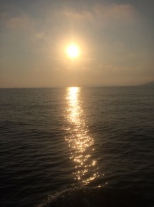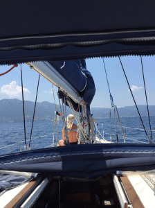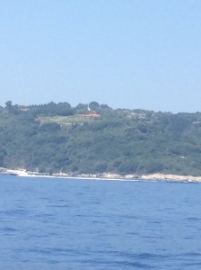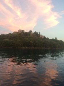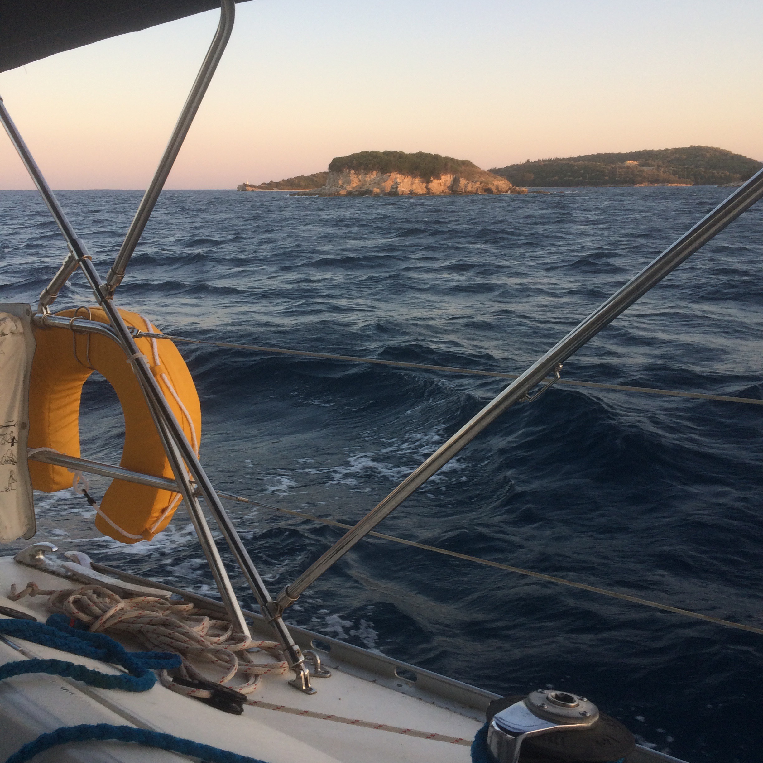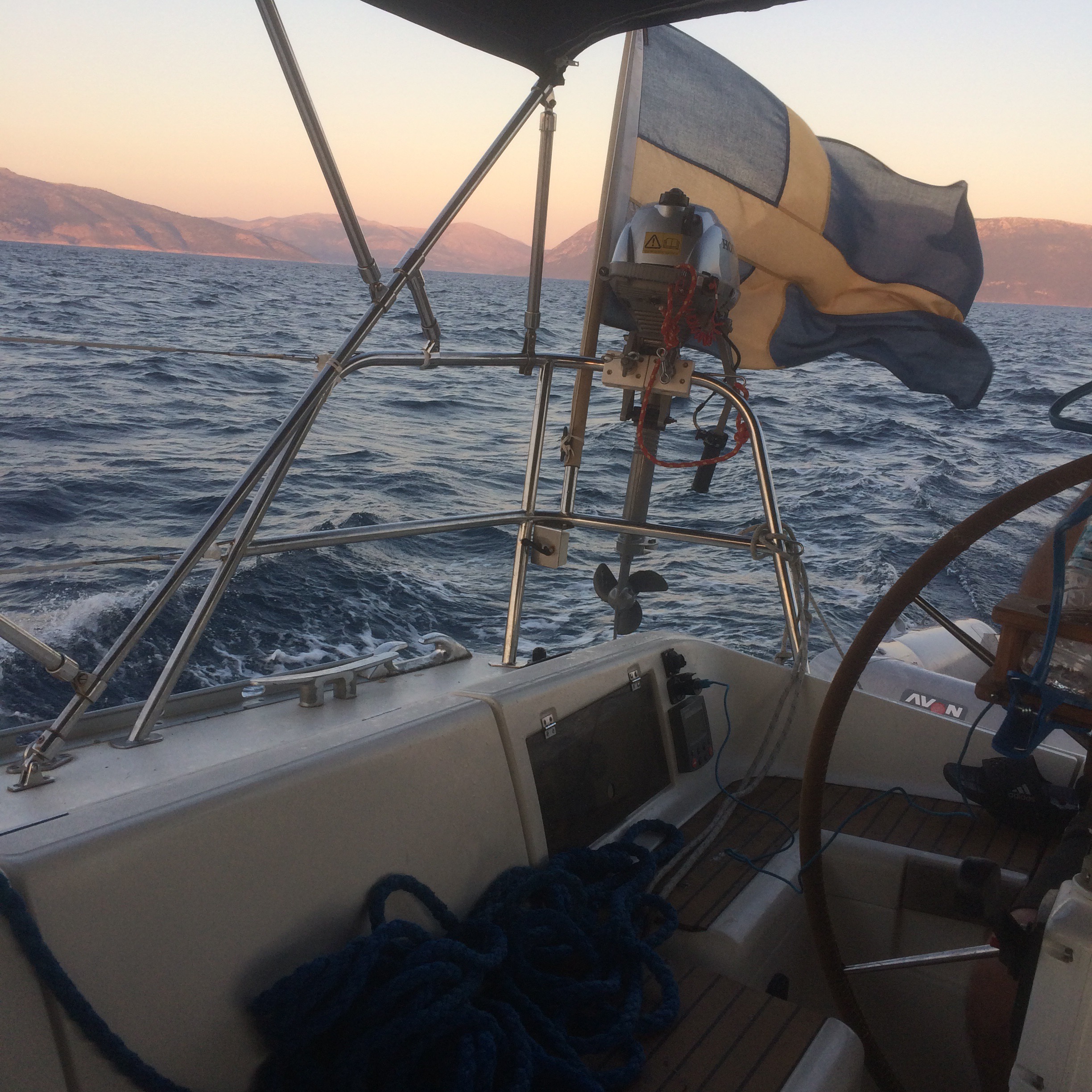 Vi vaknade vid 8-tiden och gav oss iväg en halvtimme senare. Kid och Barbro fick sköta det hela och det gick alldeles utmärkt. Frukost ombord och planen var att gå mot Atoko för att äta lunch i One-House-Bay och sedan vidare mot Kastos och förhoppningsvis kunna segla då. När vi gått en bit så började det blåsa upp lite och vi hissade segel eftersom Kid och Barbro behöver träna. Vi fick kryssa, men fick ändå rätt fin segling. Vi ändrade planen och satte kurs mot Kastos eftersom vi hade så pass fina seglingsvindar. Så småningom mojnade ändå vinden och det vara bara att starta motorn och ta ner seglen. Vi kom fram till Kastos under eftermiddagen och kunde lägga till mot trappan. Barbro och Kid skötte tilläggningen och det gick alldeles utmärkt. Väl på plats var det dags för lunch som bestod av en god fetaostomelett och rester från gårdagens middag. Sedan blev det ett par timmars slappande i sittbrunn och en tupplur innan solen gick ner och det var dags att komma i land för att äta… igen. Vi hade fått tips om fiskrestaurangen i hamnen Il Porto och dit gick vi. Samtliga i besättningen åt grillad fisk (vi vet inte riktigt vilken sorts eftersom restaurangägaren inte var så bra på engelska. Förutom Barbro som åt grillad tonfisk). Alla var mycket nöjda. Efter middagen så var det dags att ta sig till Alex och Elena i baren för lite drinkar. Kärt återseende. Det var en ganska hektisk kväll för dem, men så småningom satt vid vårt bord och pratade båda två. Vi hamnade också i samspråk med ett italienskt par som båda två spelade piano. Alex spelade Åstadens poporkester för dem. Snart hade Göran och Fabio (som mannen hette) blivit vänner på Facebook och bekantskapskretsen i joniska havet har utvidgats ytterligare. Det var en fantastisk natt när vi slutligen kom till båten och egentligen hade ingen lust att gå och lägga sig, men klockan var över två på natten så det var inte mycket att välja på.