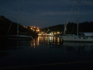 Vi sov ännu lite längre och åt sen frukost. Sedan var det med spänning som Katarina ändrade gummibåten för att lossa linorna. Skulle den kännas lika fin och full med luft fortfarande?? Nej, den släpper luft, suck. Det verkar ändå som vi hittat hålet och hade rätt i att det var en gammal lagning, men det sitter väldigt avigt till med ett hörn av golvet som ligger mot just den lagningen som dessutom är i en skarv. Vi är alltså inte klara med gummibåten än. Vi kastade loss och drog upp ankaret och gick iväg. Inte så långt hade vi tänkt. Vi har beslutat oss för att testa de fina vikarna på Meganisi de här dagarna innan vi hämtar upp Kid och Barbro i Nidri på lördag. Vi puttrade långsamt rakt ut och sedan vände vi och puttrade lika långsamt rakt in mot Port Atheni som bara ligger knappt tre distans från Abelike. Vi kom in i en liten lugn vik och beslöt oss för att inte lägga oss i den västra viken utan fortsätta ända in till själva hamnen. Väl där så var vi rörande överens om att inte lägga till mot kajplats. Mot stranden låg en sydafrikansk segelbåt med linor mot land och det fanns gott om plats så vi lade oss på hans styrbordssida, men med marginal. Man kunde komma ganska nära stranden och vi litar på vårt ankare. Vi tyckte vi fick både bra vinkel på linor och ankaret bra på plats. Det blev en lunch i båten – omelett igen – och lite bad, ganska kallt i vattnet idag. Vi ringde Elias som fyller åtta år idag och sjöng vacker stämsång, vilket han uppskattade mycket…tror vi. Sedan drog vi oss i land med hjälp av linorna i en gummibåt som kändes ganska trött och hade tappat ännu mer luft. Det är en vacker vik med de typiska grekiska fiskebåtarna i södra viken, massor med segelbåtar mot kajen, vackert turkosblått vatten och olivträd som växer upp mot sluttningarna. Vi gick runt viken och bort till kajen. Där fanns en minimarket med tillhörande liten bar. Vi kompletteringshandlade lite och tog en frappé och en öl och satt och njöt i skuggan en stund. Under tiden märkte vi att det börjat blåsa upp en nordlig vind som tryckte upp vågor i viken, men Fragancia låg tryggt på samma plats hela tiden. Lite stök blev det mellan två båtar på svaj som lagt sig lite för nära varandra. Efter ytterligare någon timme gick vi tillbaka och tog oss ut i båten igen. Vi pumpade ytterligare lite luft i gummibåten och fixade lite med disk och annat i båten. Under tiden tilltog vinden och när det började närma sig tid för kvällsdrink så började vi bli lite oroliga. Ankaret satt, men vad vi inte tänkt när vi lade till var just denna nordliga vind som dessutom bidrog till en del vågsvall och tryckte båten närmare land. Vi hade heller inte tänkt på de klippor som vi hade på styrbords sida. Linan på den sidan flöt slak i vattnet medan den andra var ordentligt sträckt och höll emot. Ankaret satt bra, men marginalen kändes allt för knapp. Vi startade motorn och försökte försiktigt dra oss något längre ut och bort från klipporna, men vi vågade inte dra in för mycket på ankaret. Vi vet att vi behöver marginal och ha minst 25 meter, helst mer ute. Nu var vi nere på 20 meter. En äldre man från den sydafrikanska båten kom till oss i sin gummibåt och frågade om vi ville lägga om ankaret och om han i så fall skulle hjälpa oss med linorna. Vi tackade och sa att vi skulle ropa om vi kände att vi behövde hjälp. Vi dividerade en stund och kom fram till att lägga om ankaret hade vi inte lust med. Till slut var vi överens om att vi istället skulle ge oss iväg, bort från det här blåshålet. Vi ropade till mannen som snabbt lossade våra linor, Katarina körde upp ankaret och så gav vi oss iväg. När vi väl kom ut ur viken blåste det upp ordentligt, en stadig nordlig vind på 10-11 m/s. Höga vågor som gjorde att båten krängde och grejor for ikring. Vi hann inte riktigt planera vår avfärd. Nu var frågan vart vi skulle ta vägen. Hade vi haft mer bränsle i båten (nu var det under halv tank) och det inte varit så sent så kunde vi helt enkelt dragit ut förseglet och gått söderut. Nu kändes det inte som den bästa idén. Abelike slog vi bort. Samma nordliga vind ligger och trycker upp sjö där om man inte hamnar längst in i hörnet, vilket inte var särskilt troligt att vi skulle göra vid denna tid. Till slut bestämde vi oss för Nidri eller Vlikho, viken innanför Nidri. Vi tände lanternorna och vår krängiga färd fortsatte. Väl bakom ön Skorpio mojnade vinden något för att ta ytterligare fart innan vi nådde fram till Nidri. Väl innanför Lefkas sluttningar mojnade vinden helt och när vi väl kom fram till Vlikho så var det alldeles vindstilla. Vi hittade ett lämpligt ställe att släppa ner ankaret på i halvmörkret och till sist låg vi säkert och lugnt och guppade i viken. Göran upptäckte att korken på tvättmedelsflaskan inte var riktigt åtdragen. Dessutom hade hela flaskan åkt i golvet av båtens krängningar, vilket resulterade i en avsevärd mängd lavendeldoftande tvättmedel på hela styrbords toalett. Det var bara att börja ösa tvättmedel. Klockan var över tio och det blev traditionellt fredagsmys som i gamla tider hos familjen Wiberg-Hedman-Djupström. Varma mackor och chips! Inget quiz utan sedan kröp vi tämligen utmattade till kojs i en fantastisk doft av kemiskt framställd lavendel.