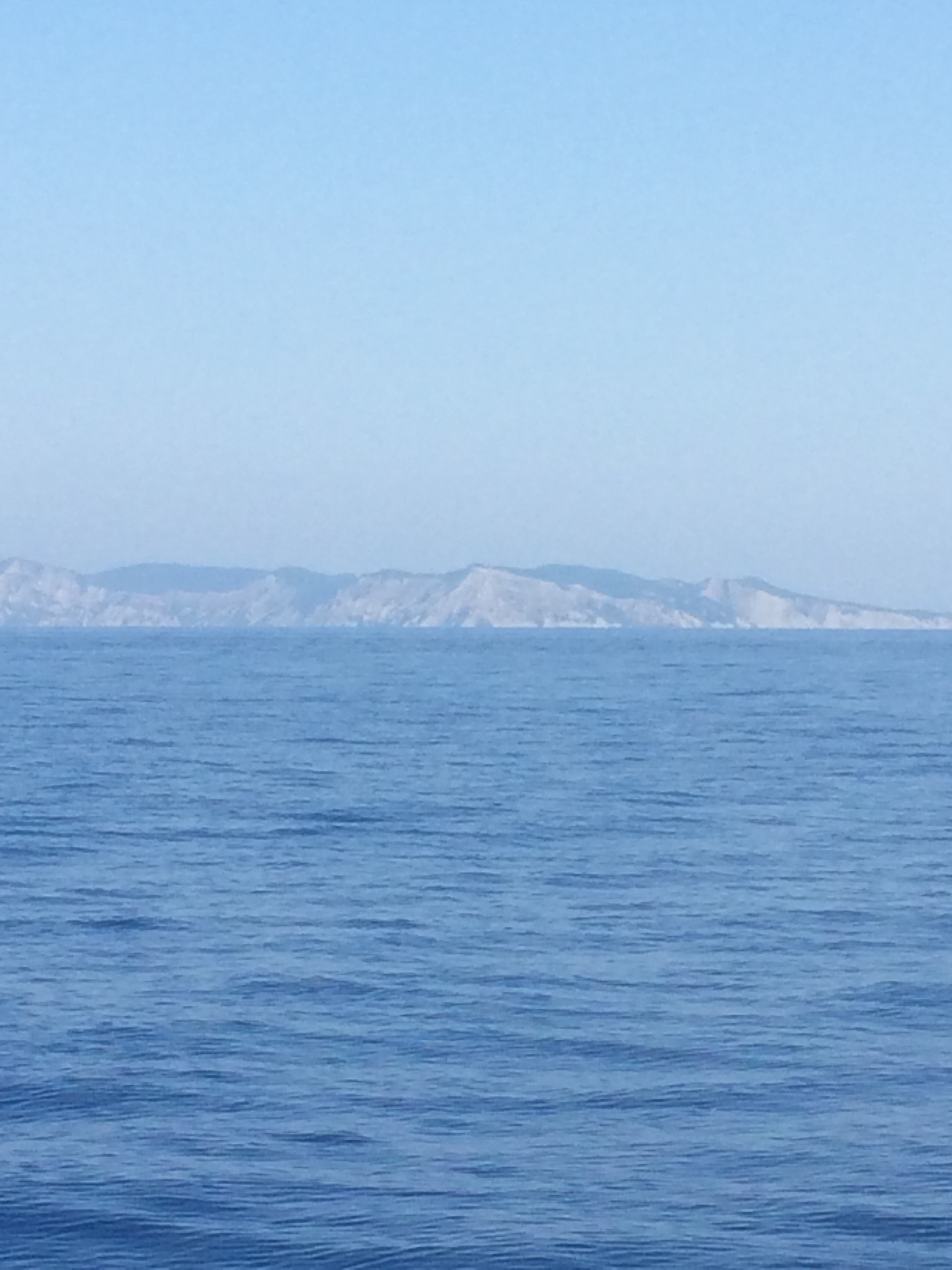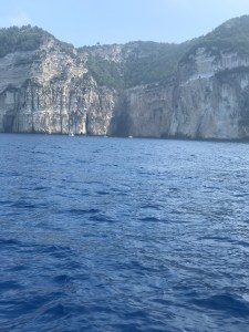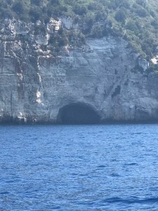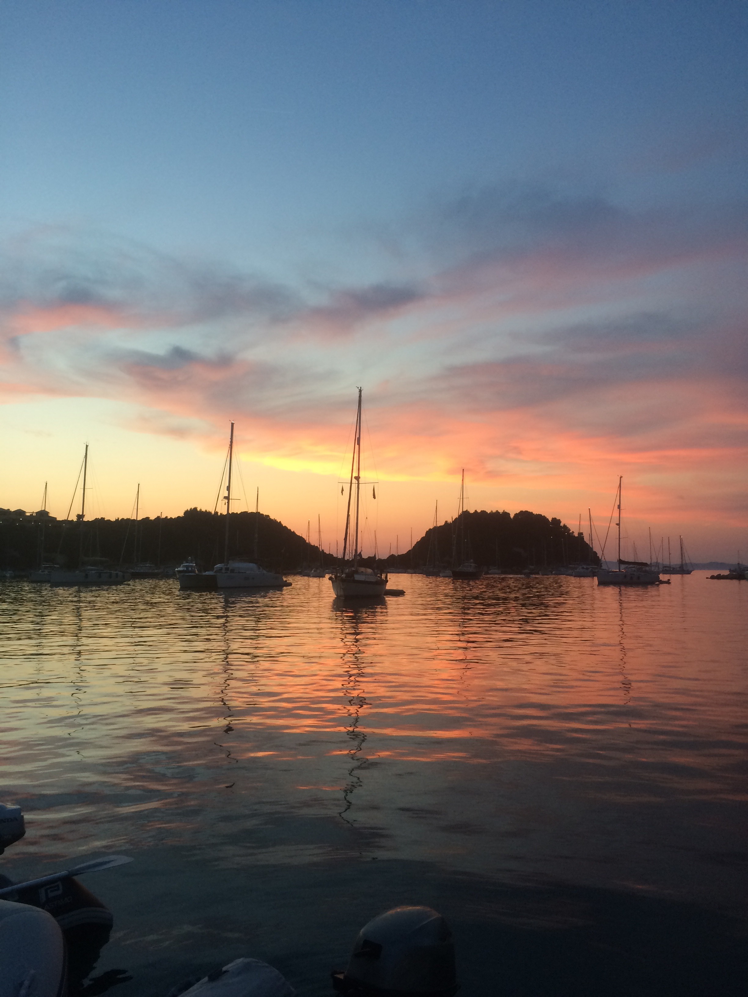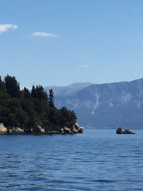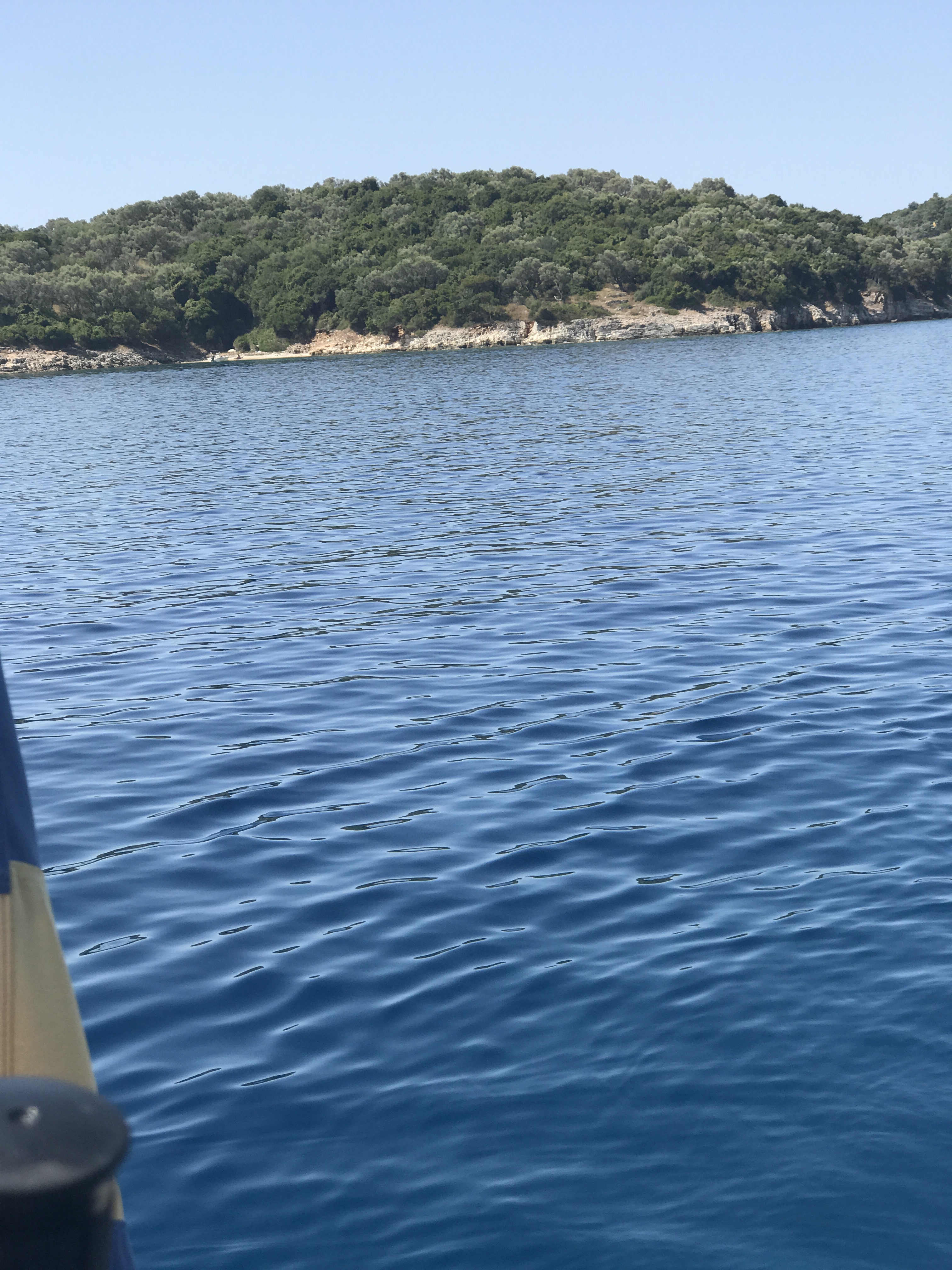 Vi packade ihop när vi vaknade, kokade kaffevatten och gav oss iväg tillbaka mot Paxos. Ingen vind idag heller, utan motorgång hela vägen tillbaka. Vi har fått för vana att dricka kaffe och äta en macka eller tallrik yoghurt när vi ger oss iväg, förutsatt att vädret gör det möjligt förstås. Så småningom kom vi fram till norra änden av Paxos igen. Vi har hört att utsidan av Paxos är spektakulärt och häftigt att se så vi bestämde oss för att gå runt hela ön för att så småningom lägga till i en liten vik på södra Paxos. Enligt Rod Heikell så har har det tidigare bott en koloni av munksälar här, men allt eftersom båtturister expanderat har dessa skygga djur försvunnit från öarna. Utsidan av Paxos var fantastisk. Höga klippor som reste sig ur havet och med stora grottor nere vid vattenytan. Turbåtarna var många och flera av dem åkte in och nästan försvann i de största grottorna. Otroligt häftigt och vid tillfälle hoppas vi kunna komma närmare och inspektera någon av grottorna. Vi rundade södra udden och gick in mot Mongonissi, en liten hamn på södra Paxos, där man är väl skyddad i alla väderstreck. Det var lugnt i viken och vi lade oss på svaj ganska långt in. Det blev lunch som för ovanlighetens skull tillagades av Katarina, bestående av grekisk sallad, bröd och tatziki som sköljdes ner med lite vin. Så småningom kom allt fler båtar och det blev allt trängre vid den lilla kajen och även ute i viken. Dagen övergick sakta mot kväll och när skymningen kom lagade Göran en god middag i båten. Efter maten tog vi gummibåten i land och avslutade med en kvällsdrink på en liten trevlig och väldigt grekisk bar i land. Kvällen var fantastisk och Mongonissi visade sig från sin allra bästa sida. Väl tillbaka i båten var det dags för den wibergska quizkampen och i dagsläget står det 2-0 till kapten Wiberg.