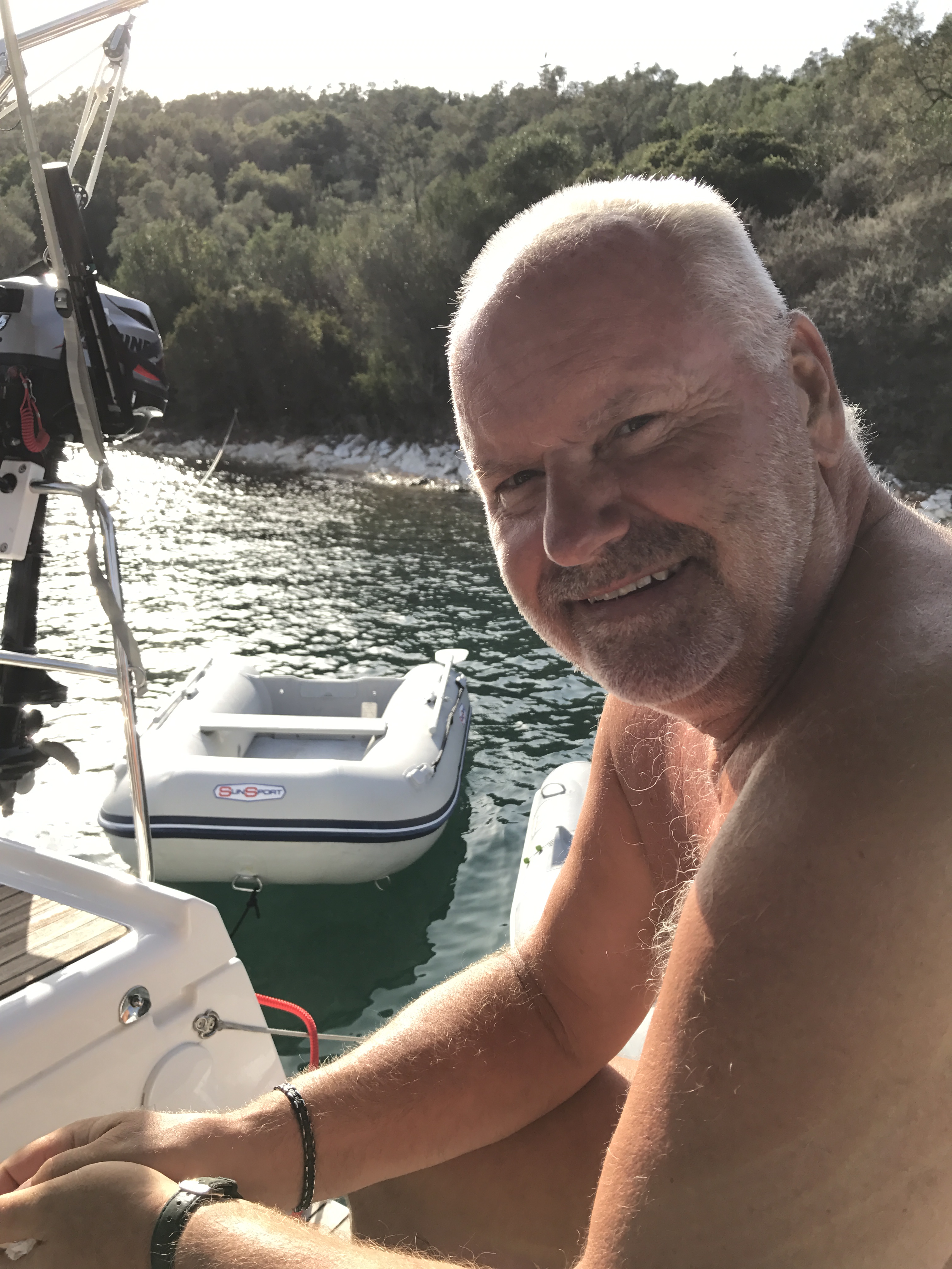 Vi sov länge och låg och drog oss innan vi slutligen klev upp. Vi har noterat att frukosten blir senare och senare för var dag, men vad gör det. Vi har semester. De flesta av våra grannar gav sig av idag. Från början hade vi också tänkt göra det, men vi har fortfarande inte lyckats hitta läckan på gummibåten, så vi beslöt att stanna ytterligare en dag och försöka fixa den. Vi drog upp gummibåten på däck och hittade ganska snabbt en gammal lagning som släppt. Bra där har vi problemet. Vi släppte ur luften och tog ur golvet. Det är ett hårt och tungt golv som är delat i tre delar, fruktansvärt otympligt, men till sist var båten tom. Vi hämtade sandpapper, laglappar och klister och satte igång. Det var lite knöligt och besvärligt eftersom lagningen satt precis vid en skarv och det var svårt att få det helt tätt. Efter mycket om och men, en del pillande och ytterligare ett getingstick (Katarina den här gången) så kändes det bra. Nu var det bara att vänta tills det torkat ordentligt. Vi badade, läste och tog en tupplur. Sedan skrubbade Katarina de sista fendrarna så nu är alla rengjorda. Framåt kvällen var det dags att ta itu med gummibåten igen. Efter mycket pillande och lite pusslande var golvet på plats igen. Vi pumpade upp den, gjorde ren den och fick till slut ner den i vattnet. Göran pumpade ytterligare när den väl låg i vattnet, sedan var det bara att sätta igång och skrubba däck. Göran gjorde ett grundligt jobb och däcket blev rent och fint efteråt. Vi tog sittbrunn också när vi ändå var igång. Äntligen klara tog vi ett dopp och konstaterade att klockan hunnit bli halv nio på kvällen. Dags för kvällsdrink och middag i båten. Vi börjar bli lite trötta på pasta och pastasås och måste komma på något annat att äta. Men ikväll blev det just pasta i form av tortellini och pastasås. Vi avslutade kvällen med ett parti quiz och numera står det 2-4 till Göran.