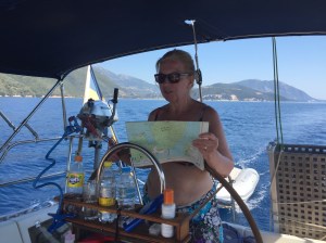 Vid 09.30-tiden masade Katarina sig upp med en dunkande huvudvärk. Ingen annan var uppe än, konstigt. Kid som sagt att han nog skulle vakna först och gå och handla bröd. Två huvudvärkstabletter, i med linser och plockade lite. Barbro kom upp och vi beslöt att tillsammans gå och handla bröd. Göran vaknade till liv och tog hand om kaffevattnet, men fortfarande inget liv från Kid. När vi kom tillbaka och började plocka fram frukost visade han sig i ungefär 10 minuter och försvann sedan in i förpiken igen. Vi andra åt frukost i godan ro och började göra i ordningen en inköpslista. Vi insåg att vi nog inte skulle räkna med Kid än, utan kanske fick avvakta ett tag till. Planen var att proviantera, plocka ihop och sedan åka ner till Sivota, förhoppningsvis segla dit. Vi gick och handlade, eller egentligen var det Barbro och Göran som gick och handlade efter att Katarina fick akuta magproblem. Så småningom var besättningen tillbaka till den tre fjärdedel som dagen inleddes med. Barbro och Katarina gick och köpte vatten och öl medan Göran gjorde klart för avfärd. Fortfarande ingen Kid. Vi insåg att vi nog fick ta fram plan B – Gå till Abelike och ligga på svaj för att i morgon gå till Sivota istället. Så blev det. Katarina och Barbro körde gemensamt upp ankaret och vi gav oss iväg. Någon timme senare var vi framme i Abelike och Katarina och Barbro släppte gemensamt ner ankaret. Det var ganska lugnt i viken och vattnet låg spegelblankt. Det blev en grekisk sallad till lunch tillredd av Barbro, mycket god. Kid började kika fram, men klarade inte av att äta något. Vi fick lite flashbacks från veckan med Carina även om det var helt andra orsaker till ”sjösjukan” denna gång. Vi tog det lugnt i sittbrunn och badade många gånger. Vi beslutade att det skulle få bli en sen middag på Minas taverna så vi skulle slippa laga mat i båten. Vi låg ganska nära land så vi brydde oss inte om att sätta på motorn på gummibåten, utan rorsman Wiberg Hedman tog årorna och såg till att hela sällskapet kom väl i land. Det var mycket folk hos Minas. Vi åt en god middag bestående av bacon- och kycklingsouvlakis och Kid, som äntligen piggnat till, tog fisksoppa men höll sig till vatten och apelsinjuice i övrigt. Vi hade en lång pratstund med Minas ägarinna innan vi slutligen rodde tillbaka till Fragancia. Det blev en sängfösare bestående av päronkonjak och sedan tog Göran och Katarina ett nattdopp innan det var dags att gå till sängs.