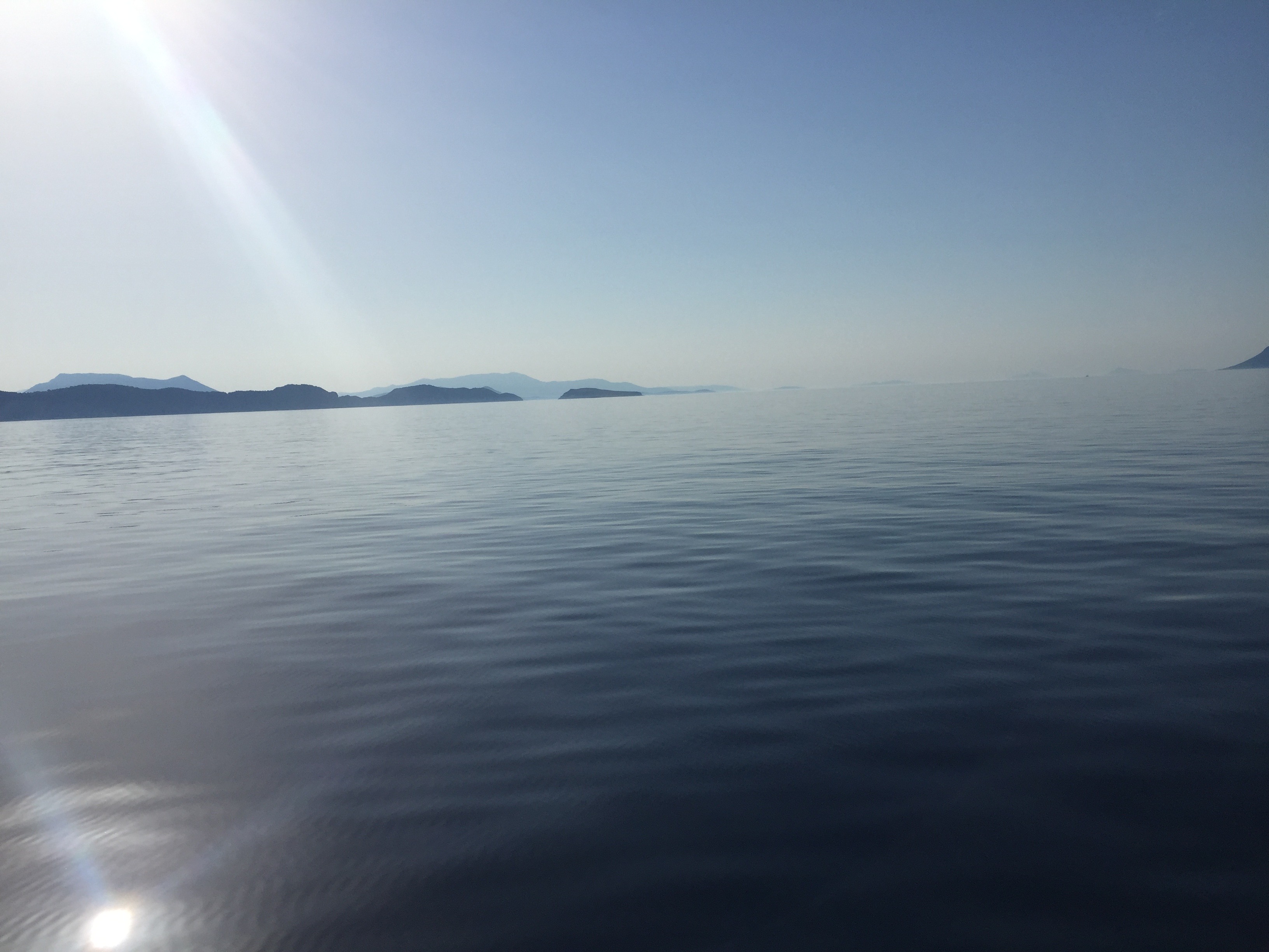 Vi vaknade tidigt. Morgonen var ljuvligt skön, alldeles stilla. Vattnet var spegelblankt och så klart att man kan se detaljerna på botten, sex meter ner. Vi packade ihop och gled ut från Kastos för sista gången denna sommar, åtminstone för Katarinas del. Barbro och Kid ska vara här några veckor och kommer säkert tillbaka. Göran och Kid kommer tillbaka i september och lär nog avlägga ett besök på Kastos, hos Alex. Tanken var att vi skulle gå tillbaka till Meganisi och lägga till i Vahti för att handla och fylla på vatten och sedan gå till Abelike och dra linor till land. Vi räknade med att det skulle blåsa i sundet mellan Kalamos och fastlandet som det alltid brukar göra. Vi kände oss ändå skeptiska. Det blåste 0,4 m/s när vi närmade oss Kalamos norra udde och inte tillstymmelse till vind. När vi rundade udden och fortsatte en bit till så blåste det upp trots allt, motvind i och för sig, men det är nyttigt när man ändå ska träna på att segla. Vi hissade seglen, stängde av motorn och gjorde fart, åt fel håll i och för sig, men vad spelar det för roll. Vi kunde kryssa oss fram i över en timme, innan vinden vred och vi fick hyfsad vind åt rätt håll. Vi kunde segla ytterligare någon timme innan vinden mojnade. Vi startade motorn och tog oss in till Vahti. Det var fullt mot kajen och en italienare tipsade oss om att lägga oss mot piren på motsatt sida. Katarina förklarade att vi behövde vatten och det gick bra där sa han, men det var fel. Det fanns inget vatten vid den piren. När vi precis lagt till såg vi att en annan segelbåt som låg vid kajen åkte iväg. Vi skyndade oss att ta loss linorna, Kid gick över till andra sidan och Göran, Barbro och Katarina drog upp ankaret också lade vi till vid kajen, precis vid en stolpe med färskvatten. Perfekt. Kid och Göran fyllde vatten, medan Katarina och Barbro gick och handlade. Sedan blev det lunch i hamnen bestående av souvlakis i pitabröd, sallad och öl. Vi gick och köpte vatten och sedan lämnade vi ett mycket varmt Vahti. Samtliga i besättningen längtade väldigt mycket efter ett dopp. När vi kom fram till Abelike fick Barbro och Kid sköta allting själva. De fick bestämma var vi skulle lägga till och göra i ordning allting. Det var ledigt vid det vanliga olivträdet, bredvid en svensk båt. Det var Peter som vi träffade här för en dryg vecka sedan. Barbro släppte ner ankaret och matade ut ordentligt med kätting. Kid hoppade i med lina mot land. Både Peter och vi hade ordentligt med fendrar och snart satt Fragancia ordentligt med linor mot land. Kid och Barbro kände sig nöjda och hade gjort ett gott arbete. Samtliga fick ett välförtjänt bad i det ljumma vattnet. Sedan tog männen tag i arbetet med gummibåten. Som nog alla läsare av denna loggbok har förstått vid det här laget så läcker den luft och vi pumpar frenetiskt i princip varje dag nu för tiden. De fick upp jollen på däck, släppte ur all luft och tog bort golvet. Sedan tog de bort alla gamla lagningar vid läckaget och började om från början. Nu är det bara att vänta i 24 timmar tills allt torkat ordentligt innan vi vet om nya försöket till lagning lyckats. Förhoppningsvis funkar det nu, lagom till Göran och Katarina åker hem. Sedan var det dags för bad igen. Det är drygt 35 grader i skuggan så ideliga bad är nödvändiga och nu är vattentankarna fyllda så det är inga problem att duscha efteråt. Barbro gjord en utmärkt middag bestående av potatisgratäng med bacon, lök, champinjoner och fetaost. Till det serverades sallad och bröd. Fantastiskt gott. Vi satt länge i den ljumma kvällen. Avslutade middagen med lite honungsmelon och njöt av stjärnhimlen. Göran och Katarina avslutade med ett nattdopp innan det blev dags att krypa till kojs.