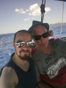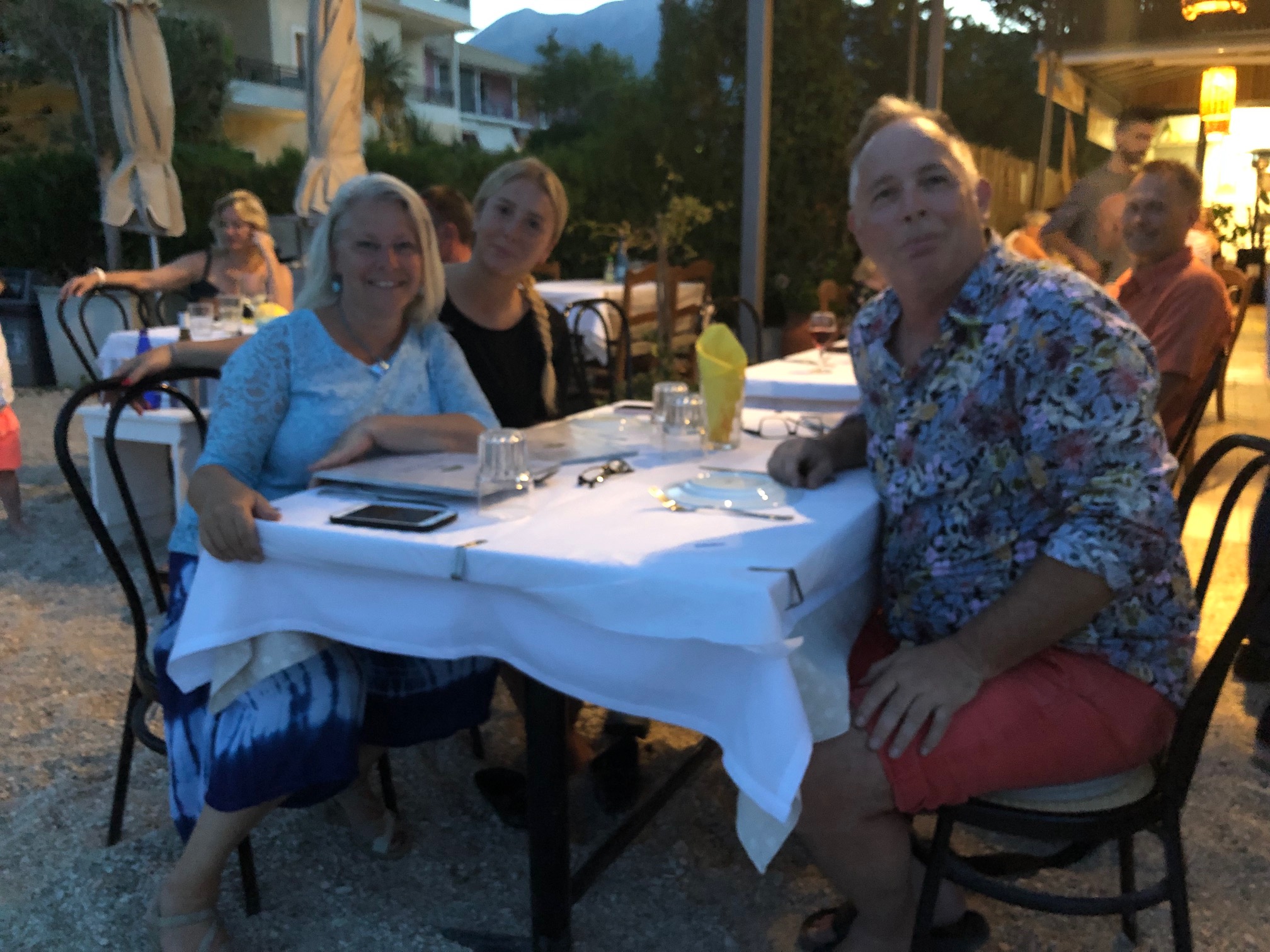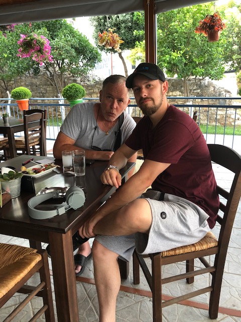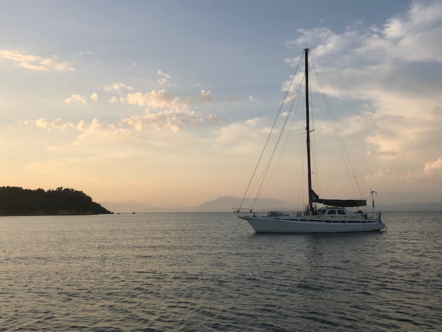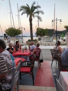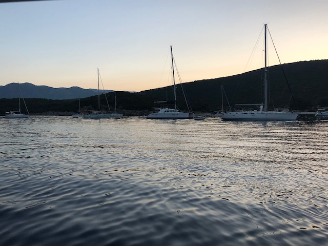 Våra sovmornar har en tendens att bli längre och längre. Kanske hänger det ihop med att nätterna blir senare och senare på något märkligt sätt. Vi vaknade som sagt ganska sent, det blev lite bad och individuella frukostar. Vi avvaktade australiensarna som gav sig iväg på förmiddagen, sedan packade vi ihop och gav oss iväg. Vi satte kursen söderut och rundade Kastos södra udde, tog sedan höger och satte kurs mot Lefkas södra udde. När vi passerat Meganisis södra udde tog vi höger igen och fortsatte norrut längs Lefkas kust. Lite hattigt med seglandet, men i princip kunde vi segla från Kastos södra udde och fram tills det var dags att gå norrut igen, då mojnade vinden. På eftermiddagen var vi framme i Nidri och släppte ankaret i Tranquil bay. Det blev en sen lunch bestående av fetaostomelett, tomat och smörgås. Sedan blev det, ja ni har hört det förut, sol och bad samt en tupplur i sittbrunn. På kvällen var det dags att ta gummibåten in till stan och gå till Katarina och Giorgio på Maistrali. God middag som bestod av saganaki och ”cheese and bacon rolls” till förrätt. Varmrätter som bestod av lammkleftiko till Göran och Daniel samt grillad kyckling till Katarina. Allt sköljdes ner med Mythos och vin. Sedan tog vi en promenad och Daniel passade på att shoppa på till sig själv och vänner där hemma. En drink och lite efterrätt på Ikaros avslutade kvällen innan det var dags att ta sig ut till båten igen. Katarina och Daniel tog ett nattdopp och sedan somnade vi sött. Smultronställe nummer fyra och middag på Maistrali avklarat.