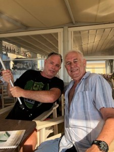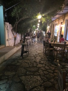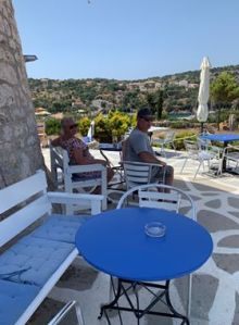 Vi vaknade efter en varm och svettig natt. Inventerade kylskåpet och skrev en inköpslista. Katarina tog en promenad upp till båtaffären och fick tag på en praktisk plastbag att ha i båten med Göran och Daniel provianterade. Vi hälsade på nya hamnkapten Giorgio, slängde lite skräp och sedan gav vi oss av. Första anhalt var Abelike. Det blåste en del, men rak motvind. Vi kan inte annat än konstatera att vi blivit bekväma med åren. Tanken på att kryssa kändes inte lockande och därför gick vi med motor hela vägen. Det var inte så många båtar när vi kom fram så vi kunde krypa ner i hörnet och dra linor till land. Efter en god lunch som bestod av fetaostomelett och grekisk sallad, blev det en lugn och stillsam eftermiddag med bad och solning innan det började bli kväll och dags för kvällsdrinken, i vanlig ordning. Vid 21.30-tiden tog vi lilla gummibåten till Minas taverna. Kärt återseende igen. Middagen bestod av ugnsbakad fetaost, friterad zucchini, kyckling- och baconsouvlakis, lammkotletter, pommes frites och tzatziki. Mycket gott. Mätt och belåtna gav vi oss av i mörket tillbaka till Fragancia. Ett obligatoriskt nattdopp stod på schemat. Det är en fantastisk känsla att simma under stjärnhimlen och se hur marelden glittrar i vattnet. Smultronställe nummer två avverkat.