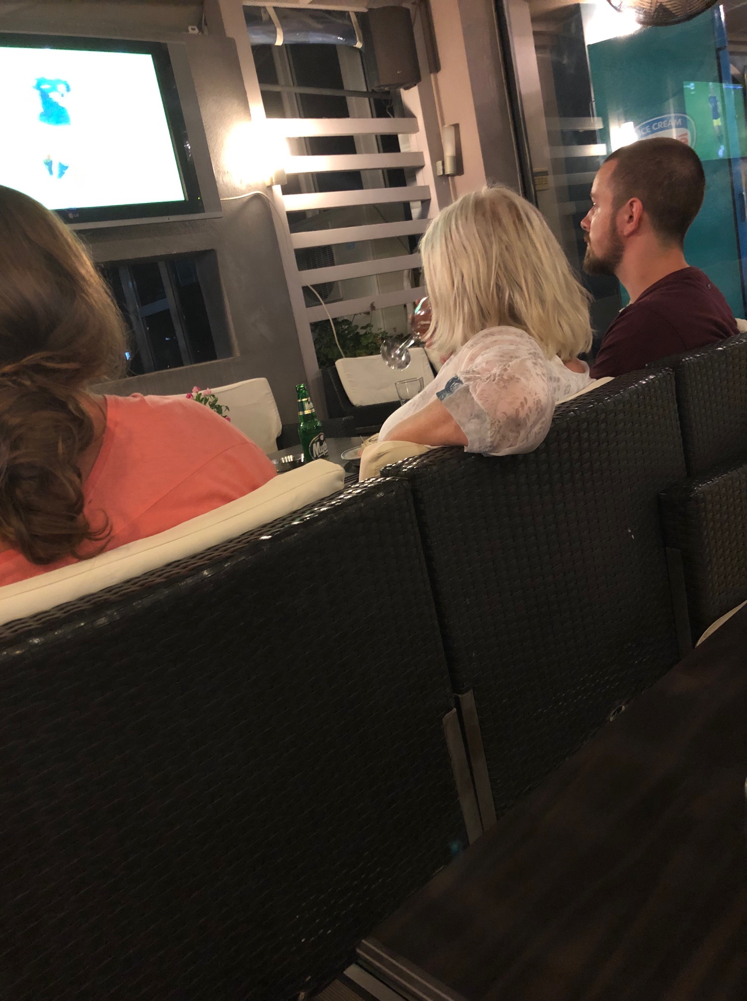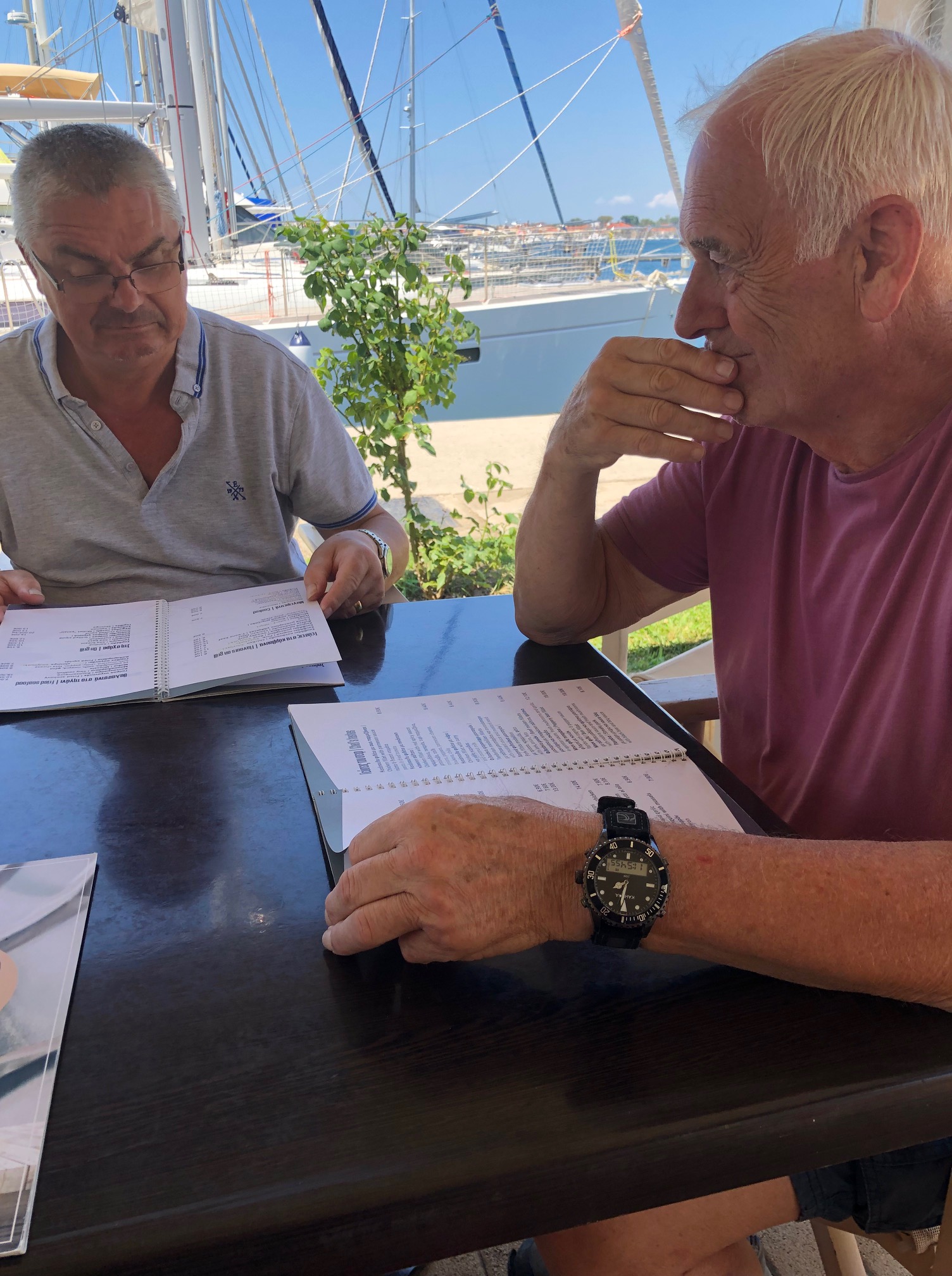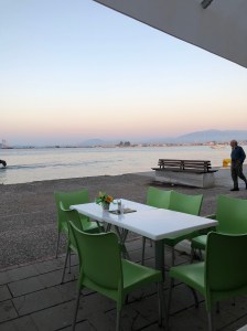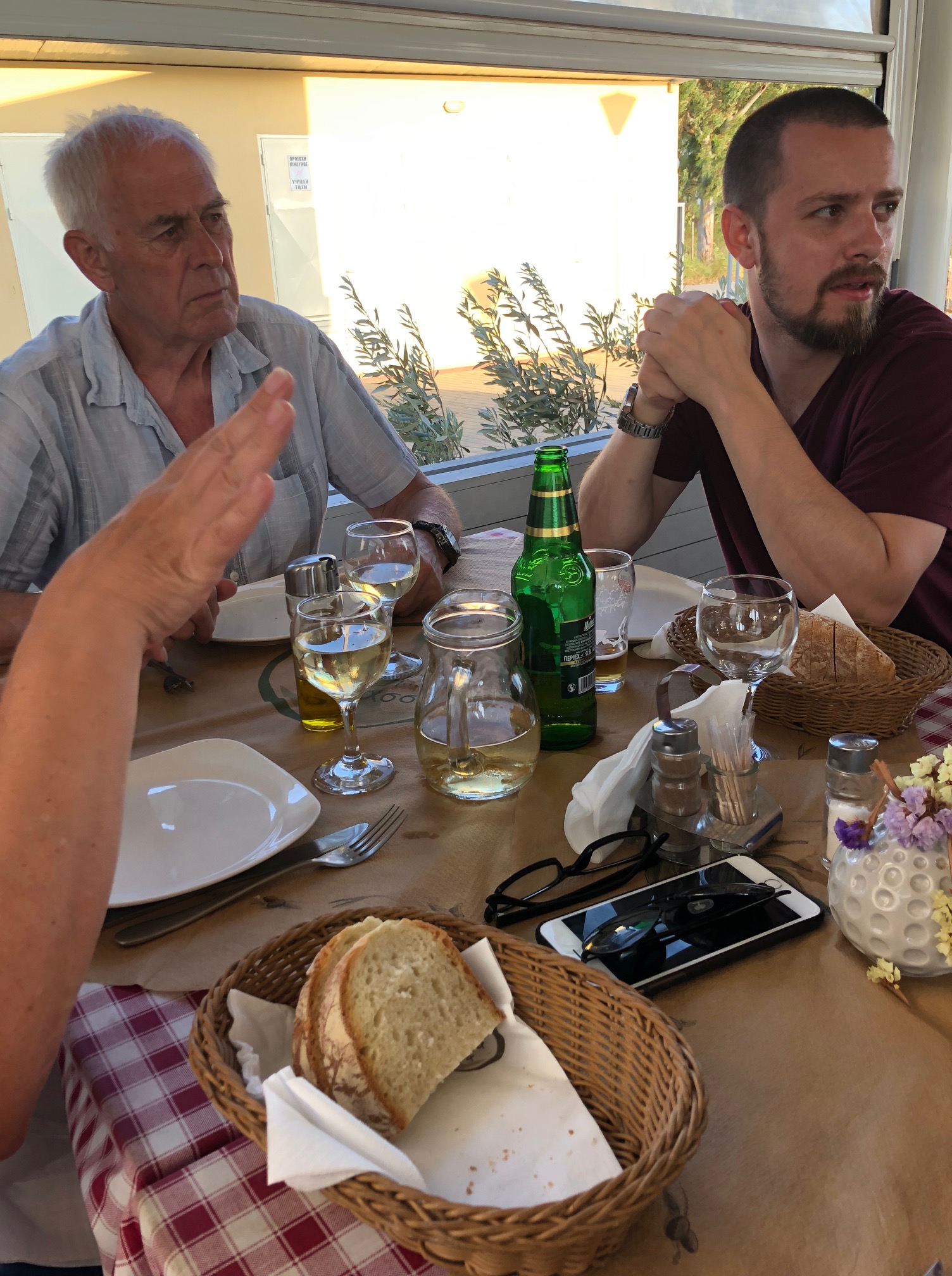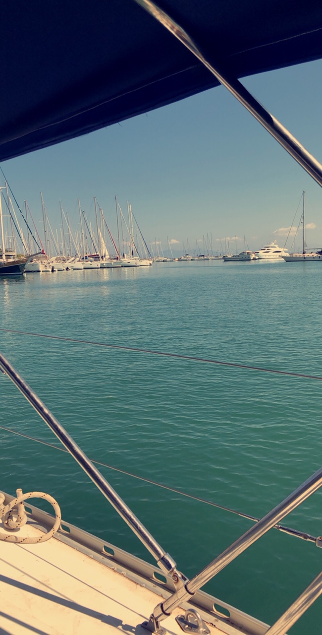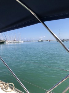 Vi vaknade lite sent, gjorde oss snabbt i ordning. Fick upp gummibåten på däck och gav oss iväg in mot marinan. Vi fick en bra plats, gjorde i ordning alla papper, satte i landström och betalade i receptionen innan vi gick upp till Sofia och lämnade in tvätten. Det fick bli en ordentlig brunch på Posto café innan vi gick tillbaka till båten och började städa. Det tog någon timme, men sedan var både båten och gummibåten rengjorda. Katarina och Daniel tog en promenad upp på stan som slutade med en glass i skuggan av glasskiosken och med fläktar i nacken. Det var en mycket varm dag. Göran anslöt och vi strosade vidare. Till slut fick det bli något uppfriskande att dricka på en av barerna i hamnen innan vi gick tillbaka till båten. Daniel packade det sista och vi passade på att duscha i marinan. Vid 18-tiden slog vi på bronsmatchen på Daniels telefon en stund innan vi gick tillbaka in till stan för att äta en bit mat. Vi tog första bästa ställe och det var väl si så där. Daniel åt en kycklingburgare, Göran åt grillad kyckling med potatismos och Katarina nöjde sig med en förrätt; fetaost och stekt potatis. Maten sköljdes ner med cola och vatten. Sedan gick Daniel till båten och hämtade sin väska medan Katarina och Göran gick till Posto café för att hämta tvätt och beställa taxi. Vid 20.00 var det dags för Daniel att lämna övriga besättningen och ge sig iväg hemåt. Det har varit en härlig vecka och många fina stunder. Det är en ynnest att få umgås så nära sina vuxna barn. Nu har har vi skickat iväg ett av dem hem till Sverige igen och väntar samtidigt på att nästa ska komma. Klockan 21.40 kom Embla med samma taxi som hämtat Daniel. Vi gick till båten så att Embla kunde packa upp innan vi gick upp på stan en sväng så att hon fick något i sig. Vi hamnade på ett trevligt ställe där Embla åt en carbonara medan Katarina och Göran tog varsin förrätt. Middag åtnjöts av fantastiskt falskspel av en man med klarinett. Det lät så illa att vi var helt övertygade om att dolda kameran skulle dyka upp. Allt för mätta gick vi tillbaka till båten i den varma sommarnatten. Det tog inte lång tid så sov vi alla till bruset av varsin fläkt.