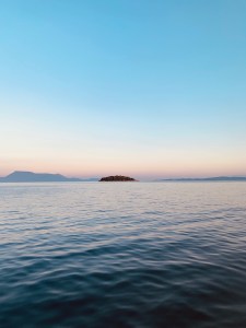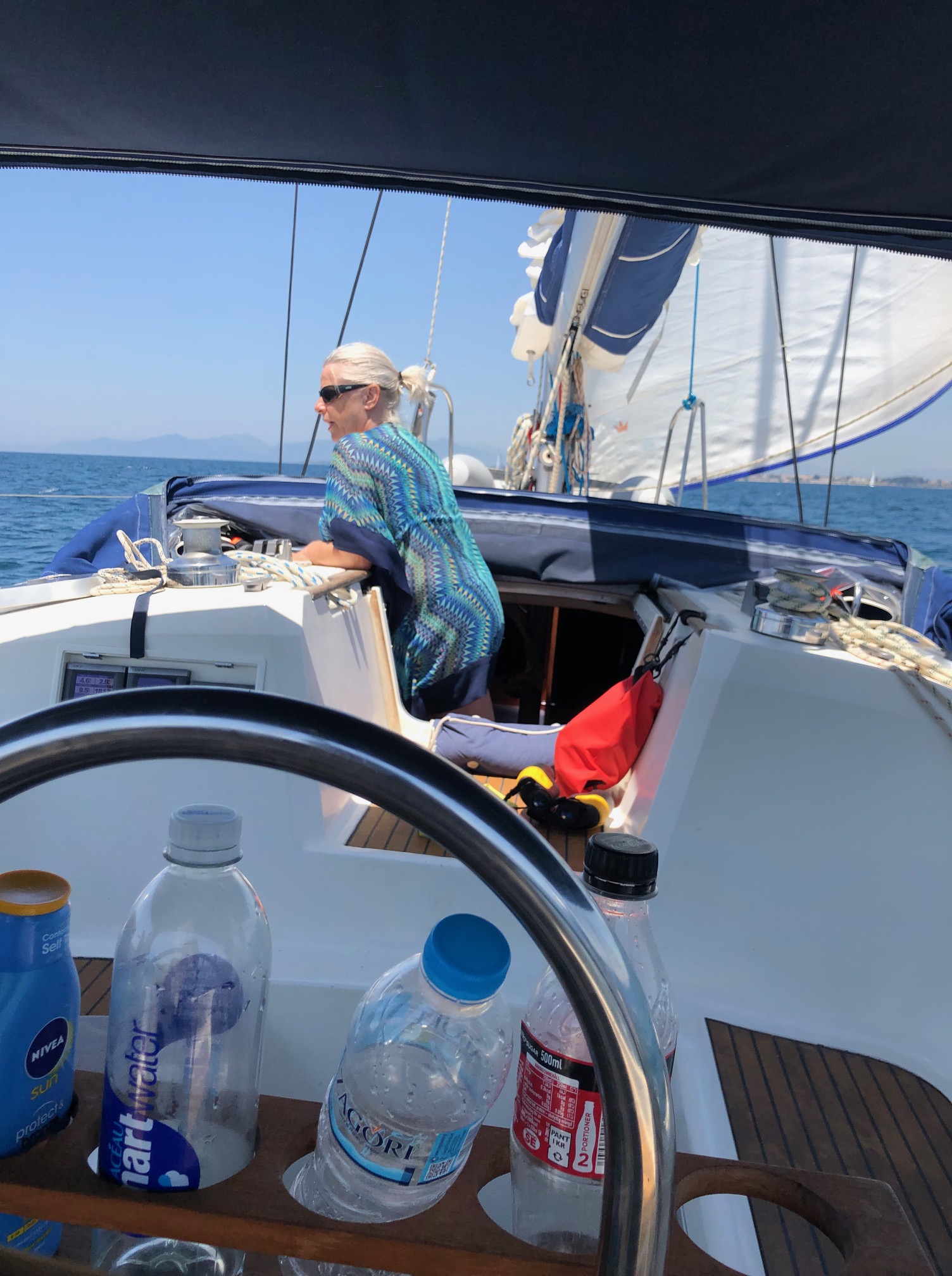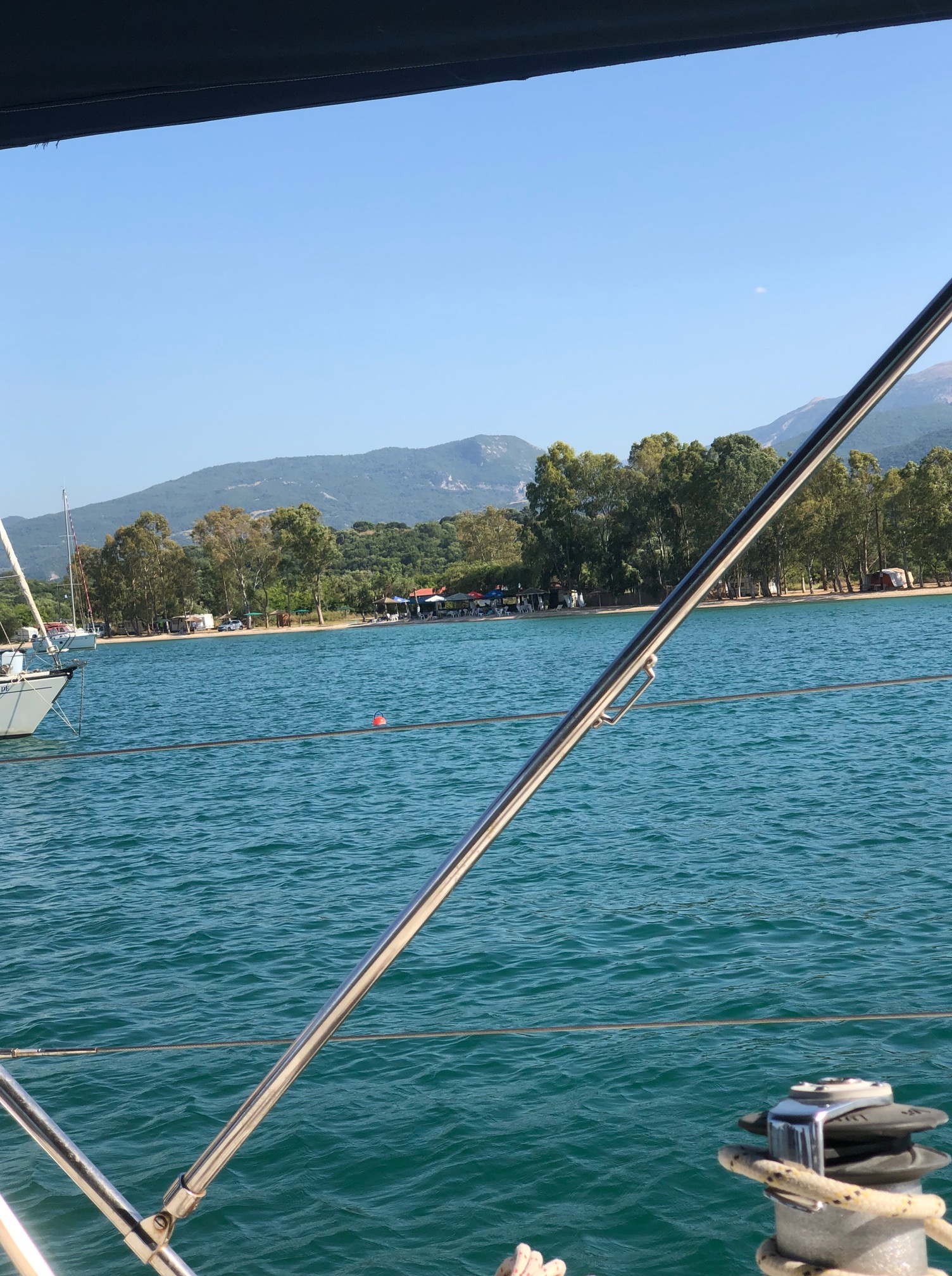 Vi gjorde oss i ordning och åt en snabb frukost i sittbrunn och sedan gav vi oss av söderut igen. Ingen vind över huvudtaget och det var bara att puttra på med motor hela vägen ner till Lefkas. Vi tajma broöppningen rätt bra och strax efter kl. 13.00 svängde vi in till Lefkas och fick en gasolflaska från Giorgio på CYS innan vi fortsatte söderut genom kanalen. Vi stannade till direkt efter kanalen för ett dopp och lunch. Sedan fortsatte vi till Havreviken. Det var rätt mycket båtar och det tog två försök innan vi fick ankaret att ta och hade marginal till övriga. En stilla eftermiddag som bestod av det gamla vanliga, en tupplur, bokläsning, bad och solande. Ovanligt vindstilla, vilket gjorde det extra varmt, men vattnet i denna vik är ljuvligt och kristallklart så det var inte så jobbigt att bada så fort det kändes lite svettigt. Kapten gjorde en utmärkt tortellini som intogs i sittbrunn på kvällen. Vi avslutade med en omgång plump i lyktans sken som Göran vann, tätt följd av Embla och med Katarina på en klar sista plats. Sedan kröp vi till kojs och somnade sött.