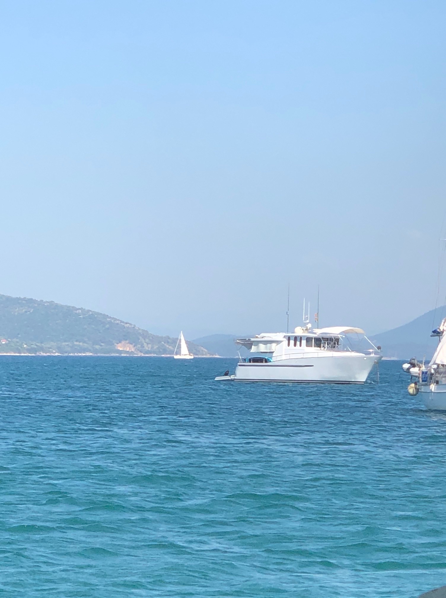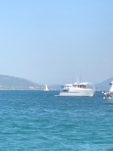 Idag är det vår bröllopsdag och en extra tanke skänkes även till Gunilla (Katarinas mamma) uppe i himlen eftersom vi gifte oss på hennes födelsedag. Vi sov länge och åt sedan frukost innan vi packade ihop och gav oss av igen. Fortfarande ett spegelblankt hav och vi fick puttra på för motor söderut. Efter någon timme var vi framme vid Skorpio, Onassis ö utanför Nidri. Vi släppte ankaret utanför Jackie Onassis strandhus för att bada och sola ett par timmar. Det är ett ljuvligt litet ställe och även här är vattnet kristallklart och alldeles turkost. Man ser tydligt botten sju meter nedanför båten och det är inga problem att ligga och guppa med cyklop och snorkel hur länge som helst för att beundra alla fiskar som simmar omkring. Så småningom drog vi upp ankaret och gick in till Nidri. Som vanligt släppte vi ankaret i Tranquil Bay. Fortsatt totalt vindstilla och det blev en tryckande varm eftermiddag. Vi tog gummibåten in till land och gick för att handla lite. Lunch i båten som bestod av varma mackor – gott! Sedan bad, lite sova, bad och bad igen innan det var dags för kvällsdrinken. Så småningom packade vi oss ner i gummibåten och gav oss in till Nidri. Bröllopsmiddagen intogs på den fantastiskt trevliga restaurangen Pinewood, som kan rekommenderas starkt. Inte bara för sitt fantastiska läge direkt på stranden och med en fantastisk utsikt över havet utan även för mycket god mat och väldigt trevlig service. Många superlativ som ni märker. Efter några timmar bröt vi upp och gick tillbaka ner till hamnen. Vi avslutade vår bröllopsdag med en drink på Ikaros innan vi tog oss ut till Fragancia igen. Katarina tog ett kvällsdopp i det ljumma vattnet innan vi till slut kröp till kojs och åter igen somnade till bruset av varsin liten usb-fläkt.