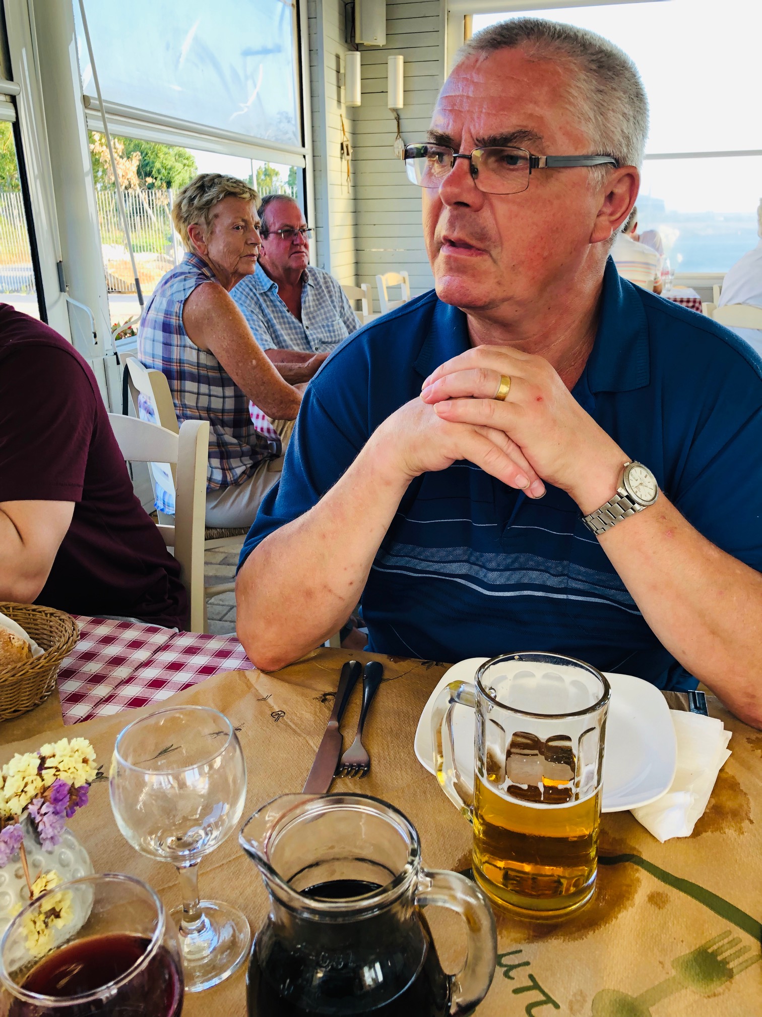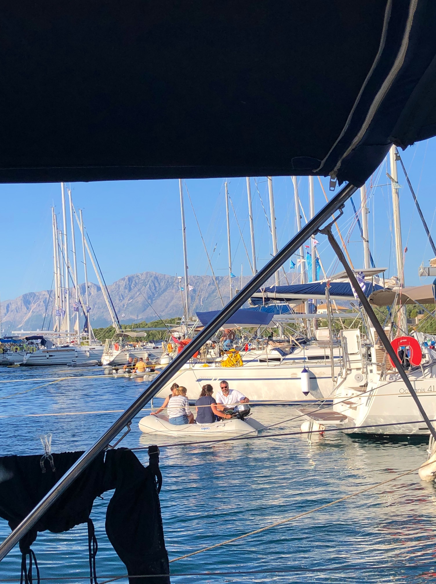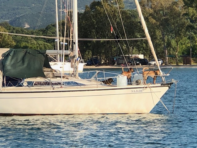 När vi vaknat tog vi gummibåten till stranden och gick upp till affären för att proviantera. När vi kom tillbaka till Fragancia drog vi upp ankaret och gav oss iväg. Vi bestämde oss för att gå längre in i den stora bukten Amvrakikos. Ganska snart blåste det upp och fick ännu en dag med härlig läns. Efter ett par timmar var vi framme vid den vik som vi siktat in oss på, Rougas. Det var vackert i viken och vi hittade en bra plats mellan en österrikisk och en tysk båt. Viken kantades av en sandstrand och en camping. På strand låg en liten taverna, men vi hade bestämt oss för middag på båten. När vi väl låg på plats och bestämde oss för ett bad så upptäckte vi att på den lilla österrikiska båten fanns det hundar, ja i plural. Närmare bestämt fem stycken, åtminstone vad vi kunde se och de var inte några små knähundar heller. Mycket märkligt. De vaktade effektivt båten och skällde intensivt så fort en simmare eller en gummibåt passerade. Tillsammans med hundarna bodde en ensam man som dök upp ibland under all presenning som båten var täckt med. Tysken på andra sidan var också ensam och såg ut som en riktig sjöbuse. Lite längre ner låg en annan tysk båt också med en ensam man ombord. Den båten såg ut som ett vrak. Vi började bli fundersamma på denna vik och framförallt de som verkade ha bosatt sig här. Å andra sidan om det befinner sig flera båtar med folk som verkar ligga länge, så kan man anta att det är ett bra och säkert ställe. Det blev en sen, men enkel lunch bestående av sallad och en fetaostomelett. Sedan blev det mer bad och en tupplur i sittbrunn innan solen gick ner. Kapten Göran gjorde sin berömda pasta carbonara till middag och vi satt i sittbrunnen under lampans sken och njöt. Kvällen avslutades med quiz och alla vann rättvist varsin omgång. Vi satt och njöt i den varma grekiska natten och såg på den fantastiska stjärnhimlen innan vi till slut gick och lade oss. En skön dag med fantastisk avslutning.