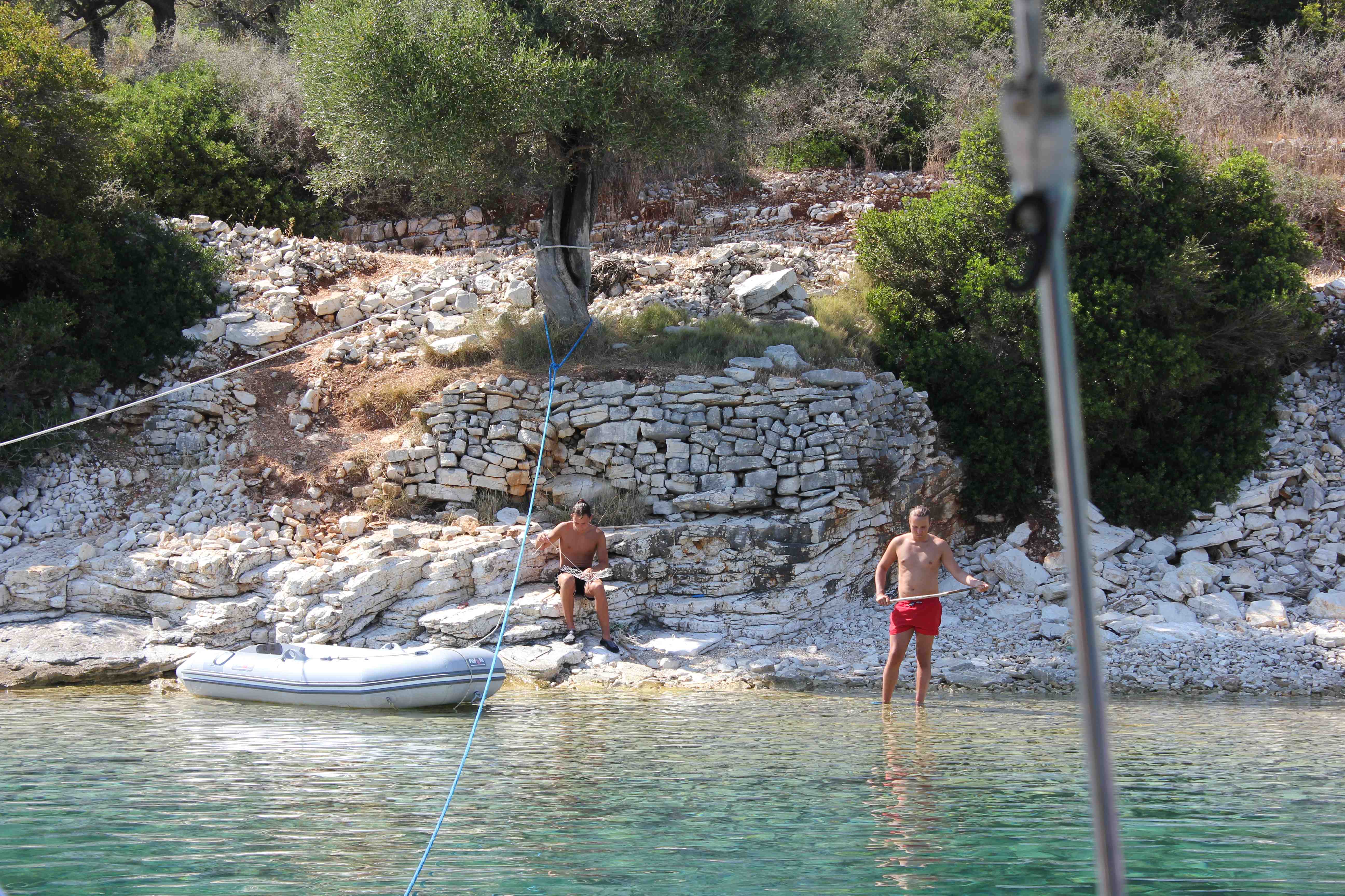 Bröd m.m var slut så innan frukost gav sig Göran och Katarina iväg med gummibåten för att handla lite. Efter frukost packade vi ihop och gav oss iväg igen.Vi styrde åt nordost tillbaka mot Meganisi. Ganska snart började det blåsa upp en NV vind som vred till V efter ett tag och gav oss en härlig segling med vinden in snett bakifrån. Det blåste ca 6-8 m/s och vi loggade drygt 7 knop. Fram mot eftermiddagen var vi tillbaka på Meganisi och lade nu till i en naturhamn med lina in mot land. Fantastiskt fint med kristallklart, smaragdgrönt vatten och man ser botten utan problem trots att det är över 8 meter djupt. Den sedvanliga lunchen bestående av omelett med fetaost, grekisk sallad, bröd och tatziki. Sedan blev det en slö eftermiddag med bad och sol. Förutom Zack som ägnade några timmar åt att knåpa ihop ett fiskeredskap av lite bråte han hittat på stranden. Redskapet gav inte mycket till fångst men ändå ett imponerande arbete och framförallt beundransvärt tålamod…. Kvällen avslutas med middag ombord
