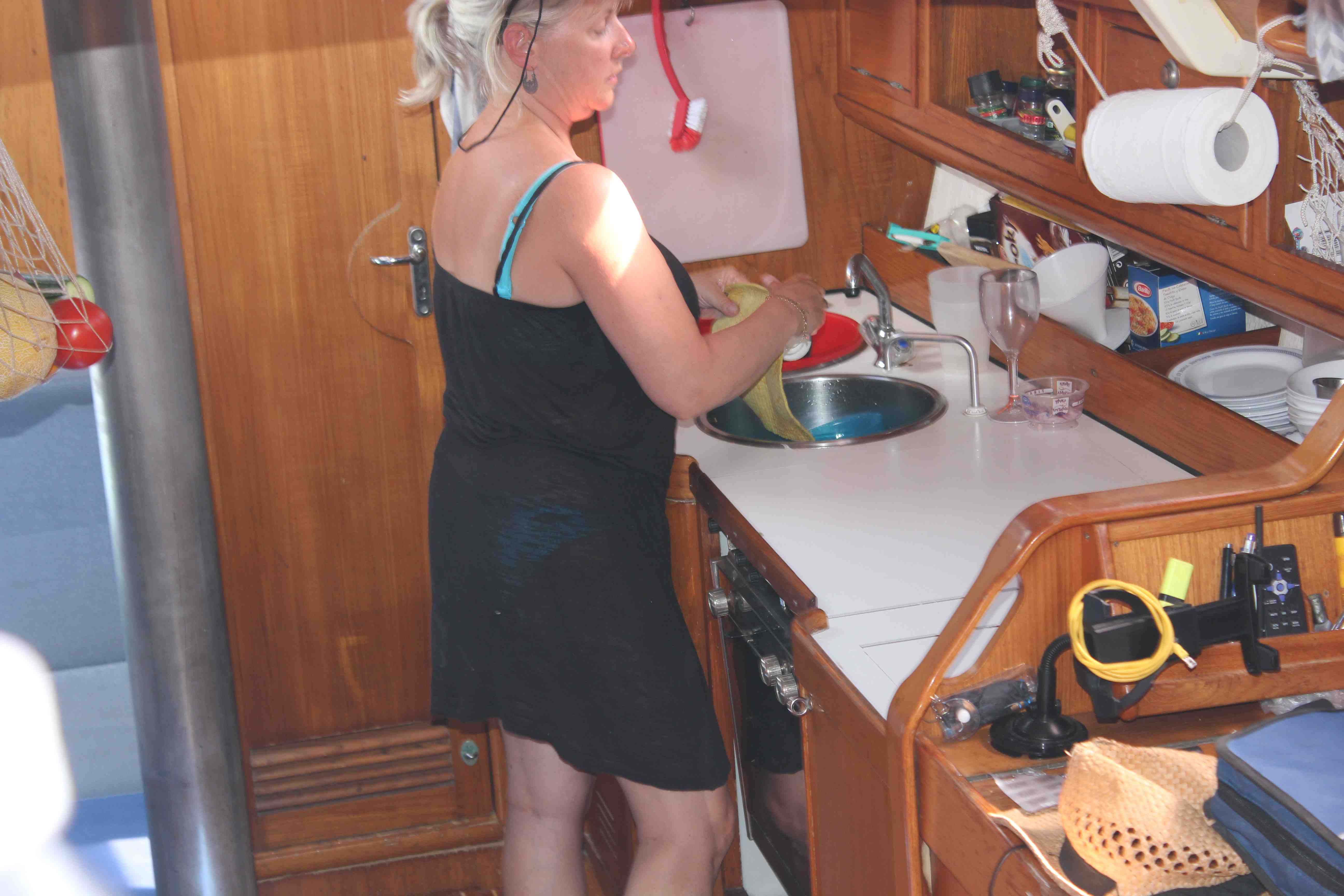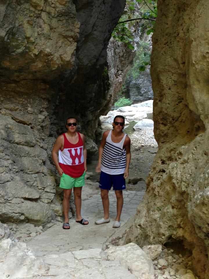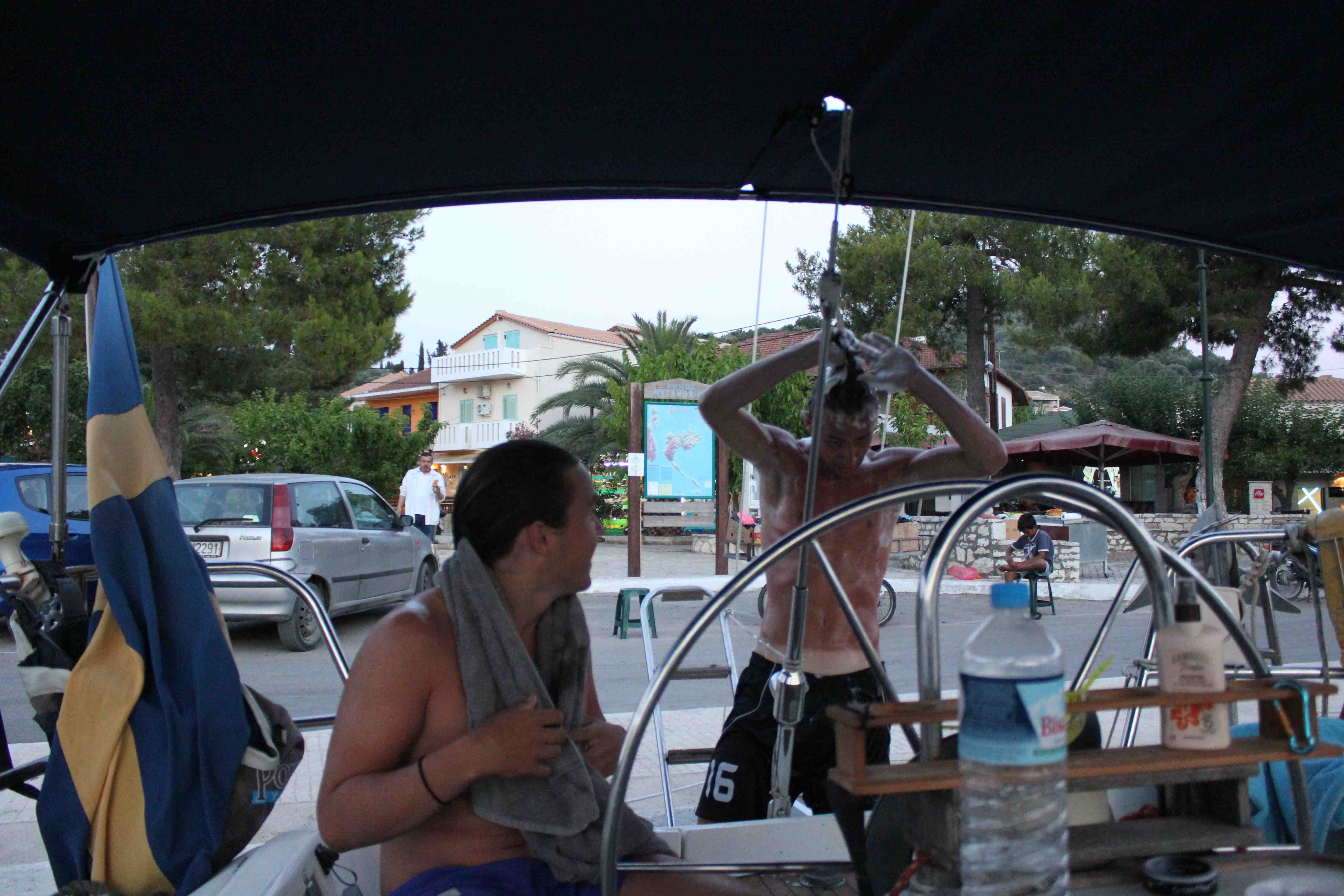 Vi vaknade vid 9.00. Zack har flyttat ut i salongen. Det blev för varmt för dem att dela förpiken så sömnen blev betydligt bättre än föregående natt. Hela besättningen vaknade dock vid 04.00 av en frustrerad kapten Göran som hade vaknat av ”gnekande” tampar i relativt hård vind. Förmiddagen bjöd på en del spänning i bukten med intrasslade ankarkättingar och drivande segelbåt utan besättning. Rådigt ingripande av kustbevakningen och andra seglare bidrog till att båten återbördades till sin plats och ankaret säkrades betydligt bättre (ägarna kommer nog att ägna mycket tid åt att träna ankring). Grabbarna gick iväg till en pool i närheten och Katarina och Göran fixade lite ombord, innan det blev dags för lite sol och bad. Eftersom 17-åringar blir ”akut” hungriga stup i ett åt killarna lunch ett par timmar före oss. Eftermiddagen ägnades åt en cykeltur till ett vattenfall några km från Nidri stad. Grabbarna badade i vattenfallet och sedan blev det bananasplit och drinkar i en bar innan vi styrde cyklarna mot Nidri igen. Ett par lugna timmar på båten innan kvällen avslutades med en härlig middag på en italiensk restaurang (mycket god pizza och pasta) och lite shopping i stan. Distans 0 NM.