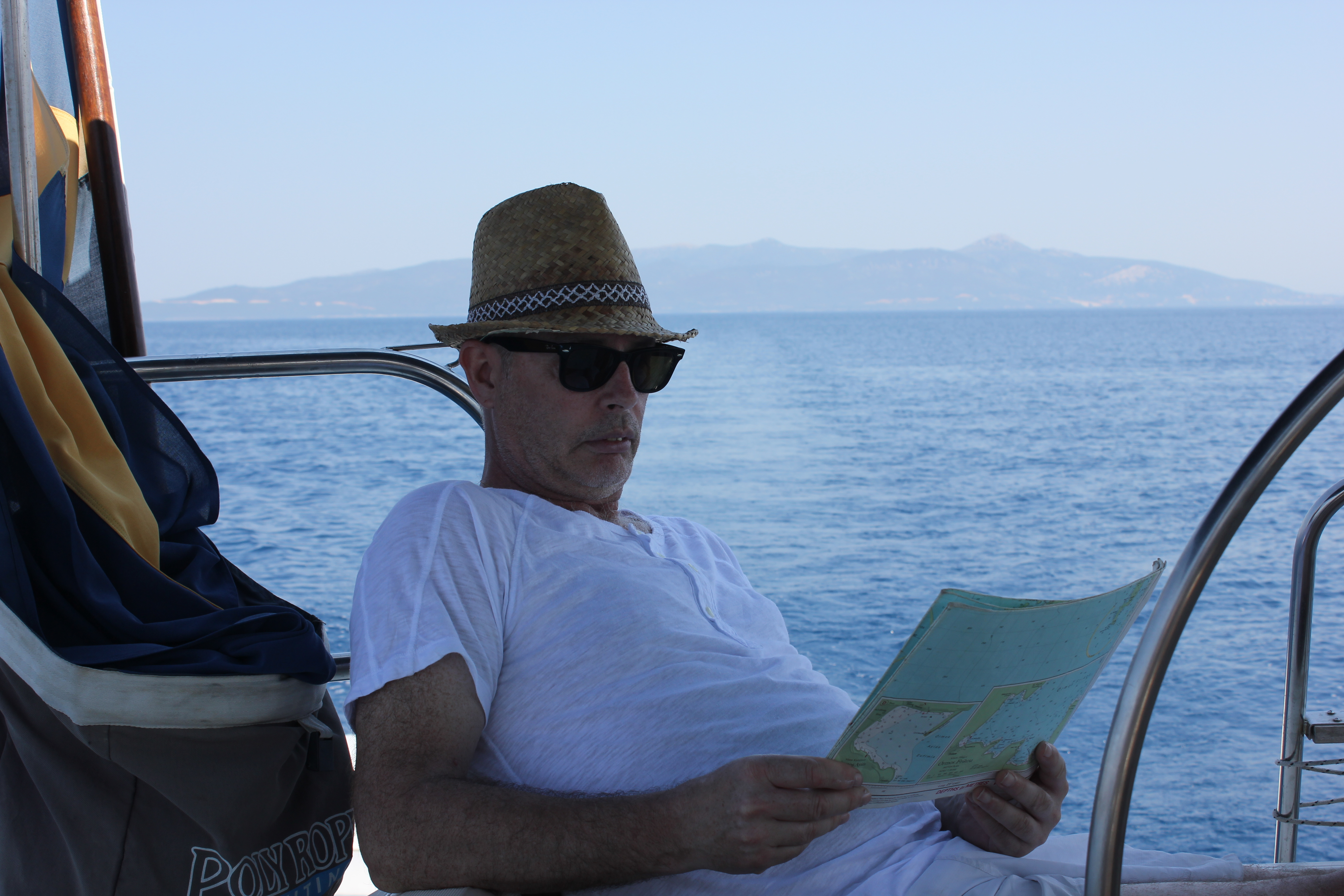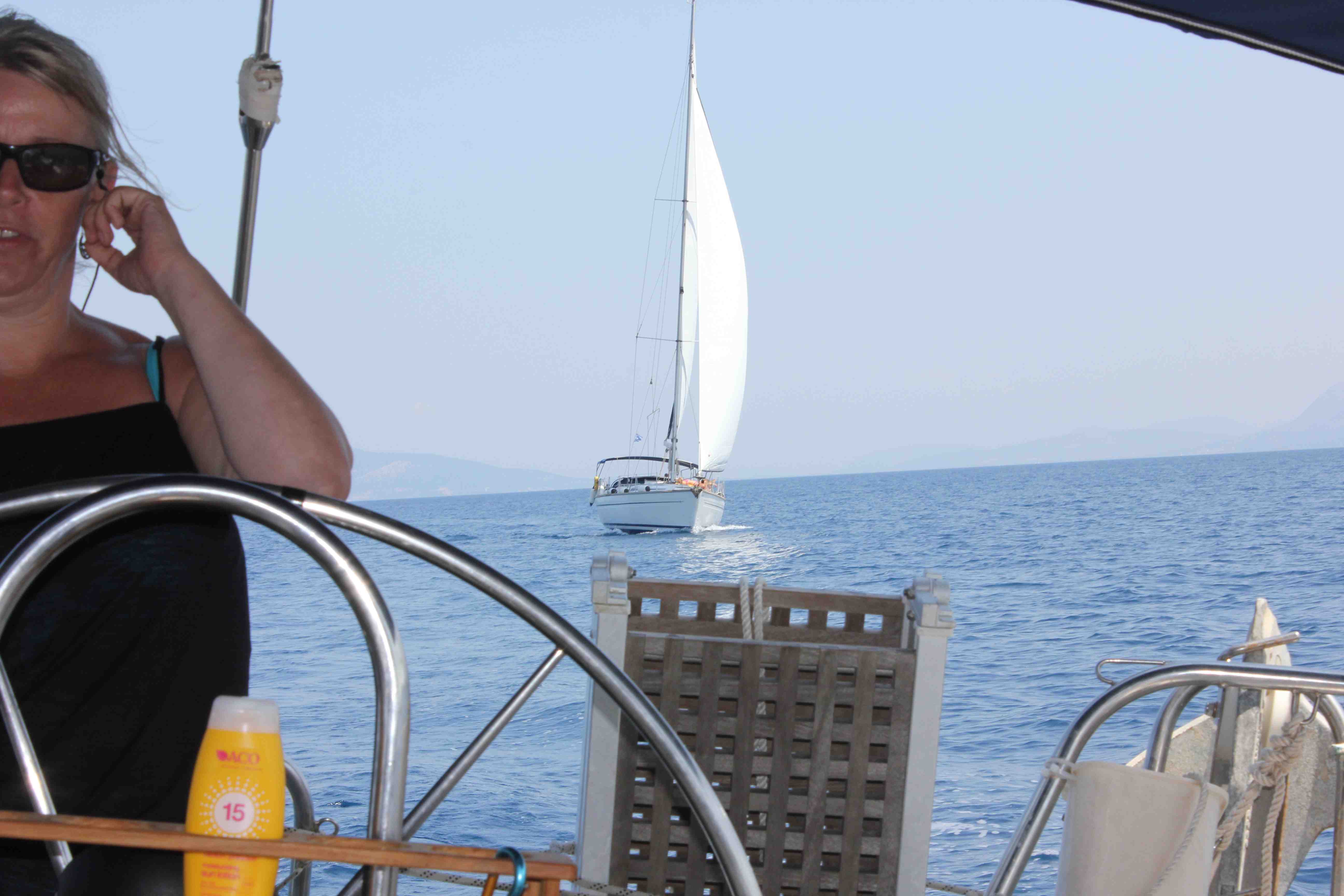 Vi kom iväg ganska sent efter att ha ätit frukost, slängt sopor, badat och pumpat gummibåten (med viss assistans av Paul – en holländsk levnadskonstnär som ”bor” i viken och har levt på båten med sin fru i 40 år). Vi började med ingen vind alls som efter ett par timmar blev till en ganska hård kryss på ca 8 m/s och vi loggade ca 7 knop. I slutet blev det motorgång i ganska gropig sjö som bidrog till viss sjösjuka. Vi angjorde Port Kalamos som var en lugn och stillsam hamn… Trodde vi… Vi åt lunch hos George, den inofficielle hamnkapten som tog emot oss när vi kom. Grabbarna gick tillbaka till båten och vi tog en promenad först uppför de branta gatorna mot centrum och kyrkan och sedan ner till stranden strax utanför byn. Fantastiskt vackert och vi hittade ett litet ”hippiecafe” där vi tog en espresso och tittade på utsikten. När vi kom tillbaka tog det inte lång stund innan det plötsligt började blåsa upp i den lilla viken. Det var kastvindar från de höga bergen runt om som ställde till det och trycket på ankaret ökade för varje minut. Till slut var det kulingvindar och vi var oroliga att ankaret skulle släppa. Killarna fick gå till George och äta middag på egen hand eftersom vi inte ville lämna båten. Vi vakade till ca 03.30 innan vinden mojnade, för att sedan öka igen och inte sluta förrän kl 07.00 på morgonen. En lång natt! Distans: 12,3 NM.