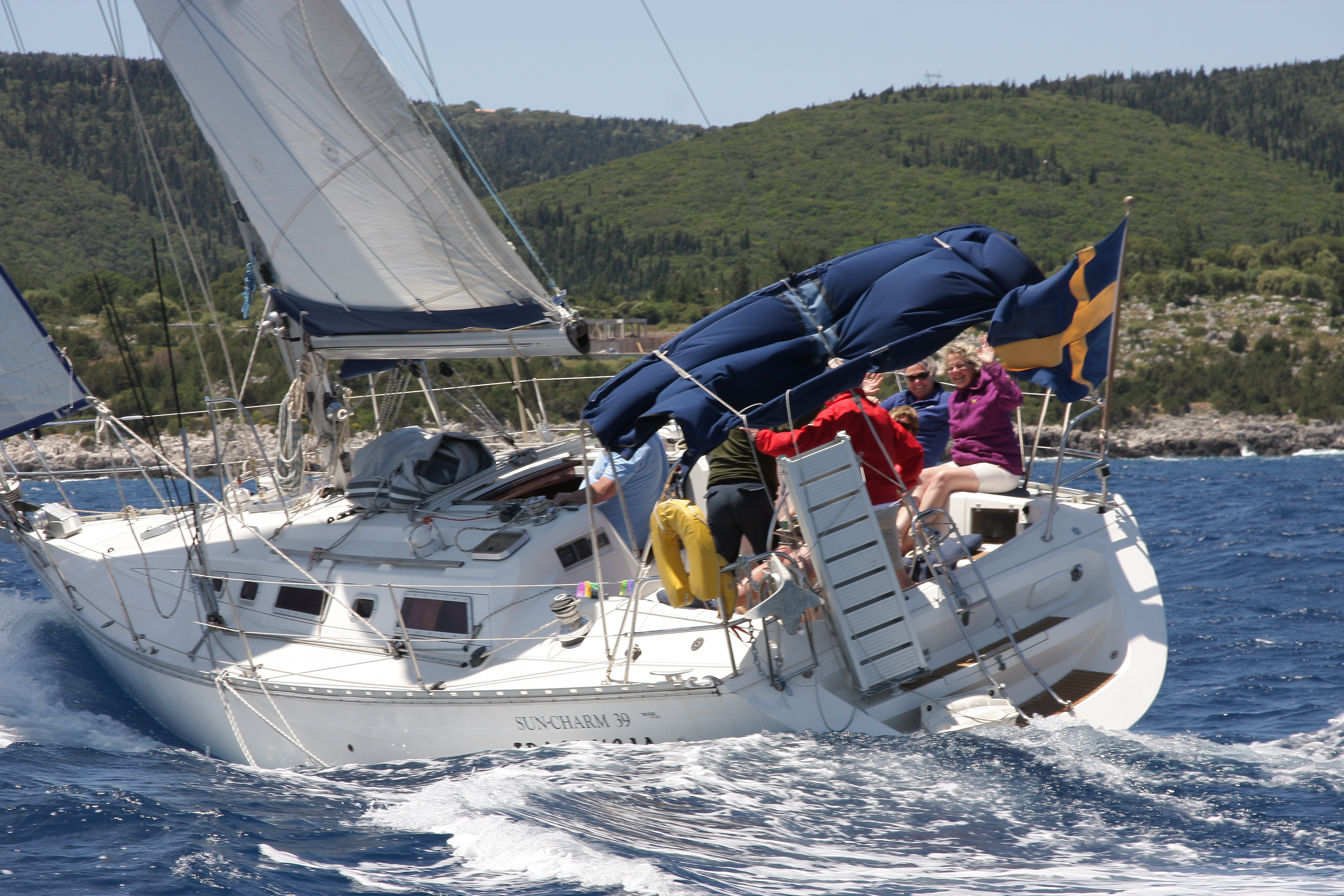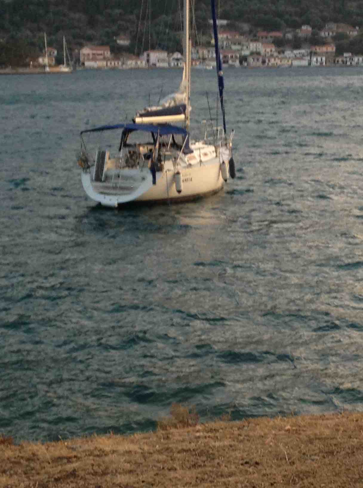Vi gav oss iväg efter frukost och ut på ett kav lugnt hav. Enligt väderleksrapporterna så skulle det inte blåsa så mycket idag och vi beslöt att gå söderut mot Kioni på Ithaka. Vi blev därför något förvånade när en stadig västanvind blåste upp på 10-12 m/s. Vi seglade med ganska lite segel och gjorde ändå bra fart. Så småningom kom vi fram till ön Atoko och ankrade upp i One-house-bay för att äta lite lunch och få lite lugn och ro en stund. Efter någon timme gav vi oss iväg igen och nu skulle vi rakt västerut mot Ithaka och Kioni. Det blåste lika intensivt som tidigare och det var flytvästar på, sjösjukepiller till Zack och stampa iväg. Efter 1,5 timme kom vi äntligen fram för att upptäcka att det var fullt! Det var bara att ge sig iväg söderut och ta sikte på Vahti på Ithaka denna gång. Vinden hade vridit till NV och vi fick därför en riktigt skön segling med en stadig vind på upp mot 15 m/s in bakifrån och loggade drygt 7 knop. När vi kommit in i viken mot Vathi och rundat klippan med kyrkan var det dags att rulla in seglet och starta motorn som då plötsligt inte ville starta! Här kom vi nu drivande in mot Vahti hamn med vinden bakifrån, som i och för sig mojnat något men fortfarande var på ca 10 m/s och kunde inte starta motorn. Katastrof!! För andra gången under denna semester. Katarina tog över rodret och Göran försökte desperat komma på vad felet kunde vara. Vi gjorde några tyskar uppmärksamma på vår belägenhet och de kom genast till vår assistans. Vi satte ihop de två segelbåtarna med tampar i fören och aktern, höll så när på att köra in i ytterligare en båt som låg på svaj. Vi missade den med ca 2 dm…. Efter lite trixande lyckades dem bogsera oss till en hyfsad lugn vik där vi kunde släppa ankaret och ligga på svaj. Efter ett tag fick vi tag på personalen på CYS som lovade komma och hjälpa oss i morgon bitti. Han försäkrade sig om att vi hade tillräckligt med vin ombord på båten och tipsade oss om en trevlig taverna. Vi tog honom på orden och lyckades efter visst besvär ta oss iland med gummibåten och tog en promenad i till stan för att äta middag. När middagen väl var uppäten så fick vi plötsligt syn på våra hjältar; de fem tyskarna som bogserat oss. Det blev ett kärt återseende och naturligtvis bjöd vi dem på ouzo som tack för hjälpen. Det blev avslutningsvis en väldigt trevlig kväll med mycket skratt.