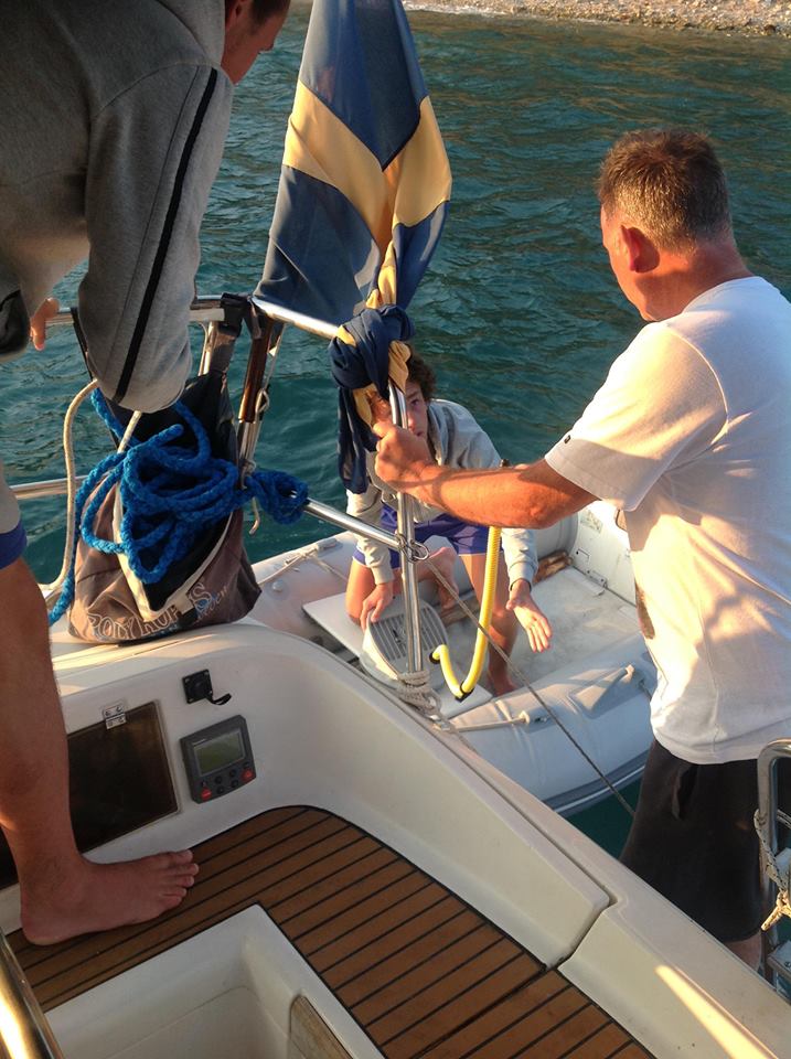 Efter ett uppfriskande morgonbad och frukost så bar det iväg igen. Vinden kom in rakt bakifrån och vi gjorde några försök att segla men det gick inte så bra. Det blev motorgång till Nidri. Vi hittade en plats ganska långt ut på kajen och släppte ankaret….. Alldeles för tidigt…. När vi väl kom fram till kajen så var kättingen plötsligt slut och bara ett tunt, slitet rep höll fast ankaret i båten (ja, samma tunna, slitna rep som i Sami när gaswiren gick sönder). Som vanligt fick vi trixa lite och lyckades få tillbaka kedjan på ankarspelet, gick ut igen och började om. Denna gång med ett bättre resultat. Killarna smet snabbt iväg till favoritstället; poolen. Göran gick iväg till ett internetcafe och Katarina läste ut sin bok (1Q84 av Haruki Murakami – rekommenderas). Lunch på stan och lite promenad. Sedan började det blåsa upp något och motorbåten som låg bredvid oss började sakta glida närmare oss och kajen. Till slut började den slå mot kajen och ingen var ombord. Vi hade noterat en ung grekisk kille som jobbade med hyrbåtarna, ombord på motorbåten tidigare under dagen och lyckades få tag på honom. Han kunde sträcka upp ankaret och se till att det blev marginal till kajen. Kvällen avslutades med middag hos Giorgio och Katarina. Distans: 6 NM.