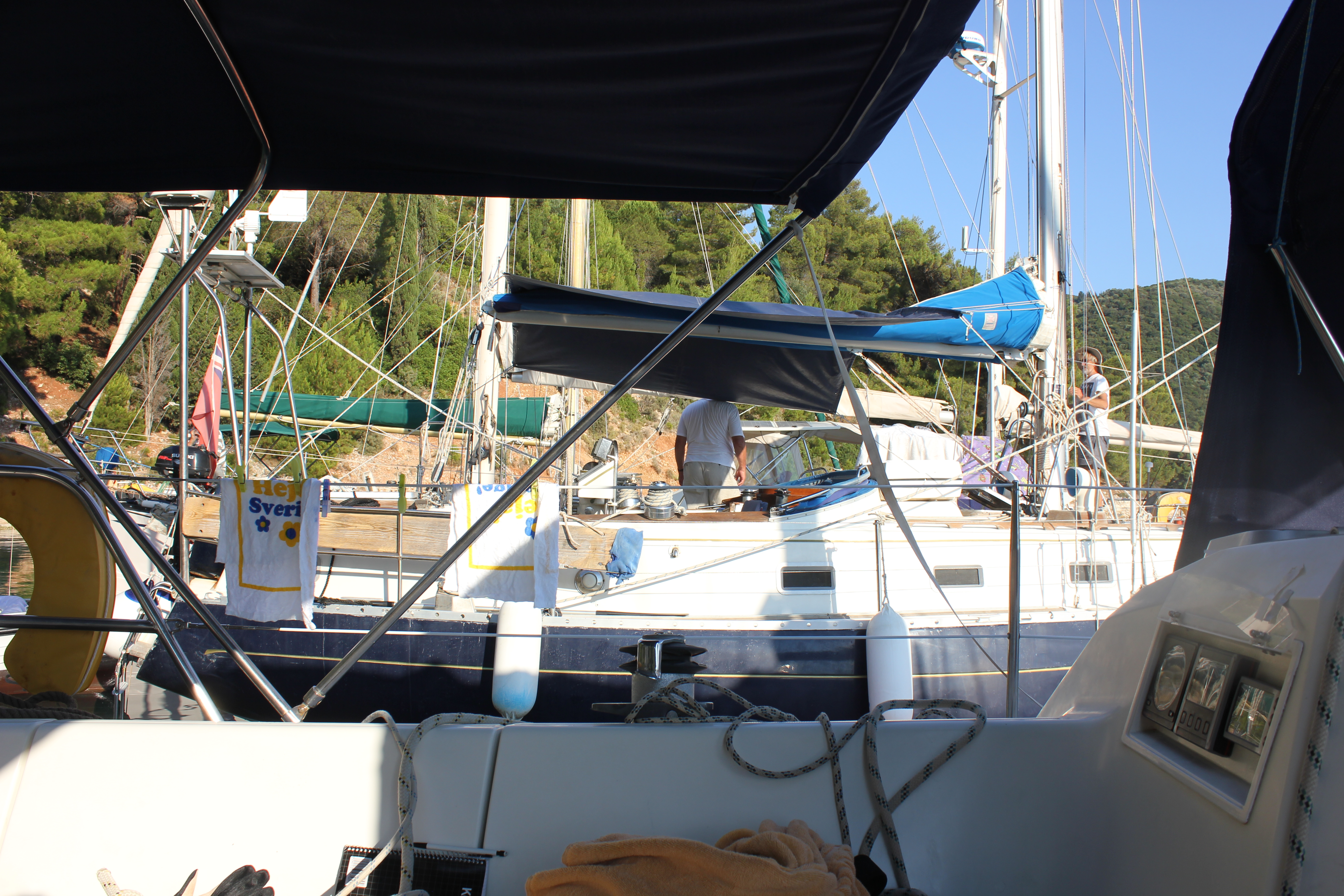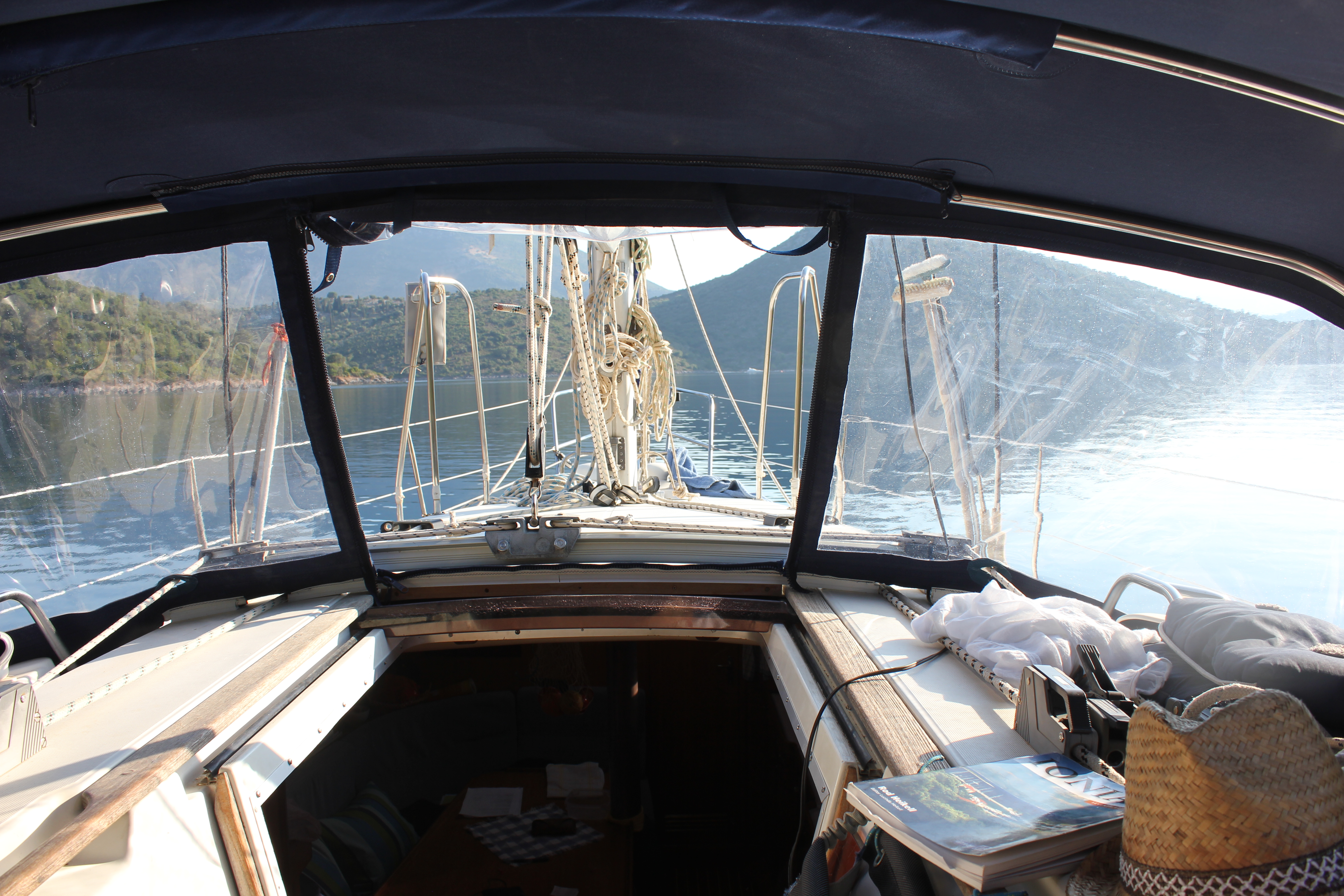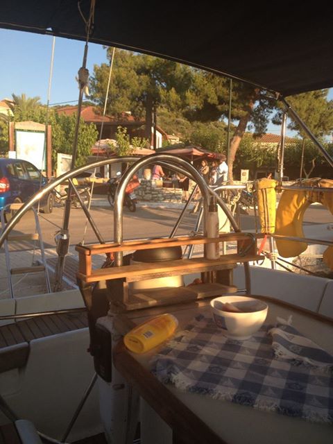 Till slut kunde vi ge oss av, kl 13.00. Hamnpolisen i Lefkas var inte nöjd med alla våra papper, men efter lite trixande och en välvillig försäkringstjänsteman på Åland, bar det iväg mot Onassis ö – Skorpio. Där fick vi möjlighet att testa ankarspelet och träna lite på att ankra och ligga på svaj. Ett par timmar med sol, bad och en lunch bestående av grekisk sallad i sittbrunn – skönt och välbehövligt! Sedan styrde vi kosan mot Vahti på Megannisi. På vägen hit fick också möjlighet att rulla ut förseglet och kunde segla en stund, i övrigt mycket motorgång. Strålande sol, 28 grader och ingen vind. Middag på mindre trevlig taverna. Avslutade dagen med levande ljus i sittbrunnen. Stämningen förhöjs ytterligare av spelande cikador och vågorna som mjukt rullar in mot klipporna. Distans: 11 nm.