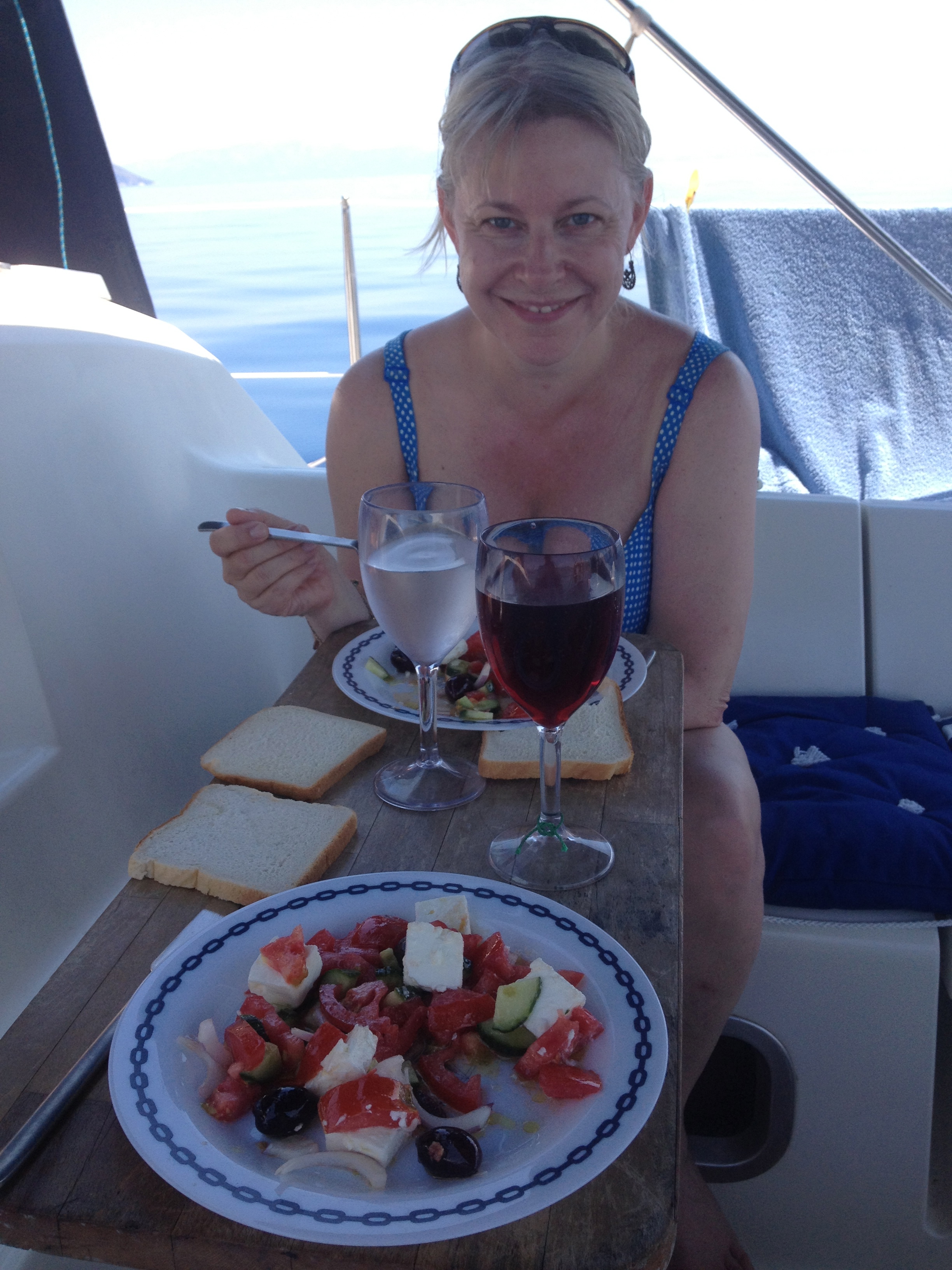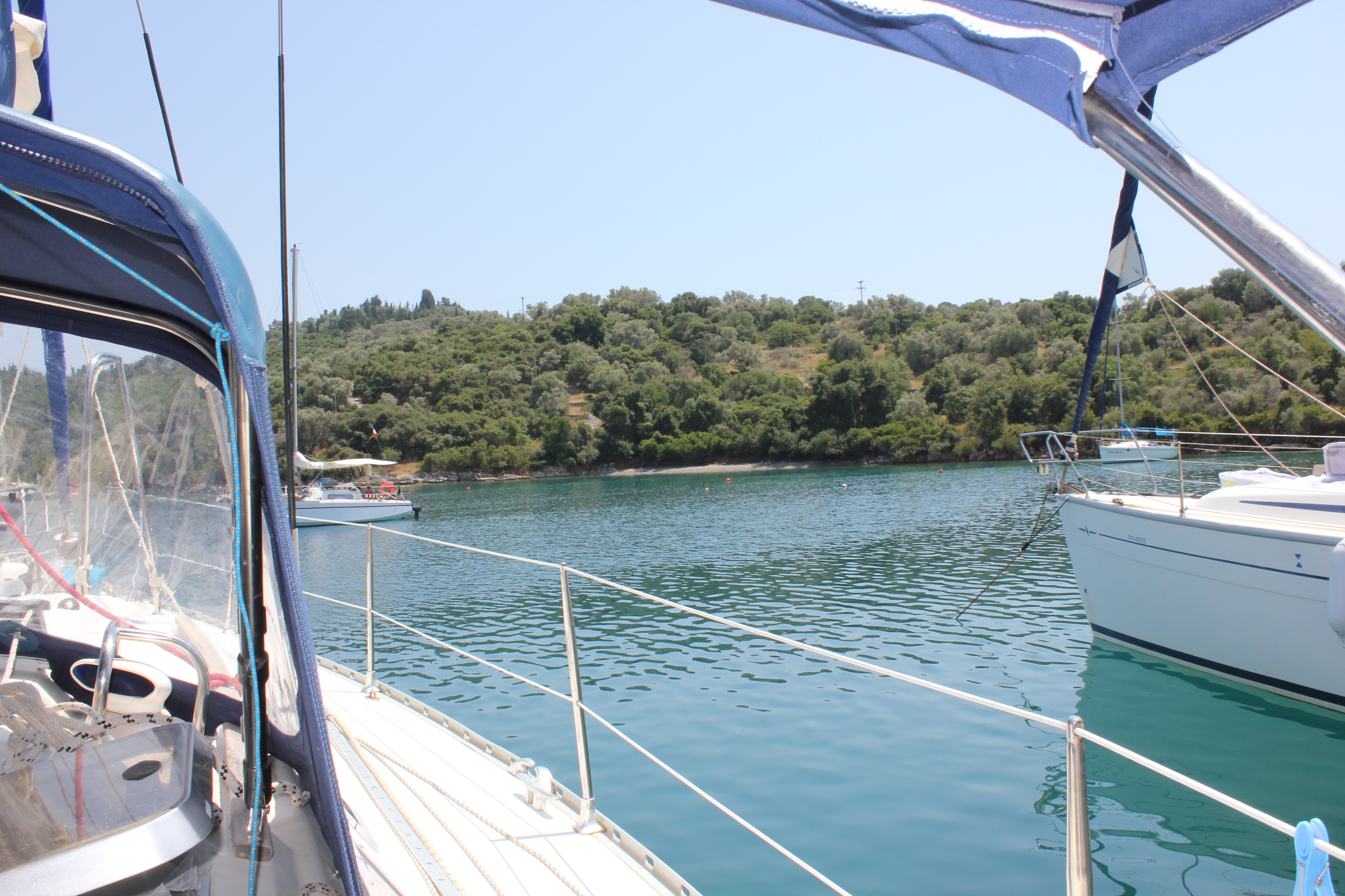 En extremt varm natt och mycket mygg gjorde att det blev dåligt med sömn. Pip fixade gaswiren medan vi handlade. Vi kom iväg efter lunch och styrde då mot Meganisi igen. Denna gång till en naturhamn på nordöstra sidan för att fira midsommar. Vi var framme vid 16-tiden i en fantastisk vacker vik med ganska många segelbåtar. Det blev lite bad och en kopp kaffe i den svenska grannbåten Birkabreeze hos Eva och Björn, innan det var dags för middag. Mästerkocken Göran gjorde en superb pasta carbonara som intogs med ett glas rött vin. Senare bjöd vi över grannarna på ett glas vin och midsommarkvällen innehöll både glada skratt och en och annan snapsvisa – precis som sig bör…. Avslutade med ett avsvalkande nakenbad i månskenet. Distans: 12,4 NM.