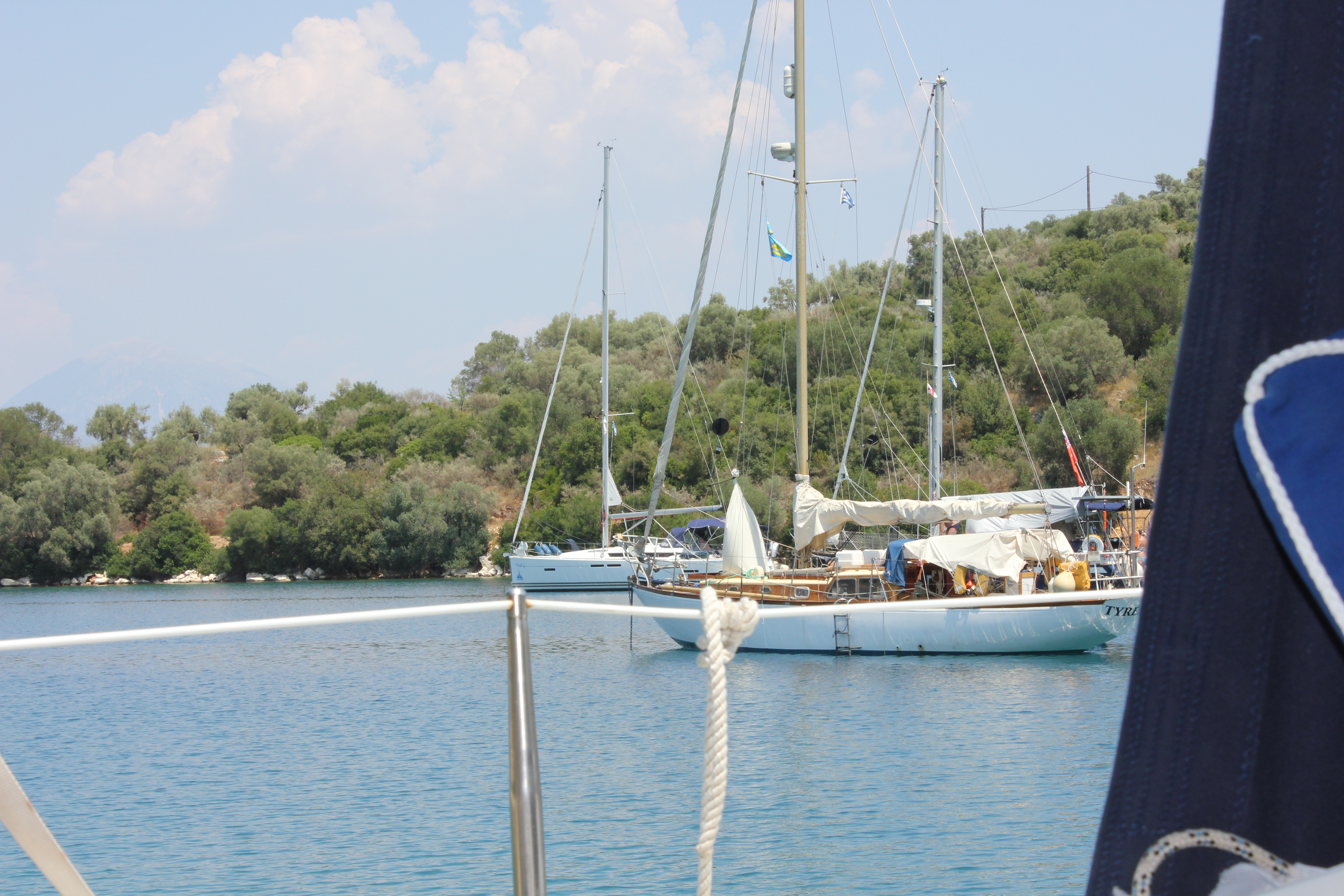 Vi steg upp tidigt och fick slutligen besked från CYS att försöka ta oss till Lefkas. Göran fixade en provisorisk gaswire bestående av en lång, tunn kabel som knöts fast på lämpligt ställe. För att öka eller minska gasen fick Katarina ner i ruffen och antingen dra åt eller släppa efter på kabeln. Göran lyckades få upp ankarkedjan, ankaret kunde tas upp och resan mot Lefkas påbörjas. Vi gick raka vägen för motor hela vägen eftersom vi hade motvind och fixade lunchen under färden – den sedvanliga grekiska salladen med bröd och tatziki. Framme i Lefkas ca 8 timmar senare. Under morgondagen ska wiren bytas och vi kan fortsätta vår semester. Middag inne i stan på en mindre grekisk restaurang (Madeleine: Göran åt kebab, vilket här är som avlånga, grillade köttfärsbiffar, jag åt kyckling som grillats på spett och tatziki. Till förrätt blev det en saganaki – friterad ost). Distans: 39,4 NM.