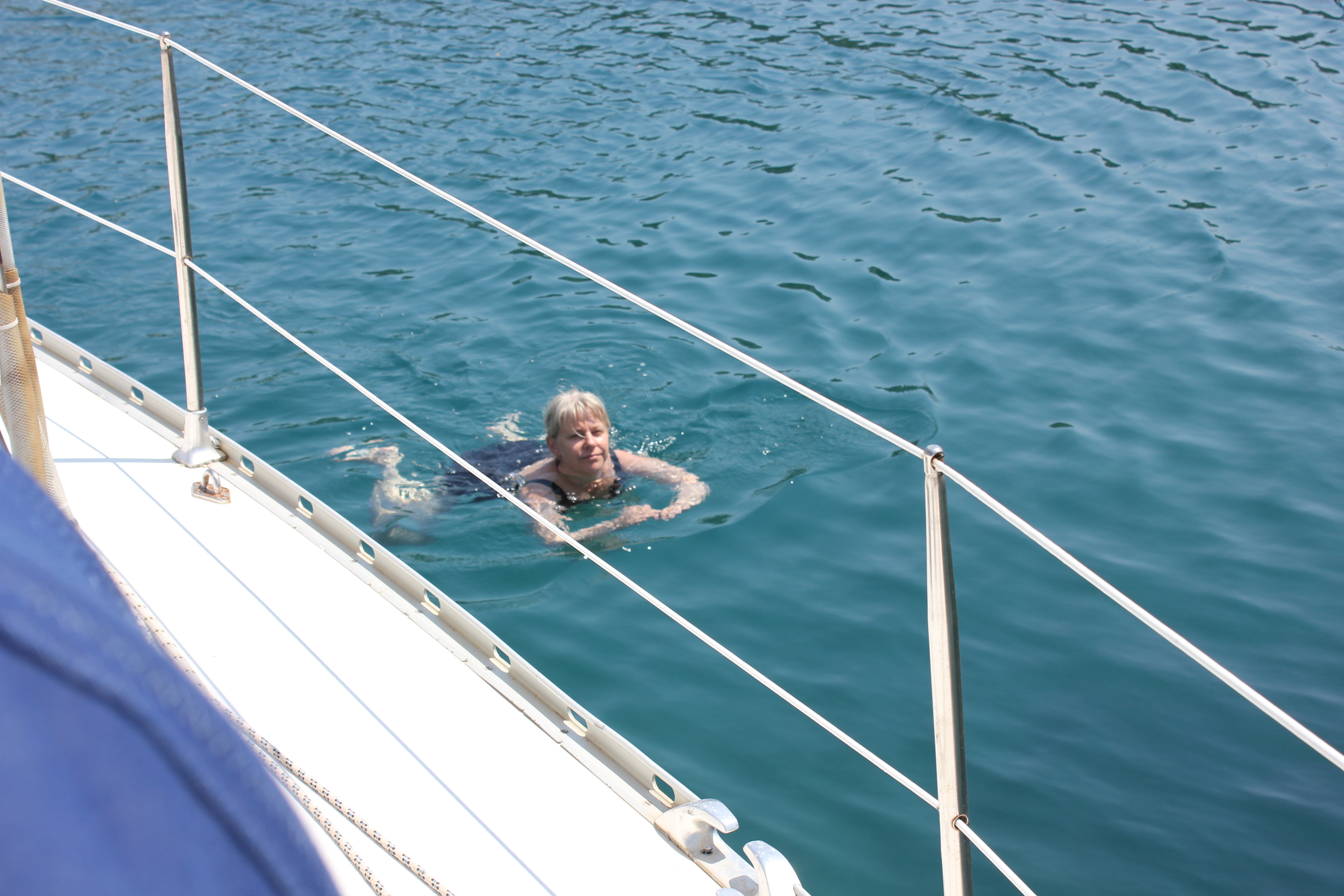 Vi beslutade att ligga kvar i denna sköna vik en natt extra. Dagen ägnades åt lite småplock på båten, tvättat, diskat, badat, fått på motorn på gummibåten, fått igång motorn på gummibåten, badat, läst också har vi badat. På kvällen tog vi gummibåten till land och åt middag på en trevlig restaurang. Vi delade ”broderligt” på en skaldjurssallad och en pasta med räkor som sköljdes ned med vitt vin – Mycket gott. Vi hamnade i samspråk med ett äldre engelskt par som var på seglingssemester i sin 48 fots holländska båt – Mycket trevligt. Avslutade en mycket skön dag med det obligatoriska nakenbadet i månskenet.