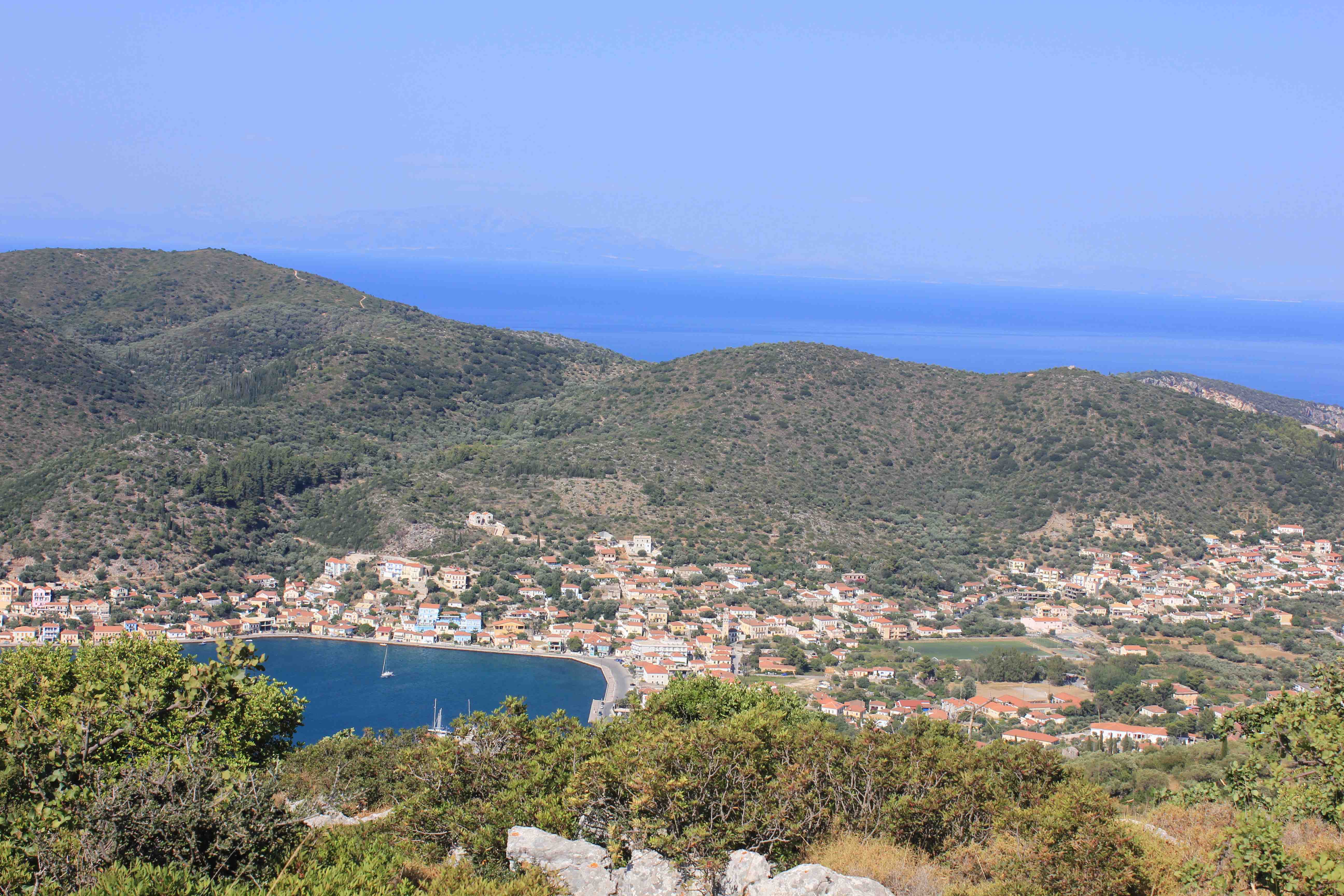 Eftersom det skulle blåsa ganska rejält idag beslöt vi oss för en extranatt i Vahti. Grabbarna steg upp tidigt och tog färjan till Nidri, som uppenbart blivit deras favoritställe här nere. Vi tog det lugnt på båten, tvättade och fixade med lite småpyssel. Vi tog en promenad till en närliggande by uppe i bergen och beundrade utsikten. Avslutade med en god middag bestående av pasta med räkor på en annan trevlig taverna. Vi kom lite i otakt med killarna som föredrog att gå lite senare och enbart äta lite lättare. En skön dag!