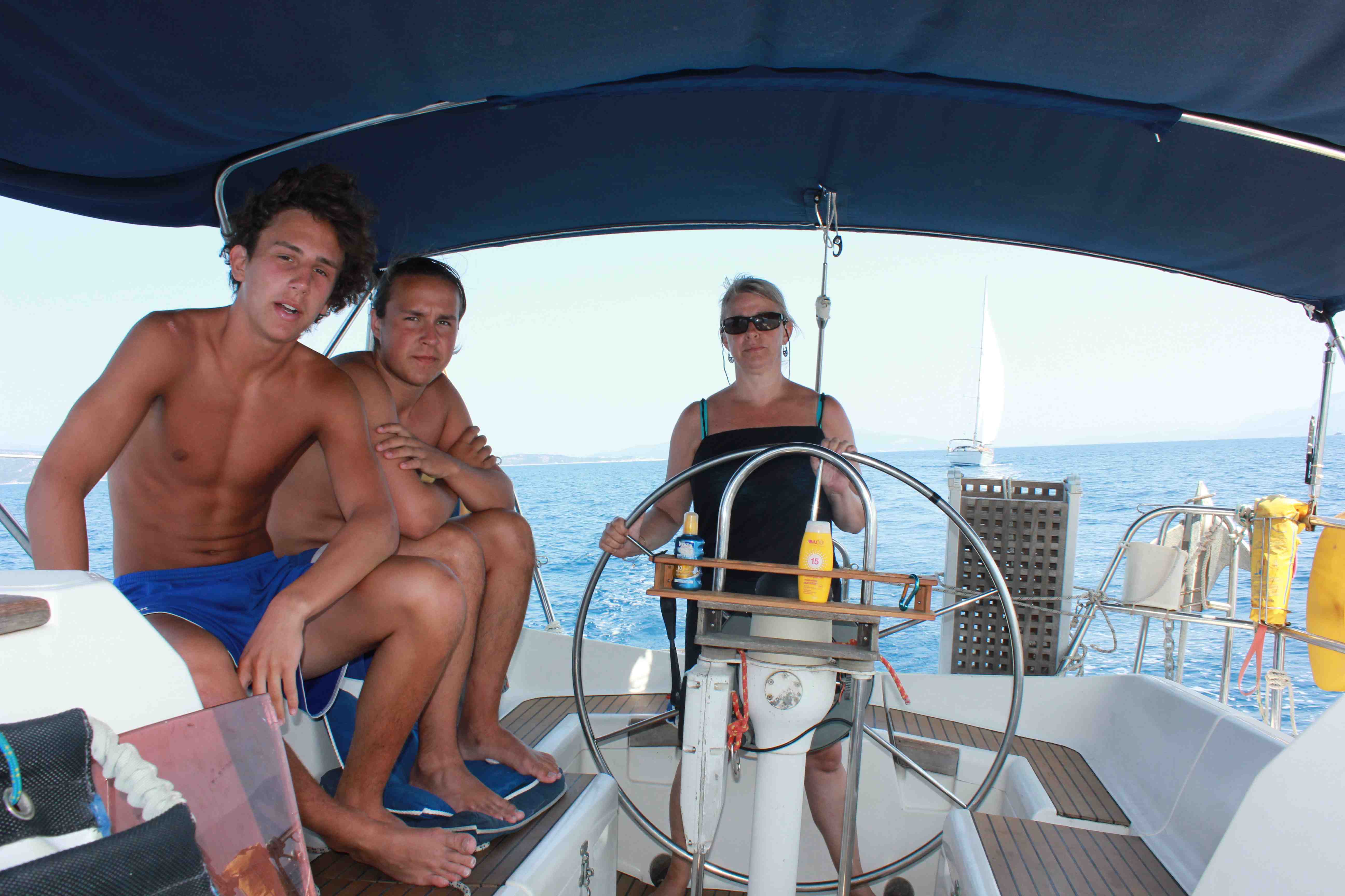 Efter att ha sovit ut, ätit en god frukost och killarna hann t.o.m. med ett bad i poolen gav vi oss iväg, försökte segla men bristen på vind gjorde att vi fick gå för motor. Vi hade tänkt bada en stund i den norra viken på Skorpio, men uppenbarligen är familjen Onassis hemma för den var avstängd och en båt patrullerade längs strandkanten för att köra bort alla båtar som närmade sig. Slängde istället i ankaret utanför grannön Skorpidio och badade en stund. Det blev en mycket kort tripp idag och vi gick till Ormos Abileke – där jag och Göran varit tidigare och fick plats bredvid en dansk båt med lina in mot land. Eftermiddagen ägnades åt bad och sol. Efter lunchen tog killarna gummibåten till land och en promenad till Vahti för att handla lite. Middagen bestod av pasta Carbonara som sköldens ner med vin och cola. Ett försök till kortspel misslyckades innan vi ens börjat och istället ägnades kvällen åt film. Distans: 5,4 NM.